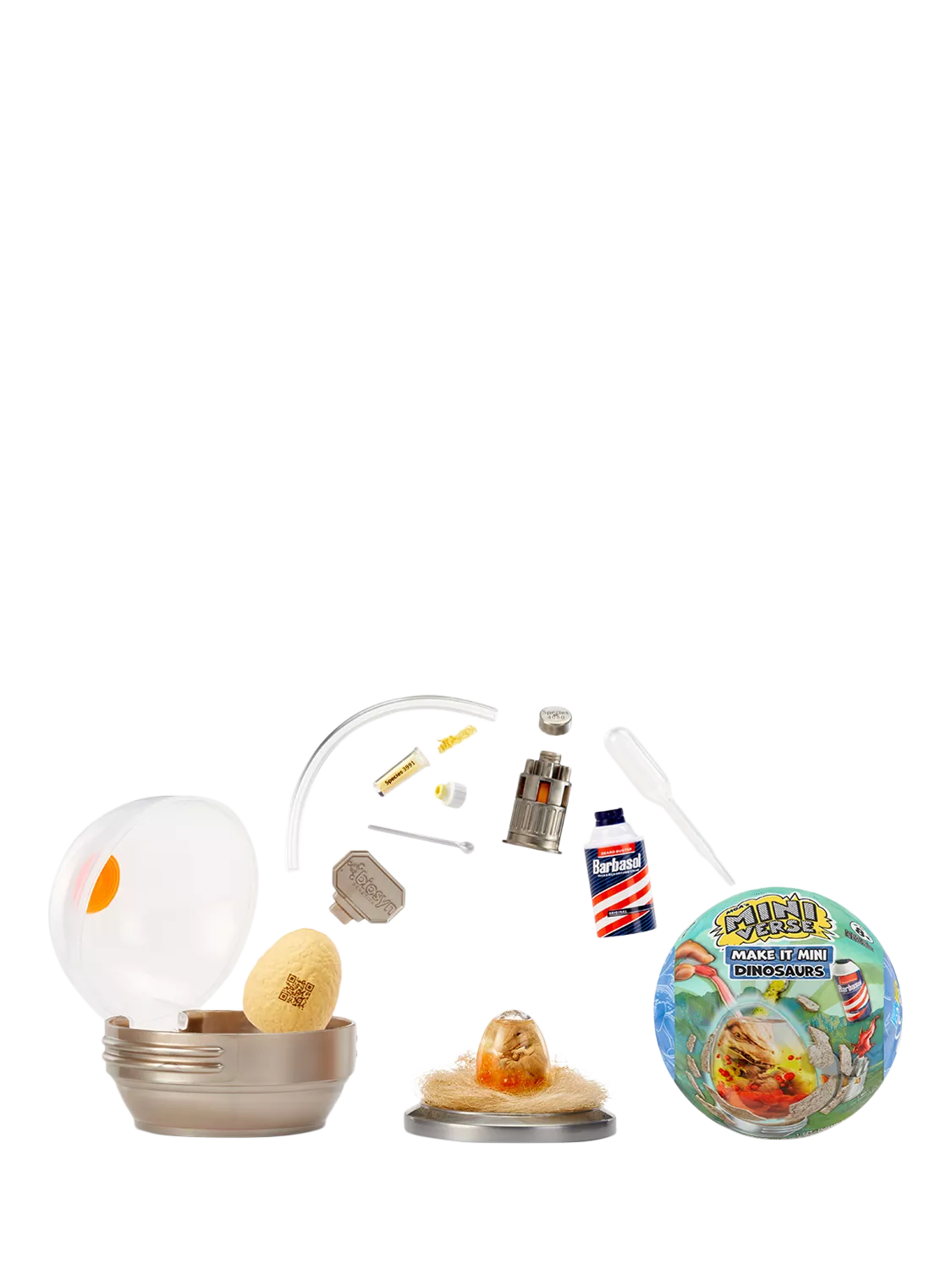 Use the included mini supplies and accessories to inject your egg or cylinder with DNA powder and liquid, bringing your baby dinosaur to life! Display your dinosaur in the capsule that transforms into an incubator.