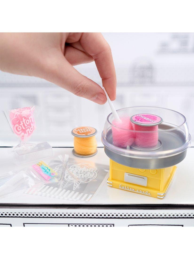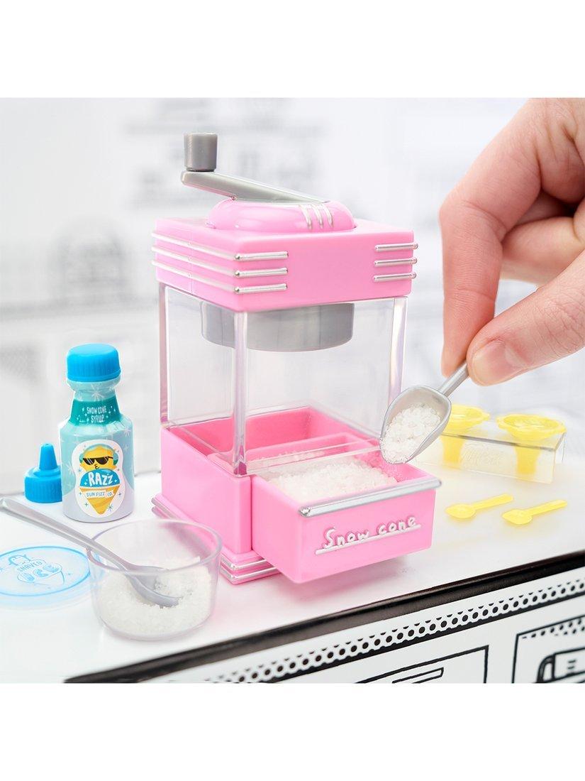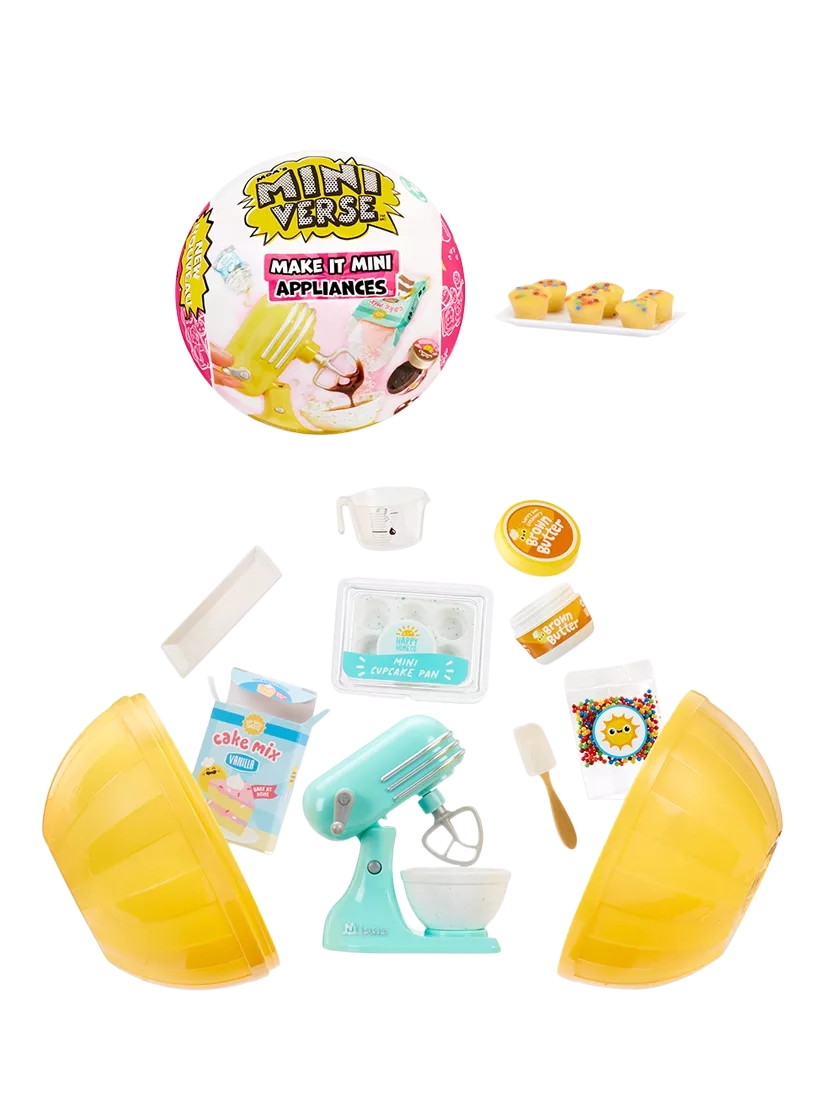 Open the ball to find a mini appliance plus accessories and ingredients to make a mini recipe! Each machine has unique, real working features. Crush 'ice' with your snow cone machine, mix 'batter' with your kitchen mixer, dispense ice cream, and twirl your cotton candy!