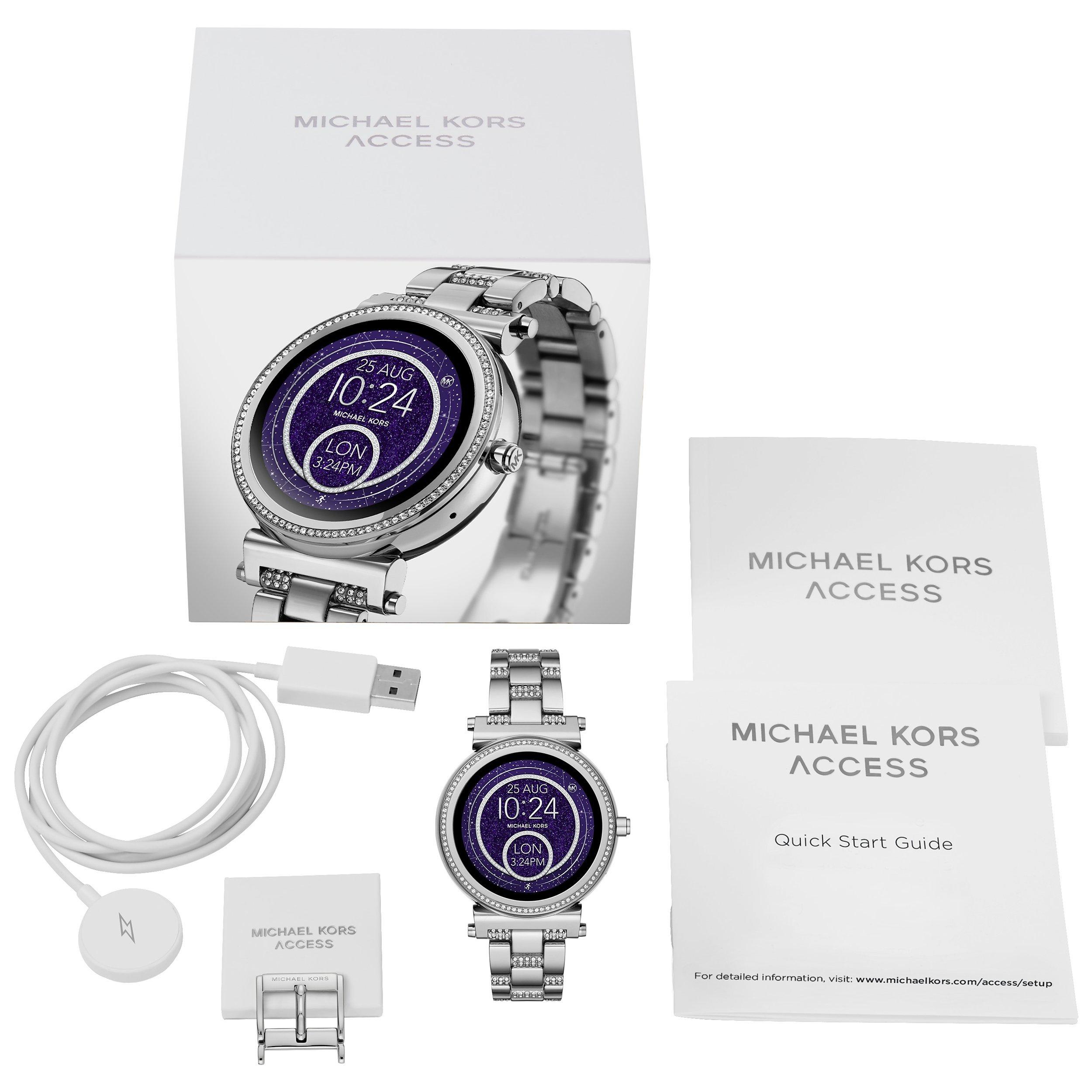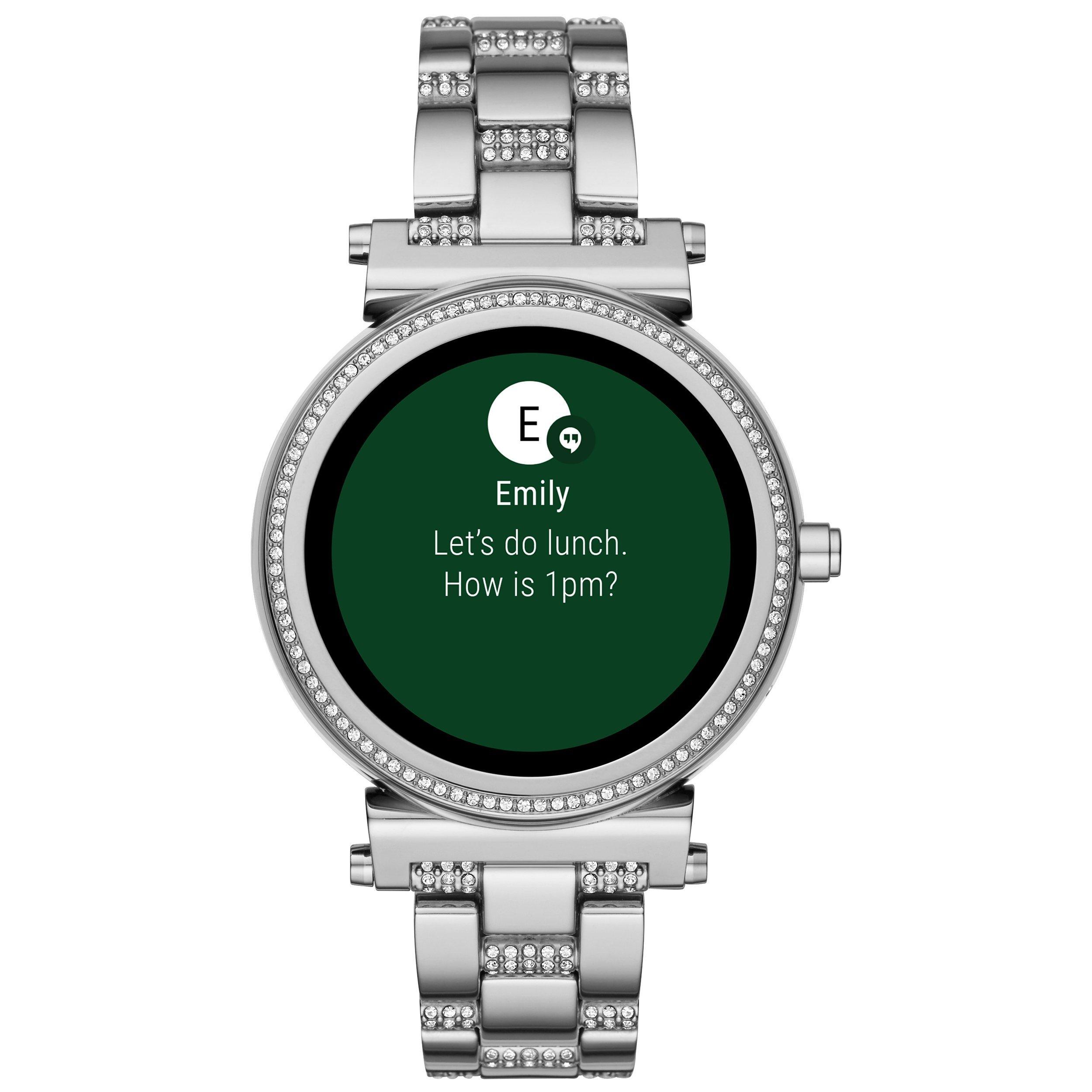 Powered by Android Wear™, the Michael Kors Access Sofie touchscreen smartwatch with full-round display and pavé crystal topring connects with your favourite apps and is compatible with iPhone® and Android™ devices. With built-in Google Assistant, you can use voice control to ask questions or give commands. Receive notifications, such as calls and alerts, all at a glance. Fully personalise your watch by changing the watch face and the straps to match your activity or look.