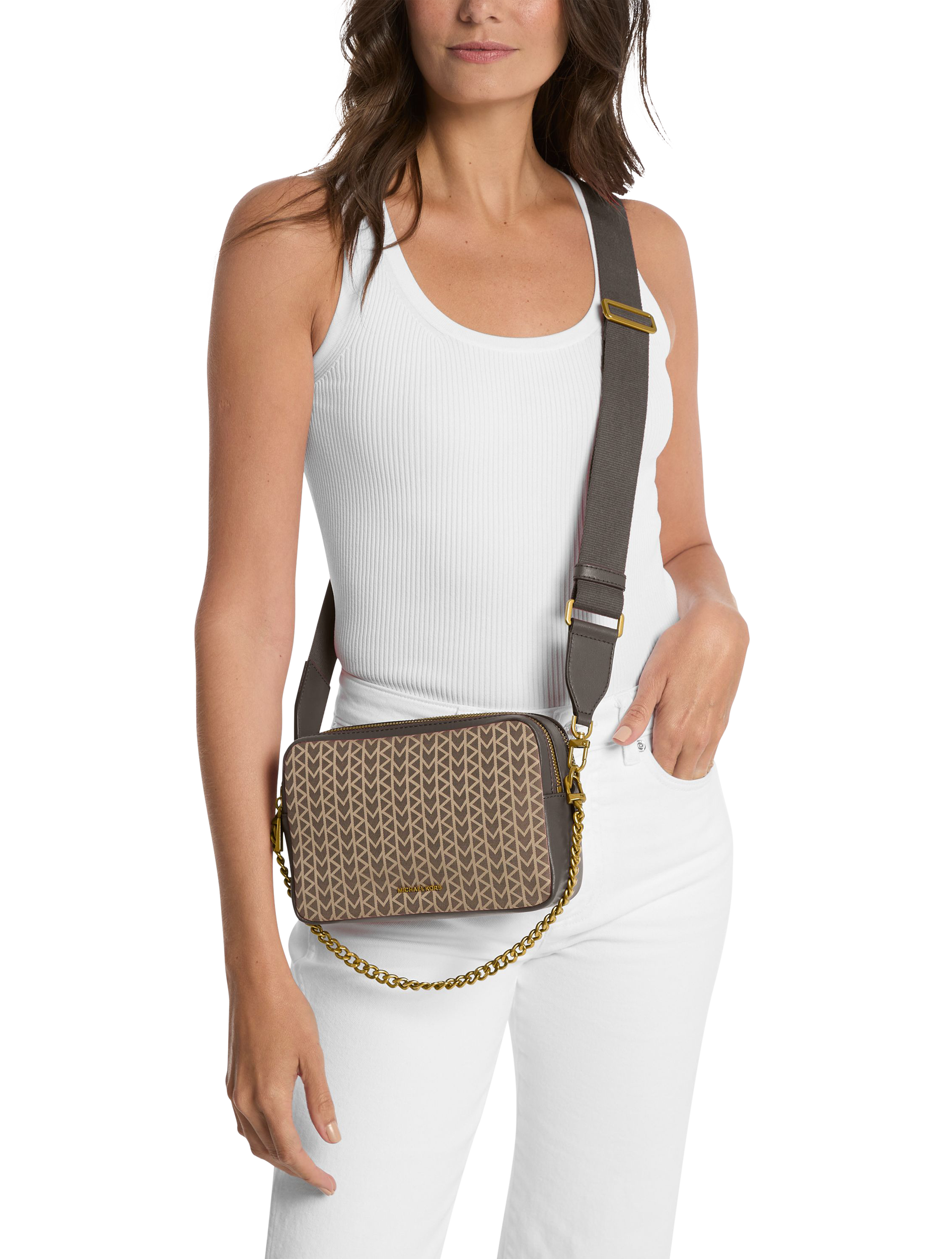The Bryant crossbody bag from Michael Kors strikes the perfect balance between sporty and sophisticated, with a streamlined shape topped with a webbed logo strap. A detachable chain-link top handle offers a touch of luxe and carrying versatility.