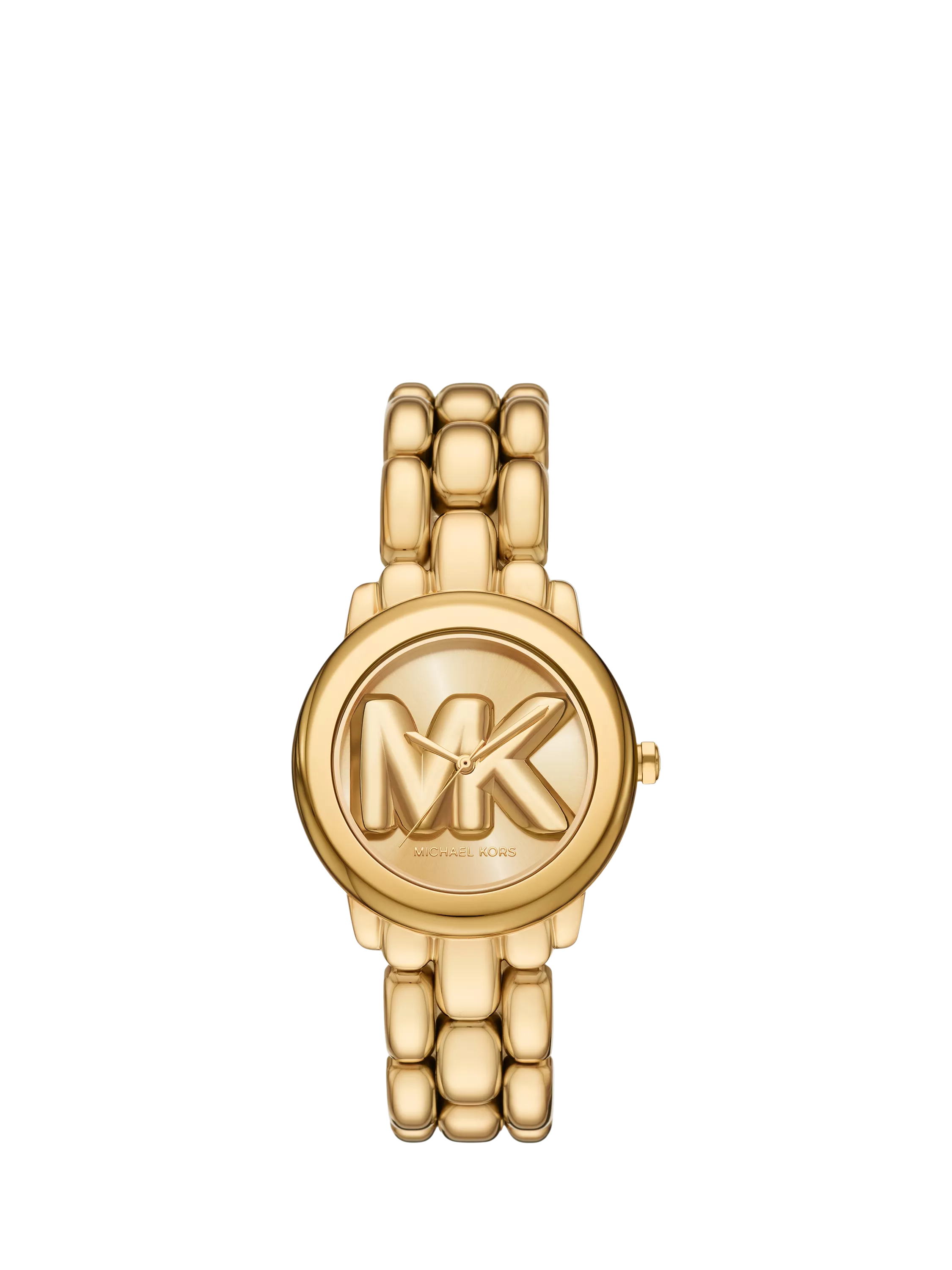 Defined by sculptural half-moon chain links, the Phoebe watch by Michael Kors offers a sleek yet playful approach to timekeeping. A newly designed rounded MK logo is seamlessly integrated into the 36mm dial, nodding to the Michael Kors Collection. Its gold-tone stainless steel finish enhances the statement-making design, delivering a perfect blend of modern glamour and iconic brand heritage.