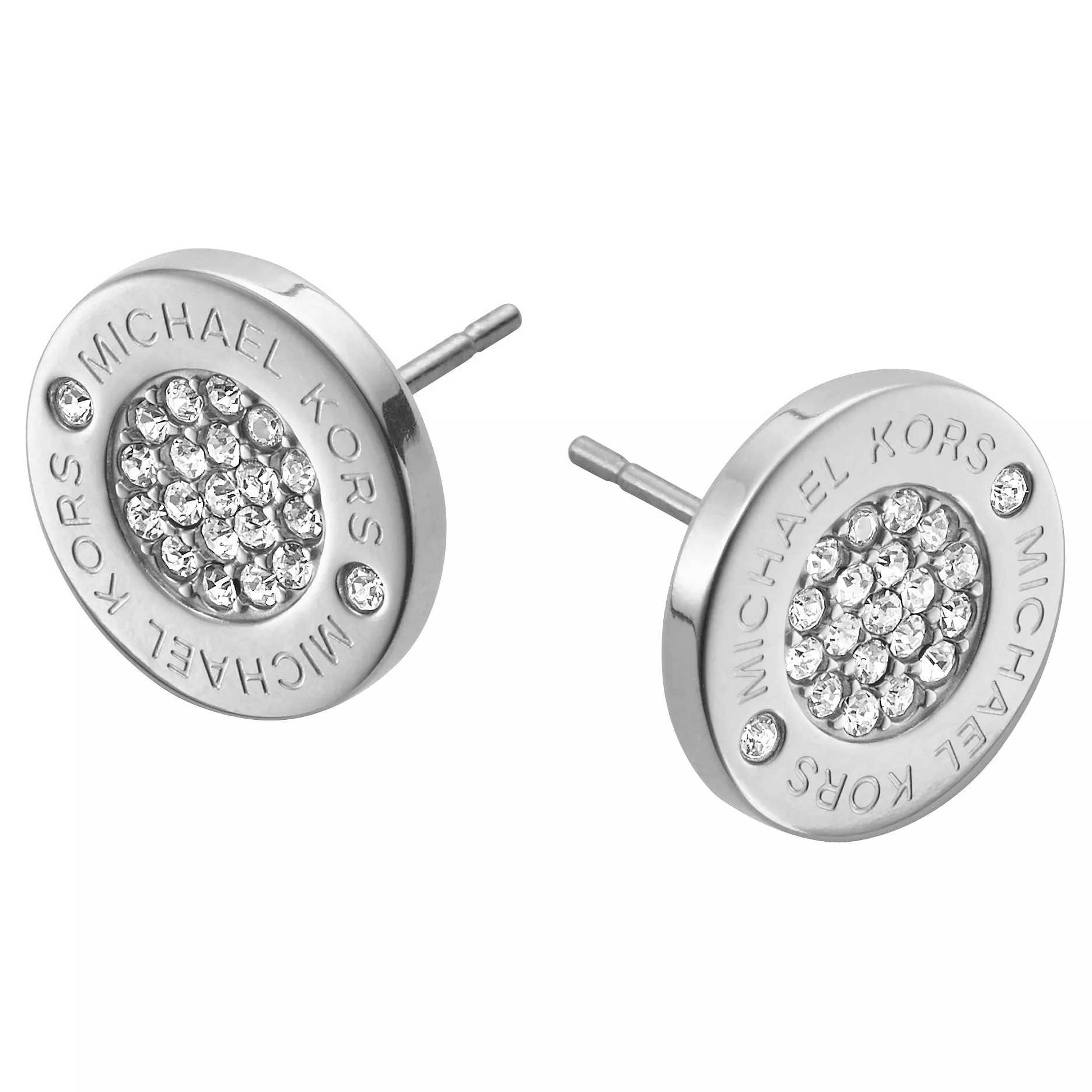 Glittering glass pave crystals adorn these Michael Kors earrings, with a round steel border in a polished silver toned finish. With post fittings.