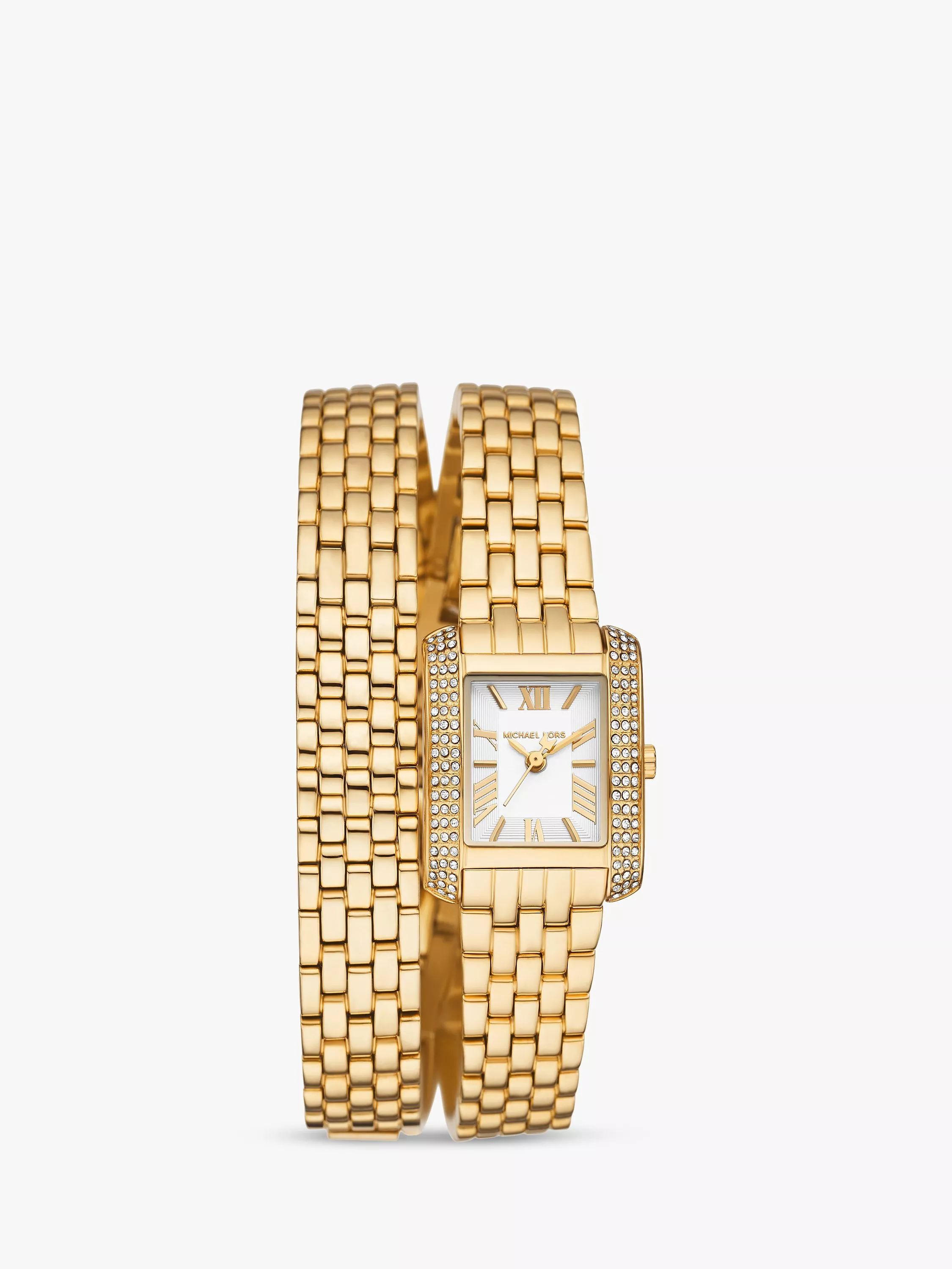 The Michael Kors' 22mm Emery watch features a white sunray dial, three-hand movement and a stainless steel double wrap bracelet strap. The face is elevated with crystal borders for a touch of sparkle.