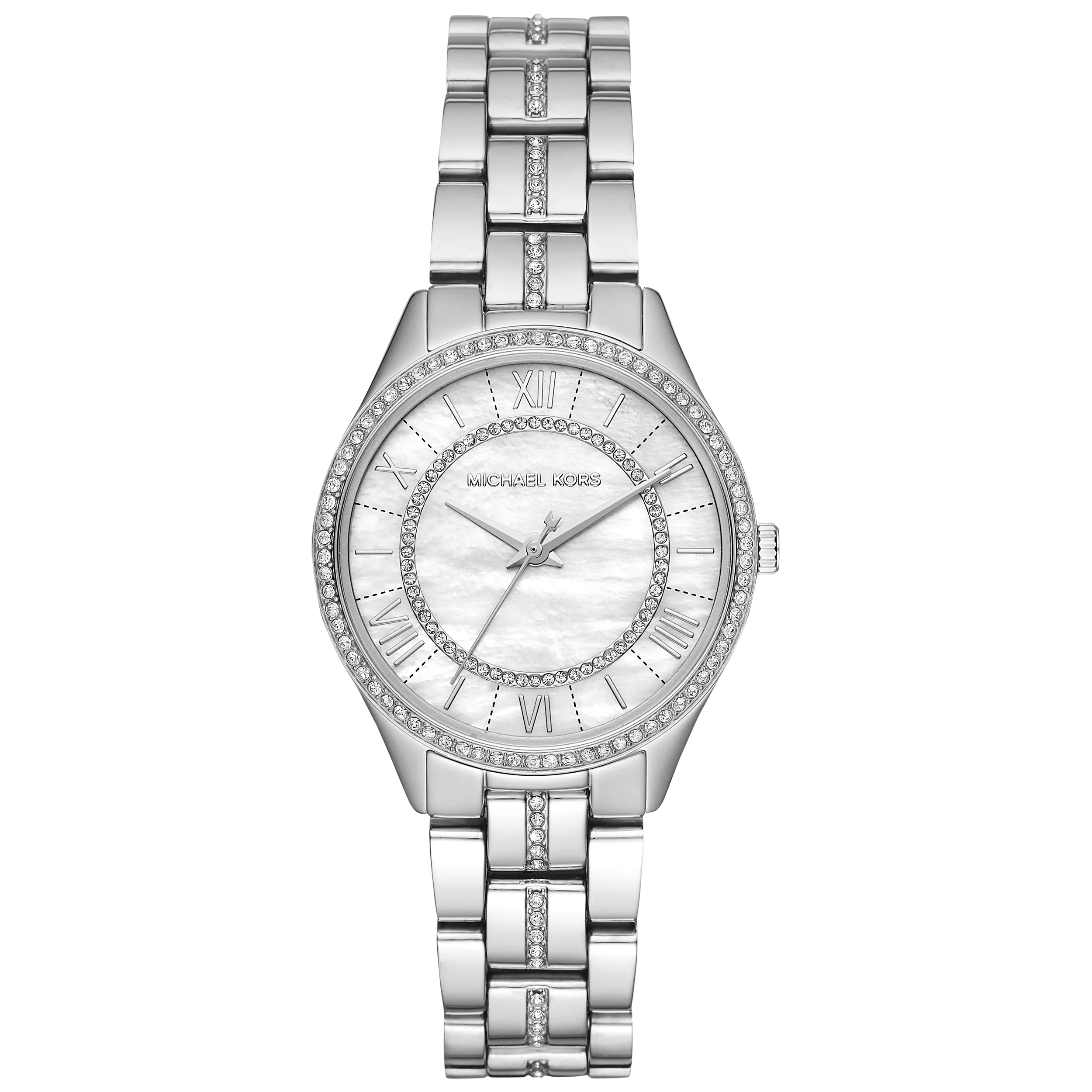 Embellished with multiple crystals, on the bezel, the strap and the dial, the watch will effortlessly stand out on your wrist. It features alternating index hour markers and Roman numerals, slim hands and a delicate mother-of-pearl dial.