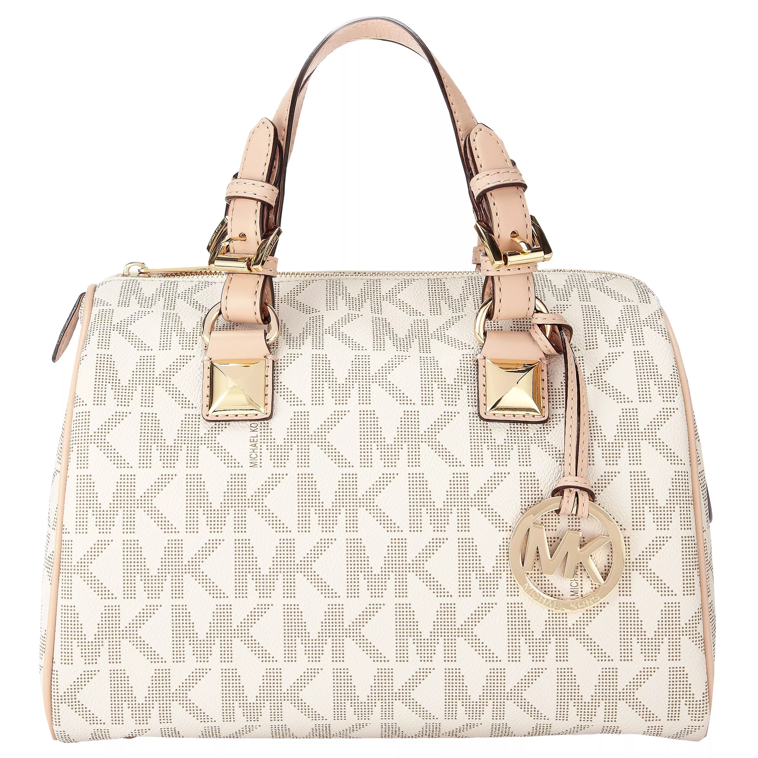 A cute satchel handbag with a striking Michael Kors MK print running throughout. Completed with golden hardware and a hanging medallion from one of the grab handles, which are completed with pyramid stud detailing. The main compartment is secured by a zip fastening and the inside holds a slip pocket and handy mobile phone pouch.