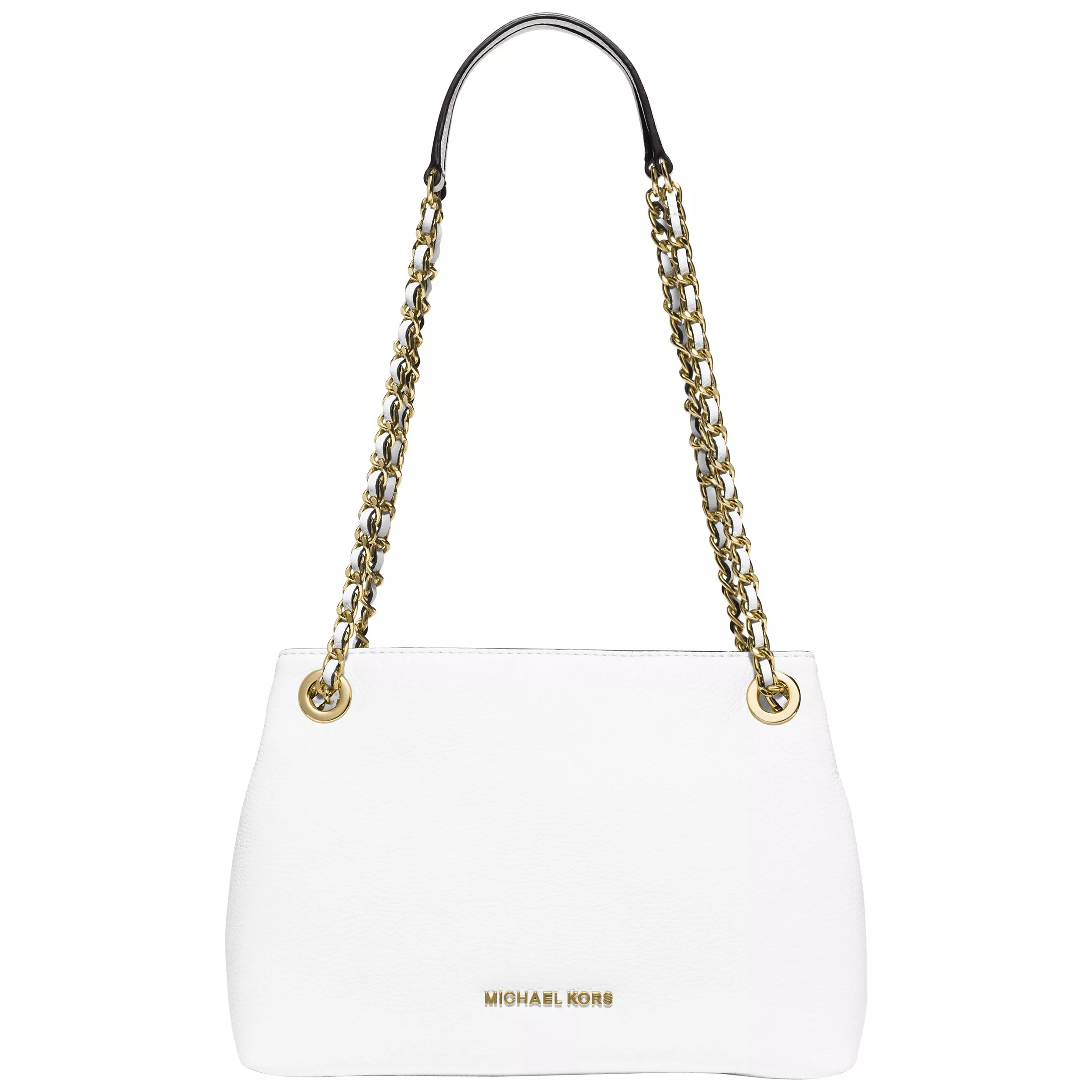This stunning messenger bag from the MICHAEL Michael Kors Jet Set range is elegantly modern in white leather with statement 18ct gold toned hardware, including beautiful chain detail on the strap.