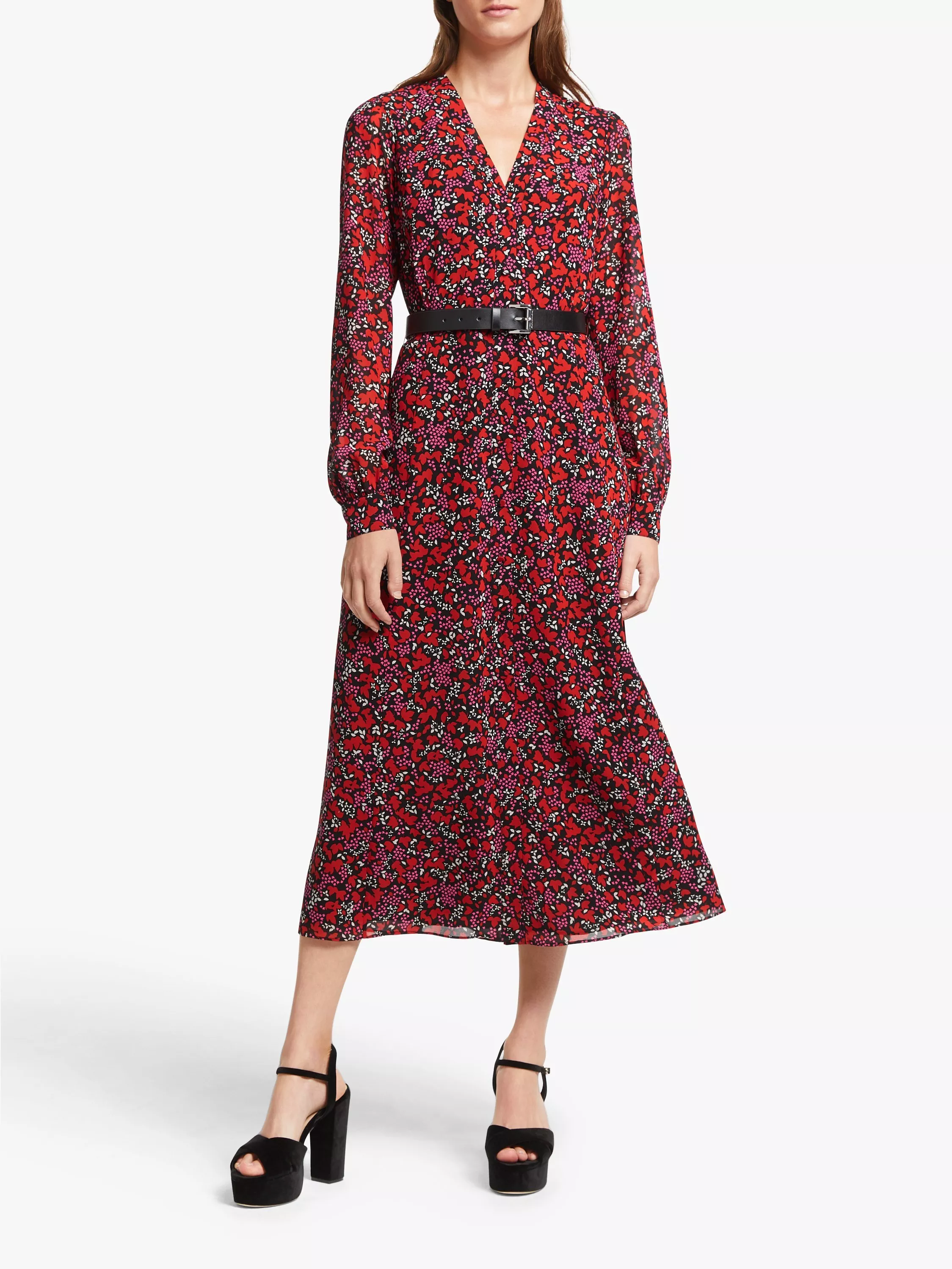 Featuring a bright ditsy floral print, this dress from MICHAEL Michael Kors lends a graceful spin to the classic shirt style with a soft midi length silhouette and simple collarless neckline. Pulling in the waist with a buckle belt, it is softly shaped with gathered sleeves and cuffs for a smart finishing touch. Wear with flats for weekend lunches or add a little glamour to your look pairing with sleek stiletto heels and sparkling jewellery on a night out.