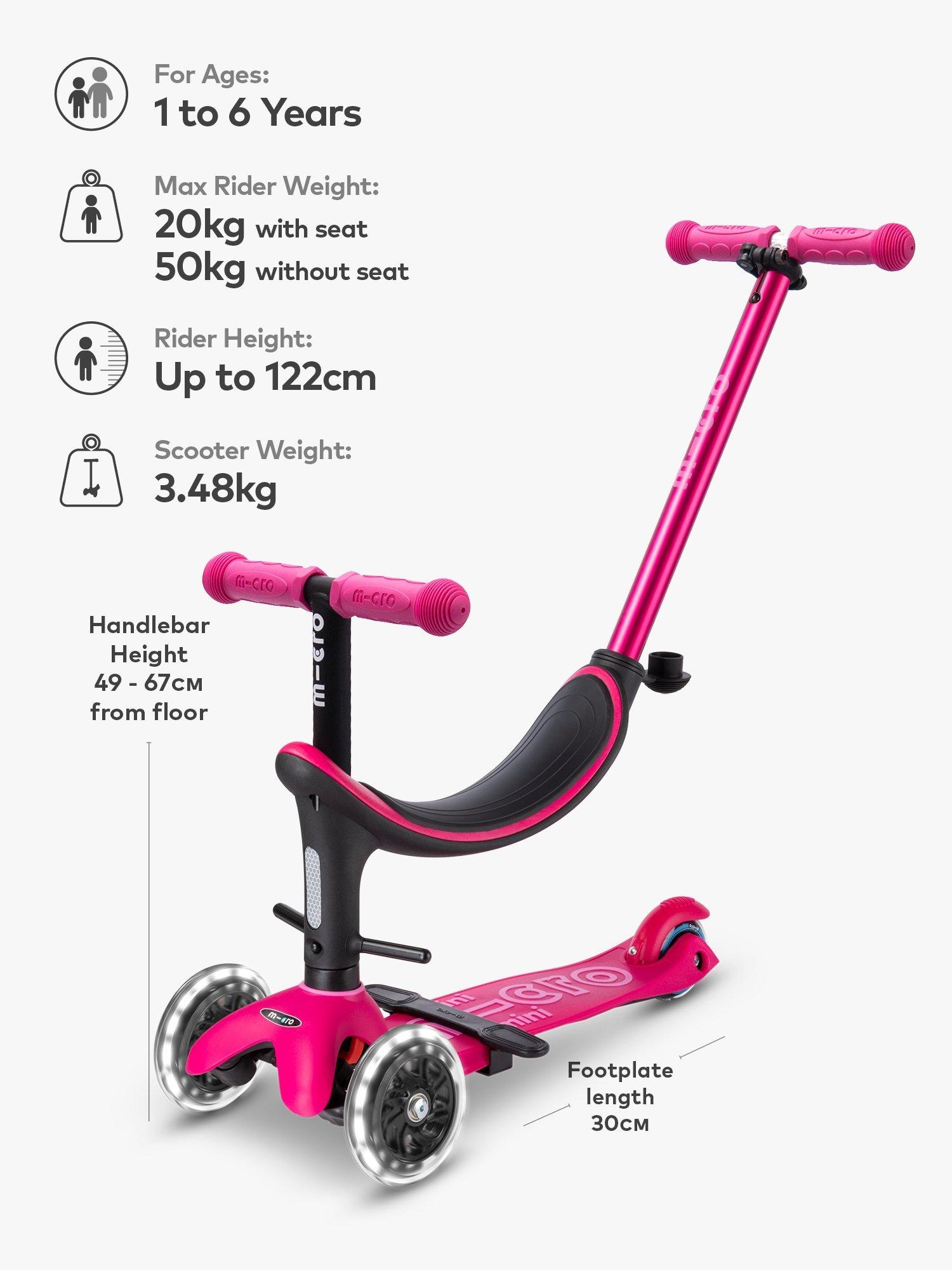 For ages 1 to 5 years, maximum rider weight: 20kgs with seat, 50kgs without seat. Scooter weight: 3.48kgs. Rider height up to 122cm.