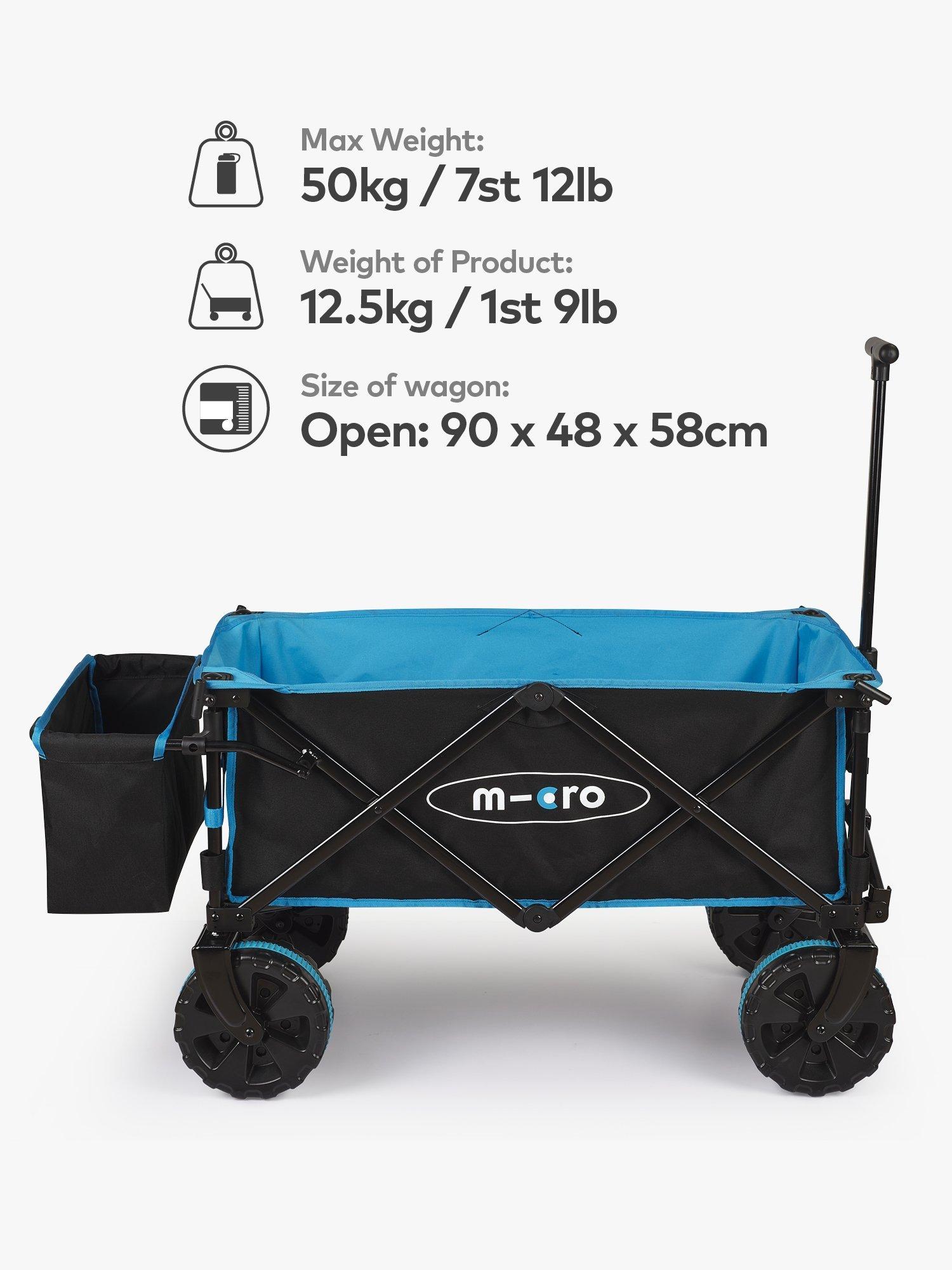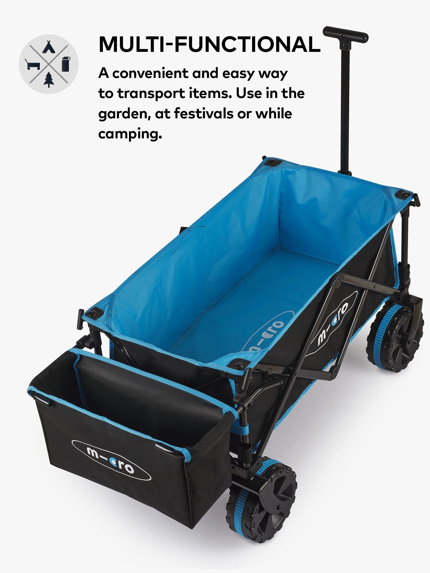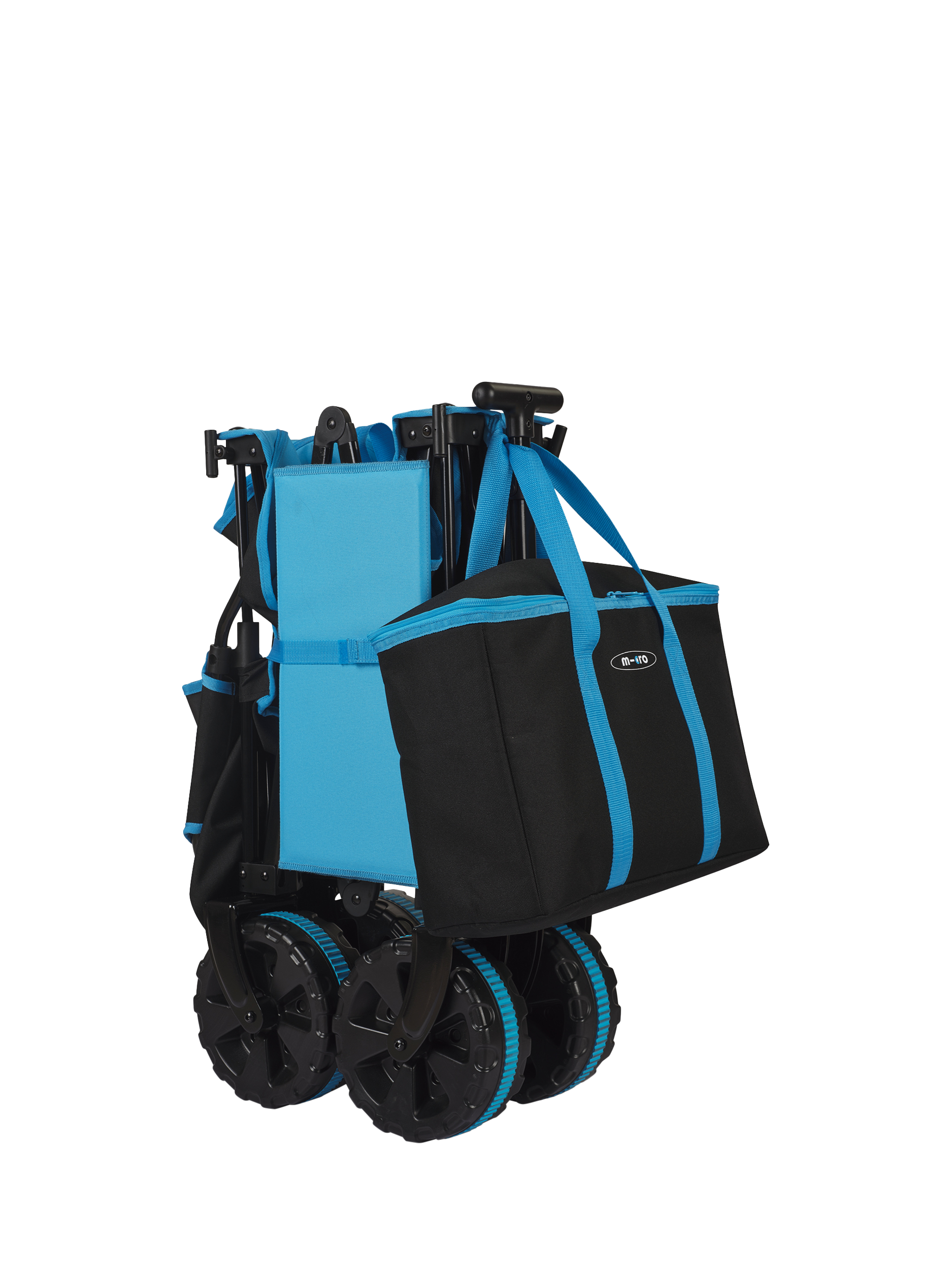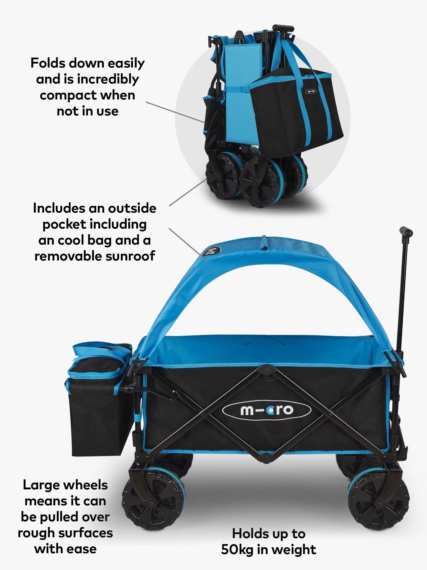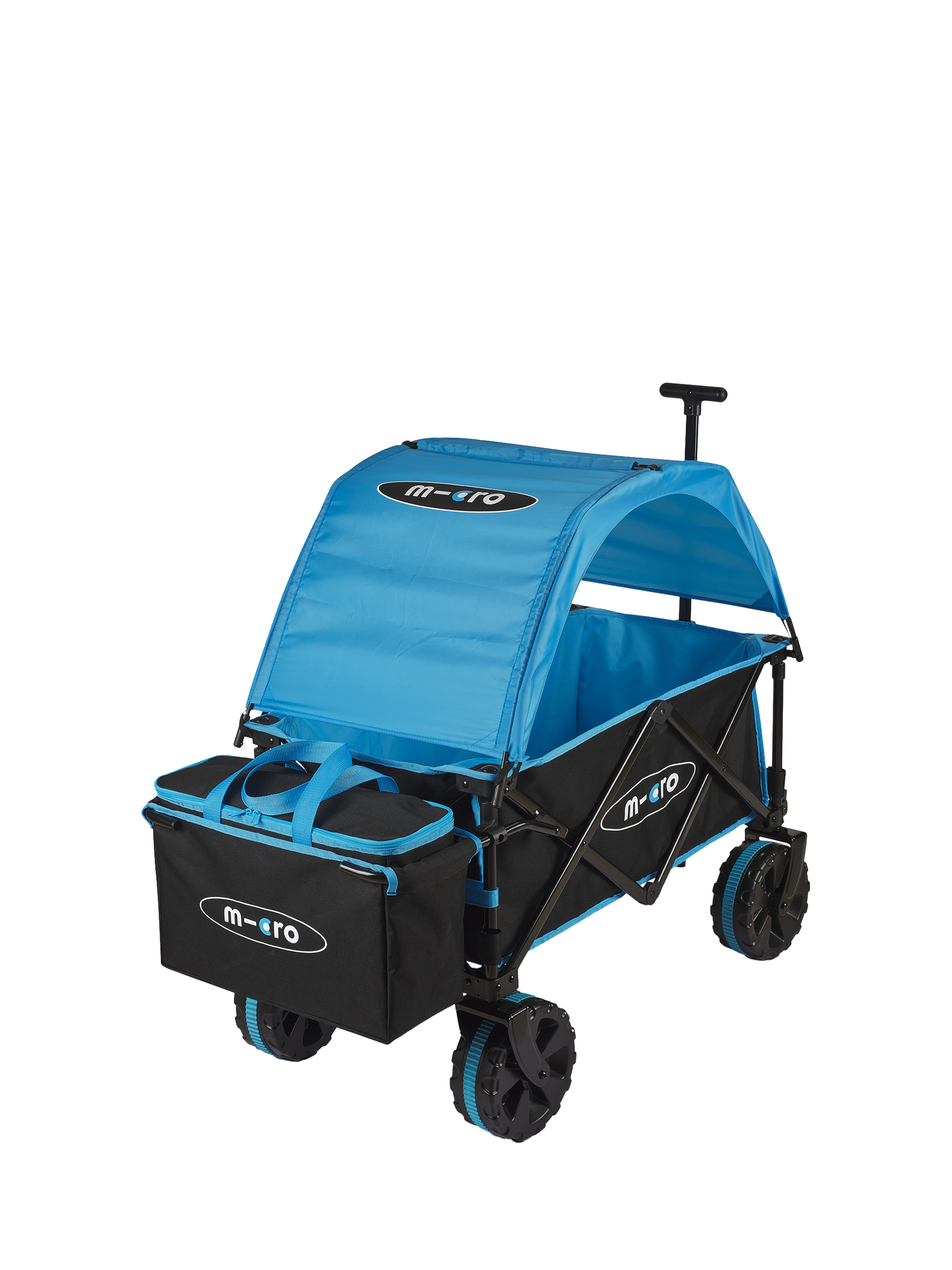 A true all rounder. For the best outdoor adventures. Whether you are festival going, family picnicking or working in the garden. Our super strong Wagon folds easily for storage with a protective cover. The height adjustable handlebar makes steering easier and 360-degree rotating front wheels allow for optimal manoeuvring, with 210mm PE wheels that roll smoothly and stable over gravel and paving stones. The Micro Wagon comes complete with a removable sunroof and a cool bag, so your snacks and drinks stay cool, even on warm summer days. The interior floor can be removed for easy cleaning.