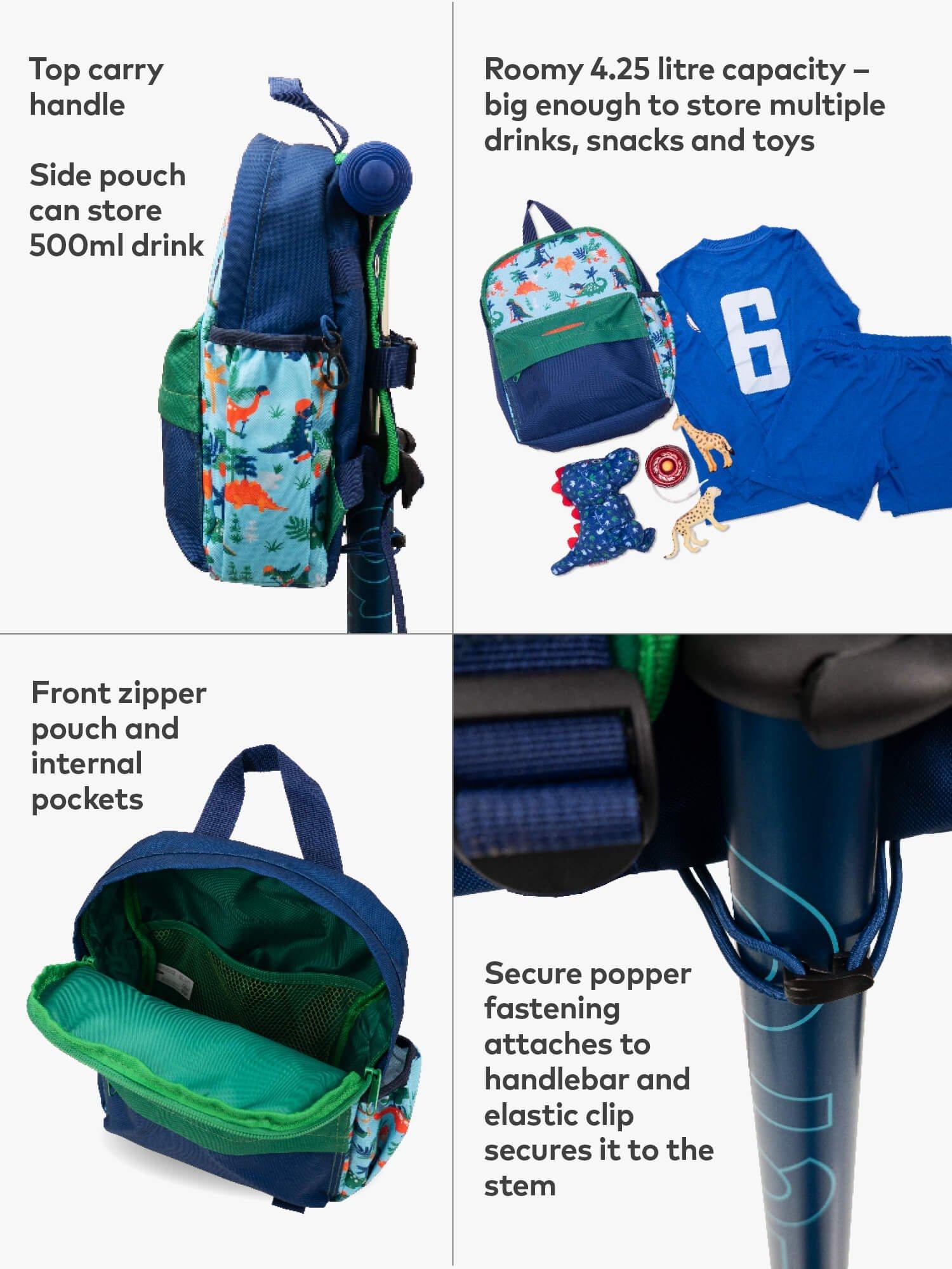 Made from rPet, a recycled polyester yarn created from plastic bottles, the backpack attaches to all Mini, Maxi, Sprite and Cruiser scooters via secure poppers. The backpack is fully lined and includes a drinks pouch on the side, one spacious main compartment with secure zip fastening and one front zipped pocket. Fully adjustable straps, a keyring hook, and secure back strap ensures the backpack is comfortable and practical to wear.