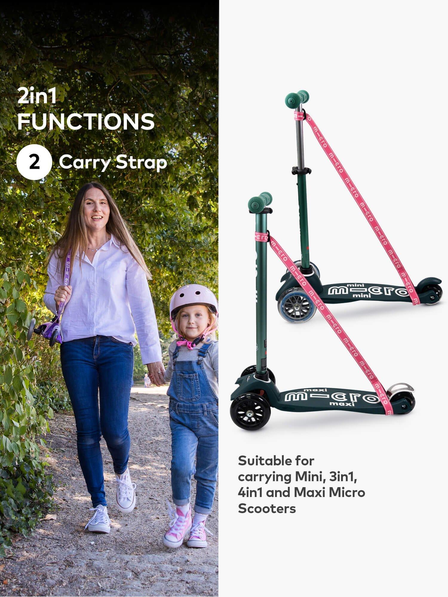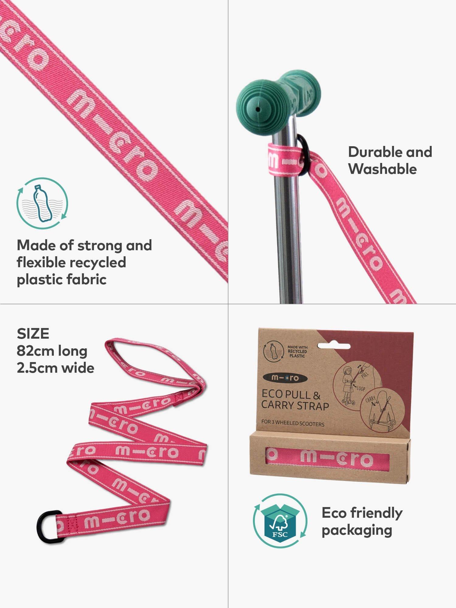 Scooting can be tiring work for little legs. The Micro Eco Pull & Carry makes getting tired toddlers home a breeze. Simply loop around the handlebars of the scooter and pull them along. A great way of helping to build confidence in younger riders - gently pull them along so they get used to scooting. Also doubles as a carry strap for Mini, Mini 2 Grow & Maxi Micro scooters. Made from recycled polyethylene.