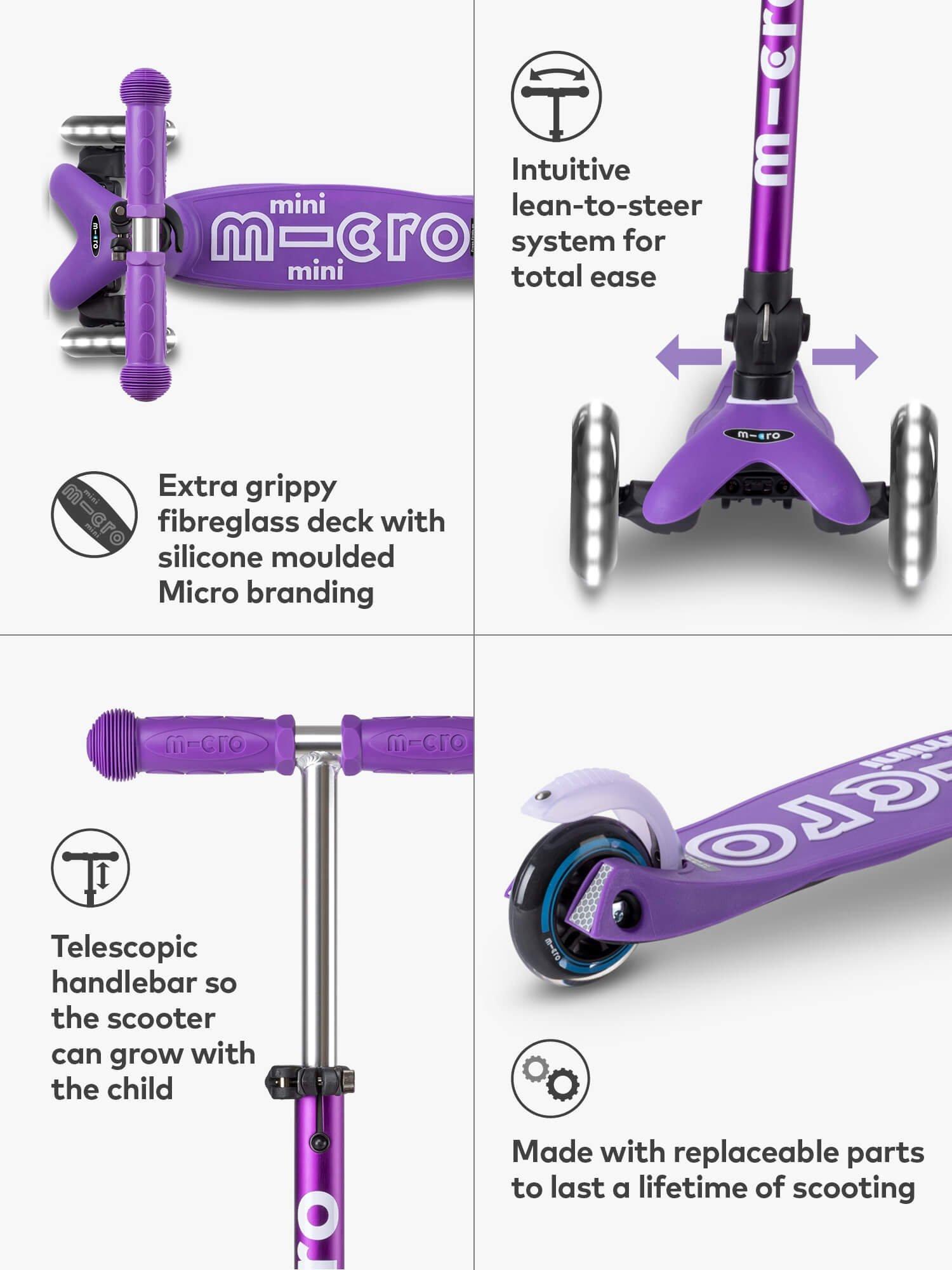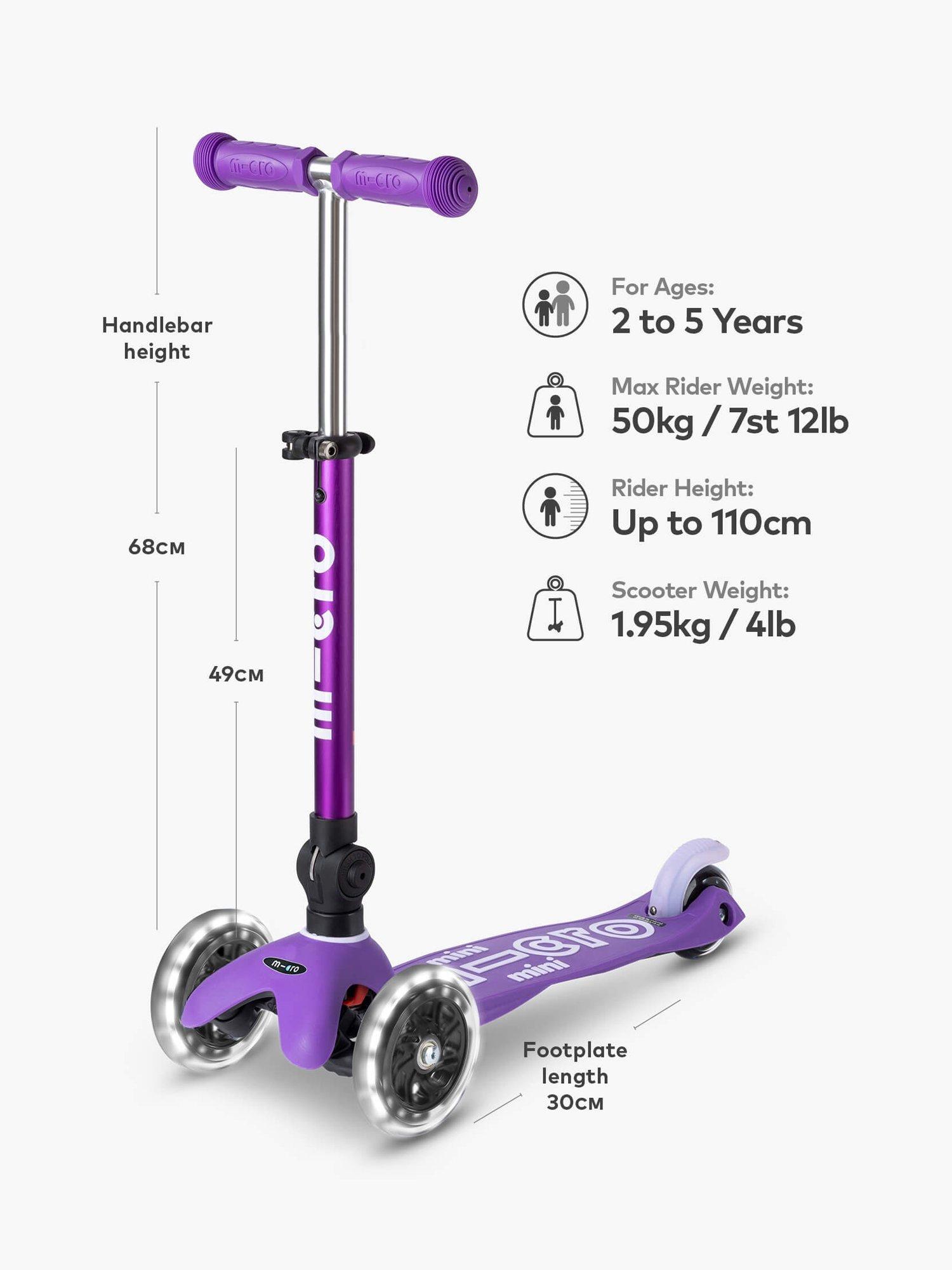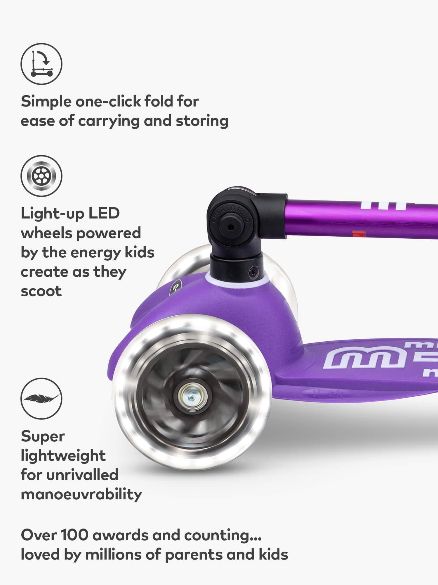 The Mini Micro Foldable Light up Wheels has a footplate made from flexible PAGF (reinforced fibreglass) and double-injected anti-slip silicone logo to help keep children's feet firmly planted, even in wet weather. With our innovative braking system that responds to the slightest touch, thermoplastic, toxin-free rubber handle grips that are soft yet strong and polyurethane, puncture-free wheels for endless adventures. The adjustable handlebar and increased 50kg weight limit mean mini explorers can now start earlier and keep going longer. With a slick folding mechanism for seamless folding and opening on the go. Now there really are no limits to where a Mini Micro can take growing adventurers.