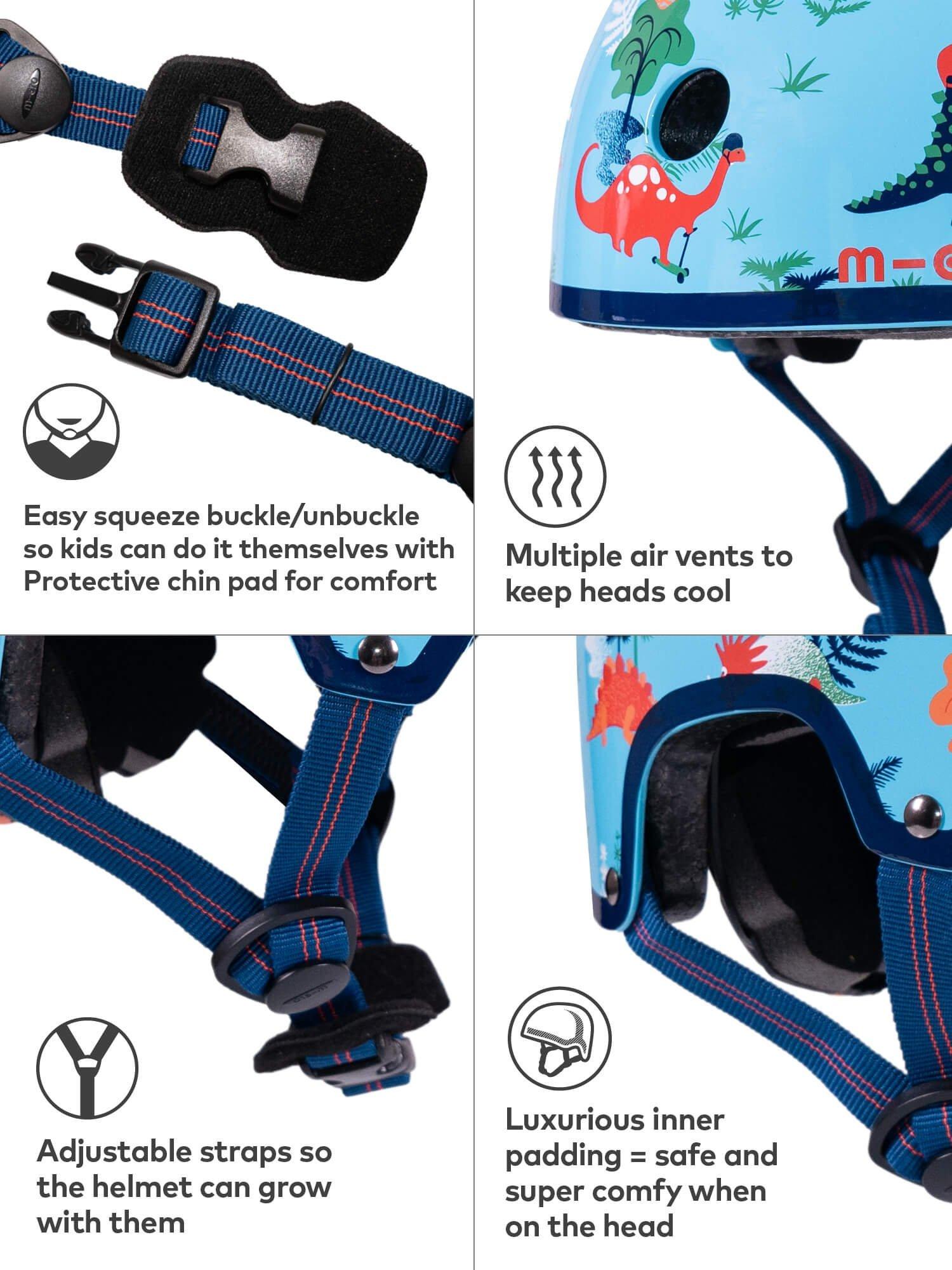 Micro Scooters believe every scooting or cycling adventure should be a safe one. Fuss-free helmet wearing starts with good design. So, their Micro helmets are packed with the latest technology to make safe simple. The brand's easy squeeze buckle/unbuckle helps little fingers fasten their helmet independently. The adjustable side locking dividers make it easy to get the right fit first time.