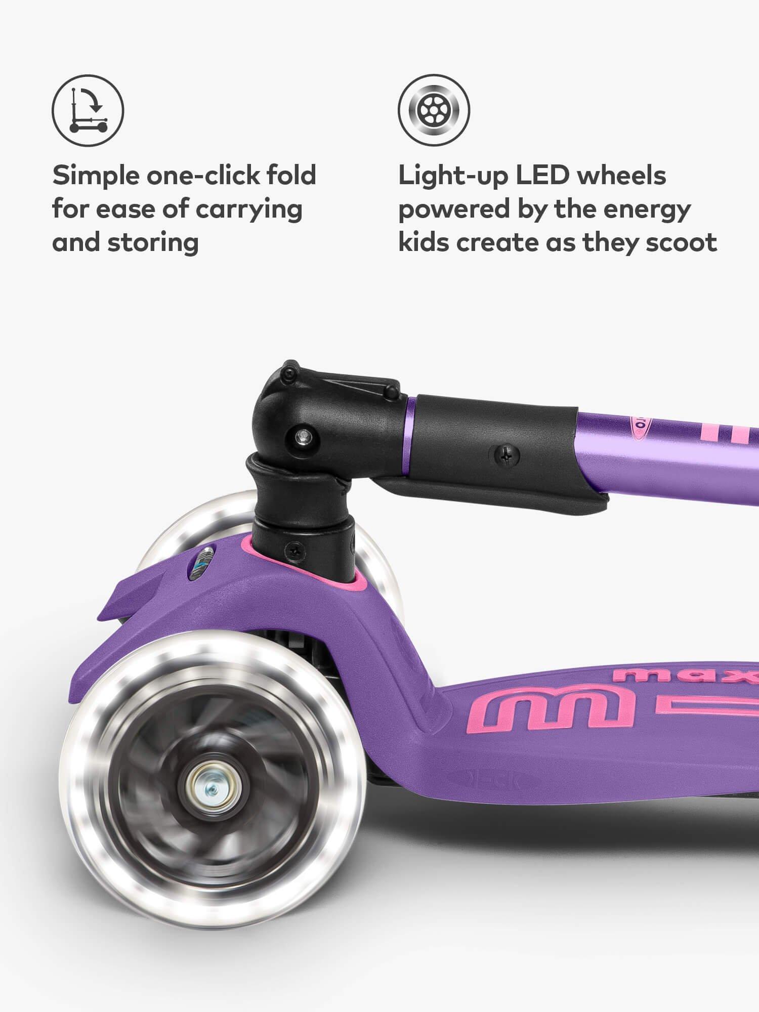 With an easy one-click folding handlebar system, you can now take your Maxi Micro Deluxe Foldable LED scooter anywhere and store it neatly at home or in the boot of your car. Sharing all of the same features as the Maxi Micro Deluxe model, it's complete with exceptionally bright, motion-powered LED wheels.