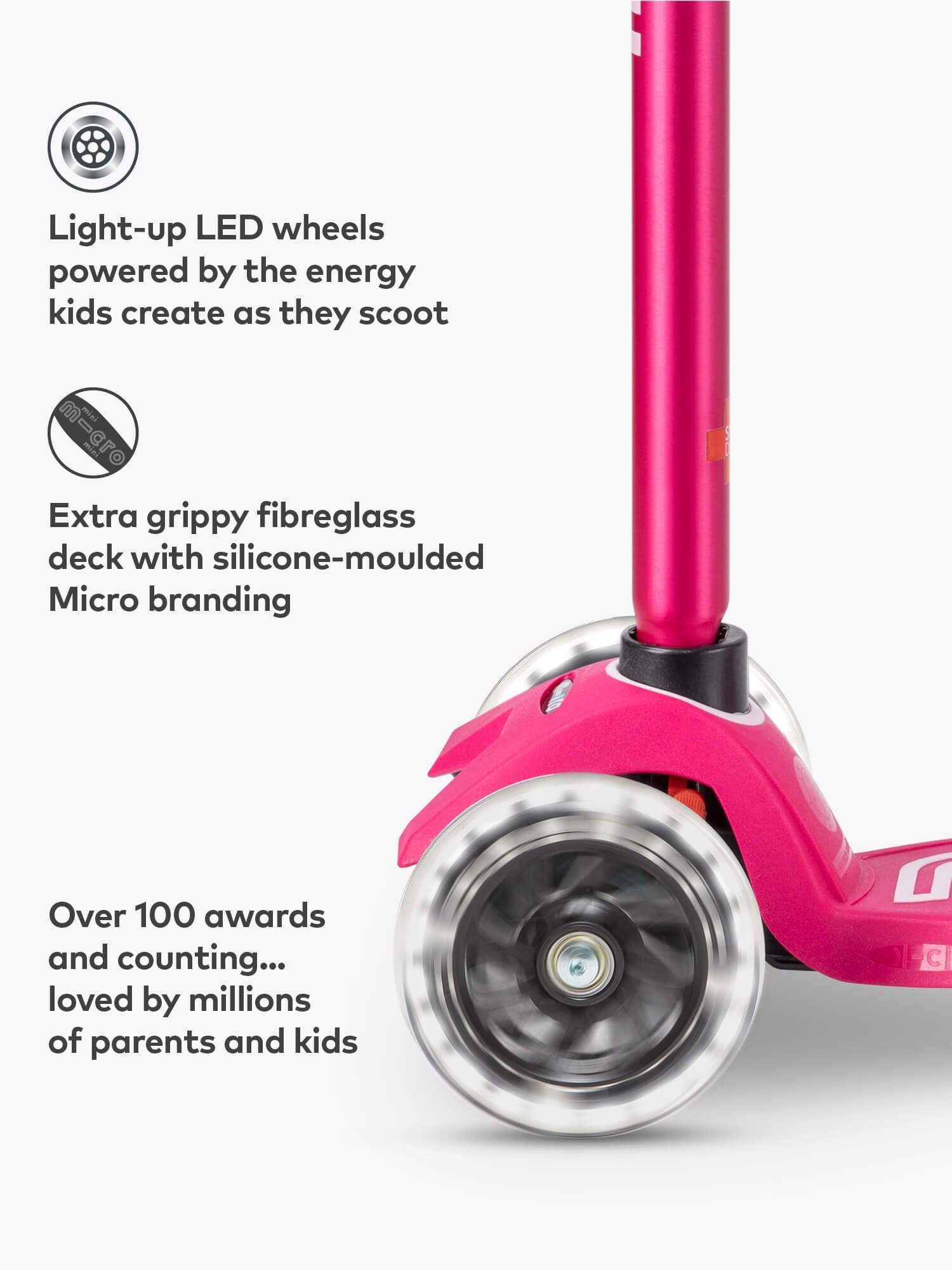 Lights that need no batteries and never run out? The Maxi Micro's clever induction-powered LEDs are fuelled by the energy kids create as they scoot - producing bright white light to add some magic to every journey and help keep children safe on the darkest school run. Plus, puncture-free wheels allow for endless adventures.