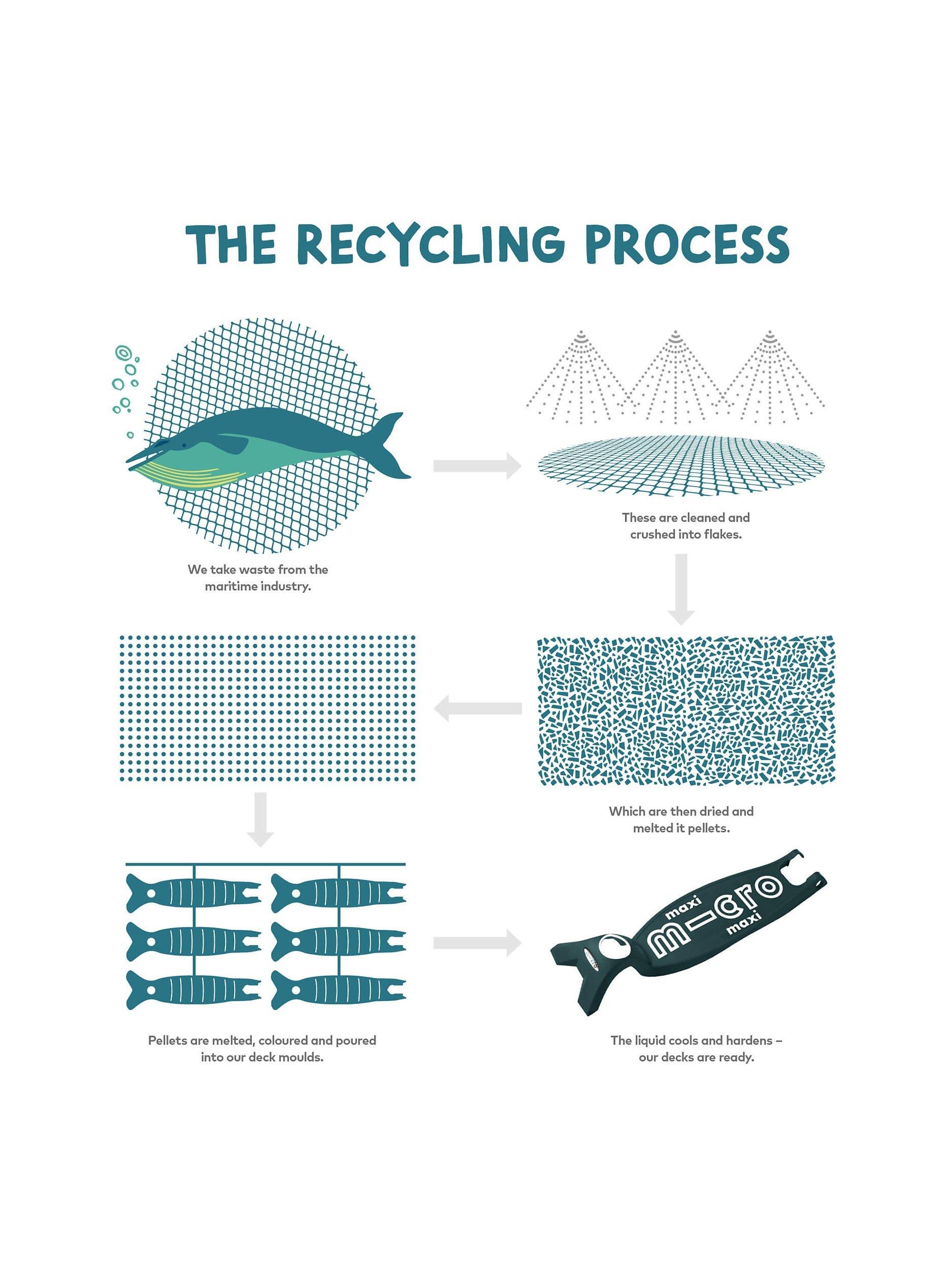 The Maxi Eco has been designed to brighten every day while leaving little footprint on our planet. The deck is made from recycled fishing nets that are removed from the ocean, cleaned and broken down into chips. They are then melted, coloured and poured into deck moulds. With an easy one-click folding handlebar system, you can now take it anywhere and store it neatly at home or in the boot of the car. Suitable for children aged 5-12 years.