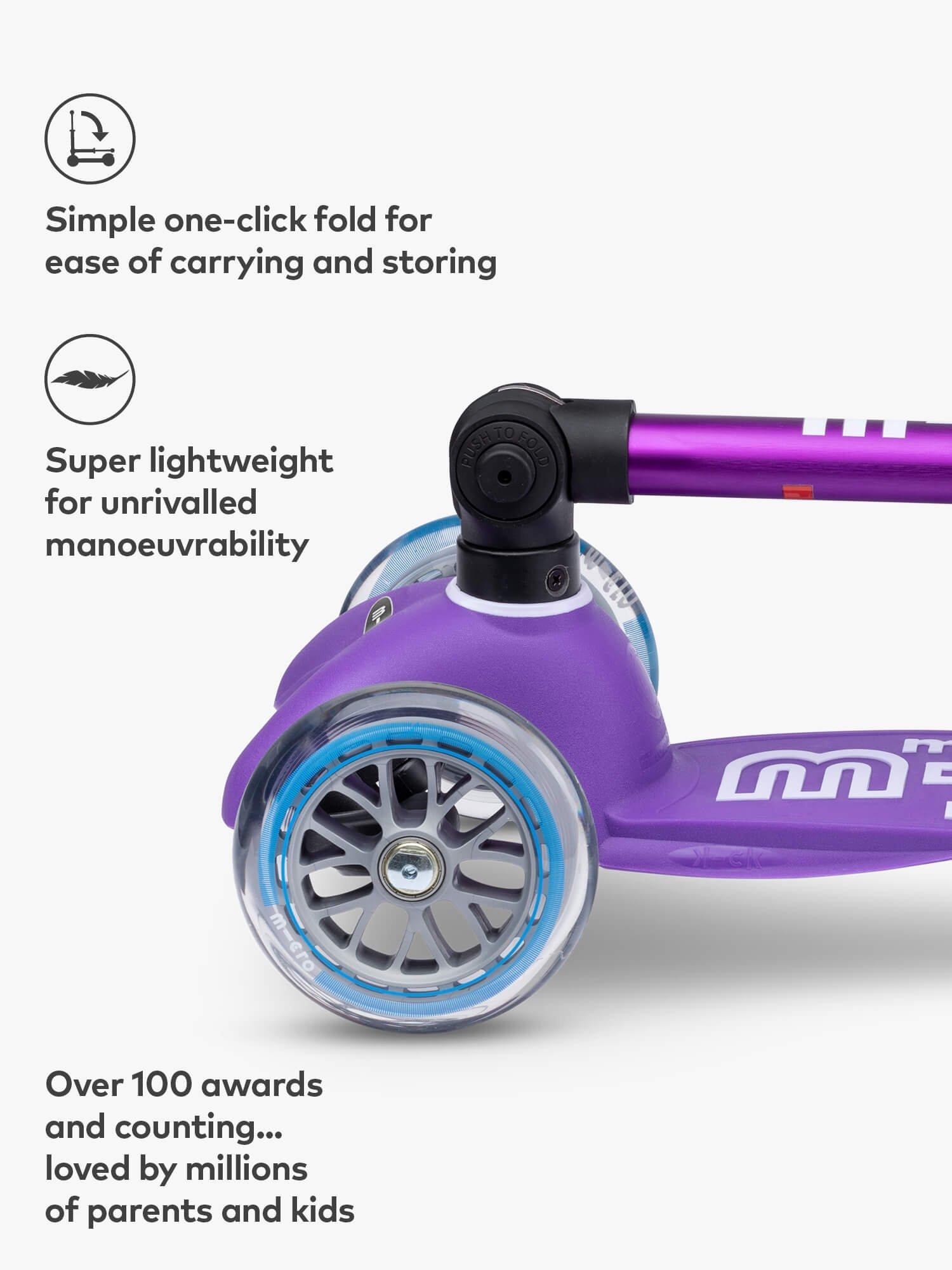 With an easy one-click folding handlebar system, you can now take your Mini Micro Foldable scooter anywhere and store it neatly at home or in the boot of your car. Sharing all of the same features as the Maxi Micro Deluxe model. Created by award-winning Swiss design, the scooter features 3 wheels for balance and stability. It’s a quiet smooth ride that won’t rattle or shake, while the weight transfer steering system encourages balance and coordination skills. Suitable for children aged 2-5 years.