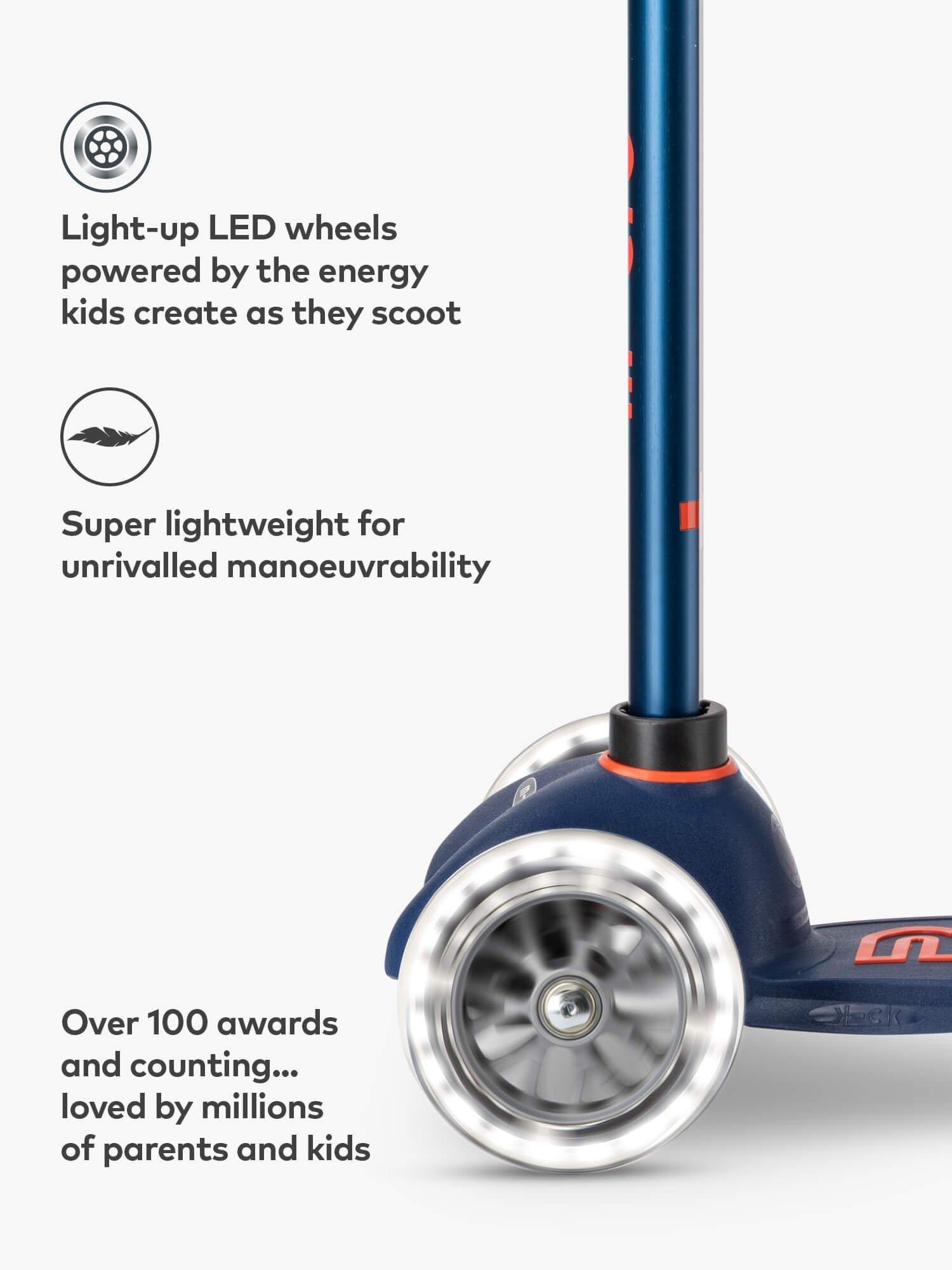 Light up wheels Lights that need no batteries and never run out? The Mini Deluxe's clever induction-powered LEDs are fuelled by the energy kids create as they scoot - producing bright white light to add some magic to every journey and help keep children safe on the darkest school run. Plus, puncture-free wheels allow for endless adventures.