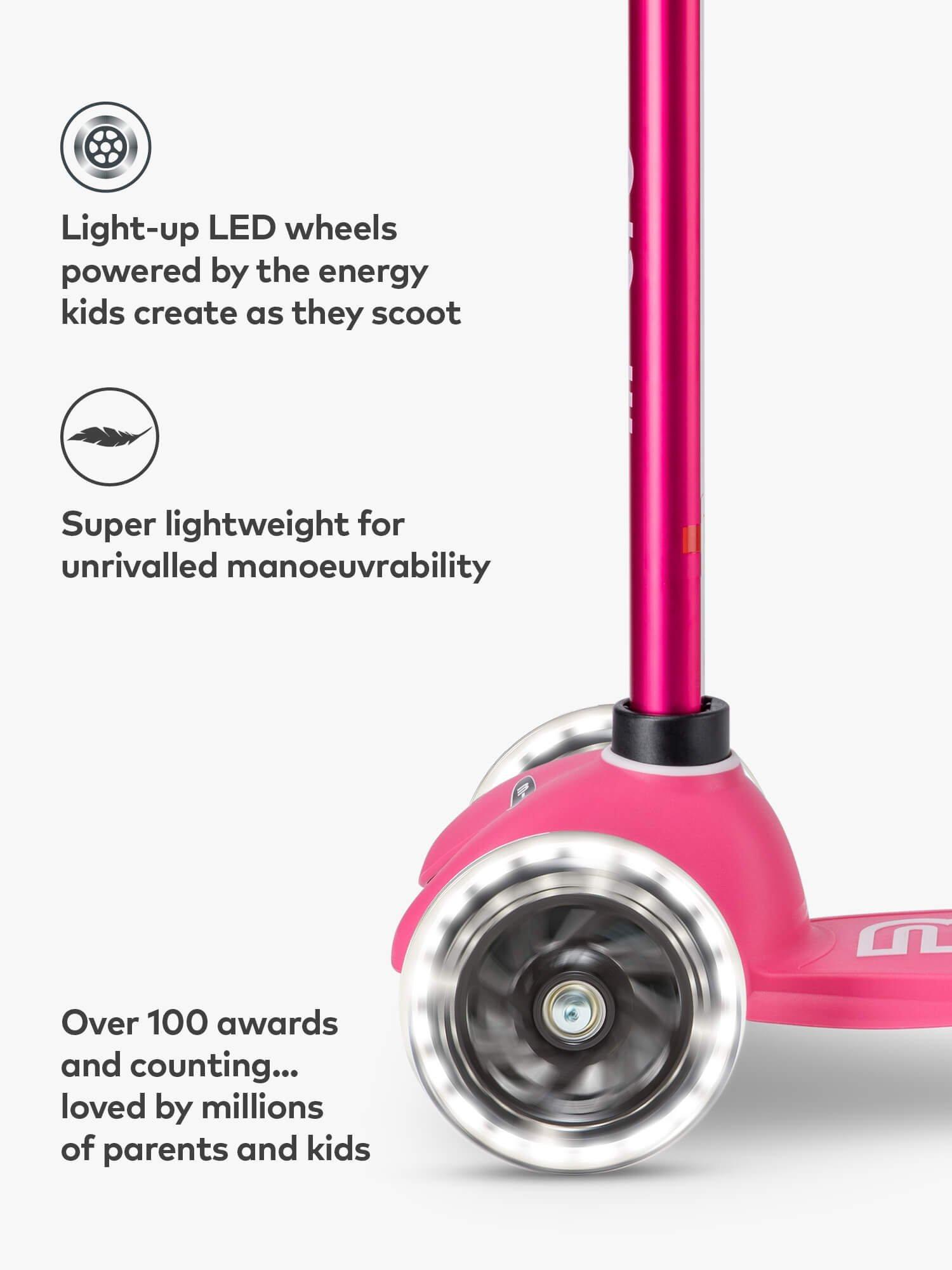Light up wheels Lights that need no batteries and never run out? The Mini Deluxe's clever induction-powered LEDs are fuelled by the energy kids create as they scoot - producing bright white light to add some magic to every journey and help keep children safe on the darkest school run. Plus, puncture-free wheels allow for endless adventures.
