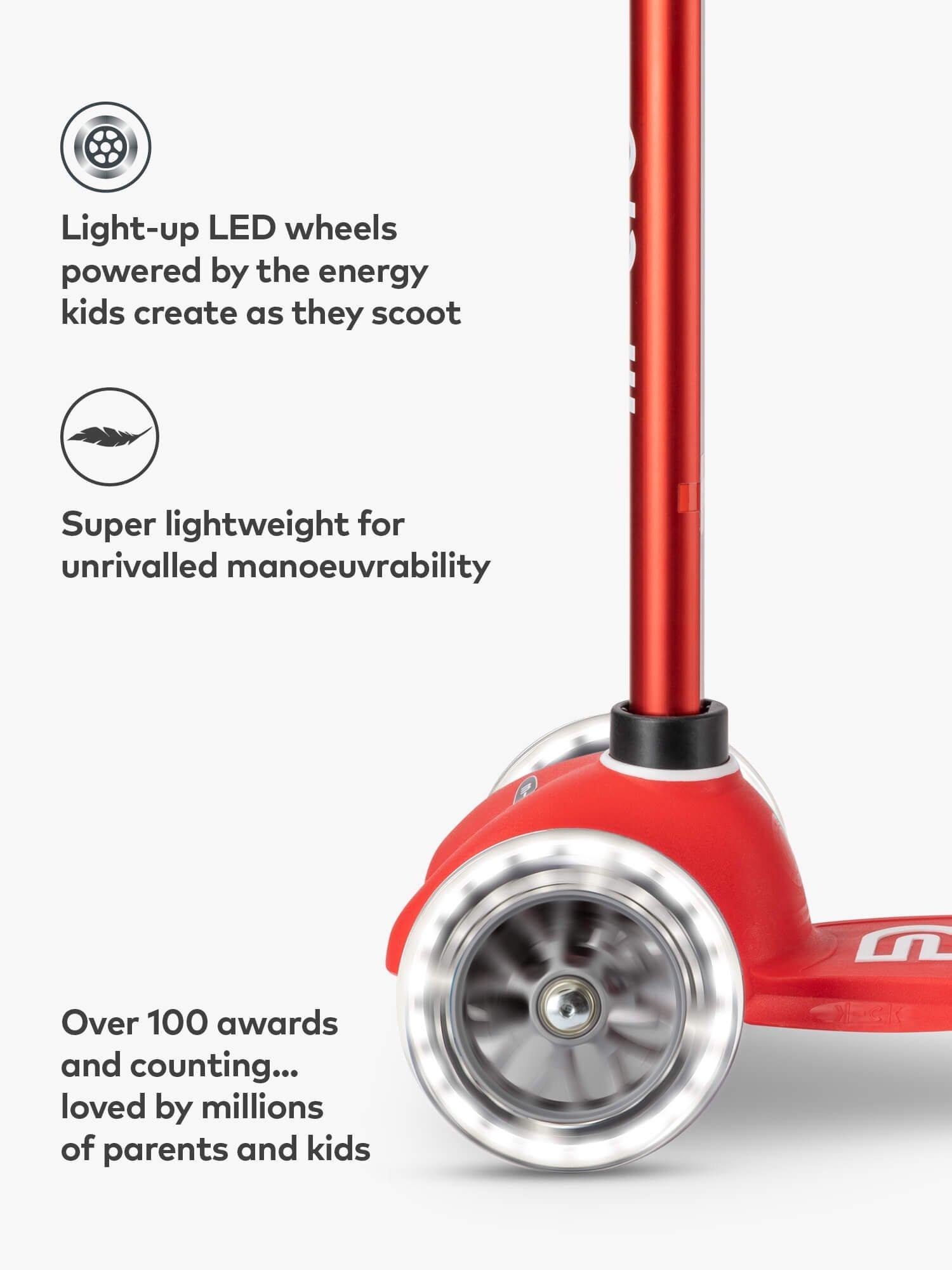 Light up wheels Lights that need no batteries and never run out? The Mini Deluxe's clever induction-powered LEDs are fuelled by the energy kids create as they scoot - producing bright white light to add some magic to every journey and help keep children safe on the darkest school run. Plus, puncture-free wheels allow for endless adventures.
