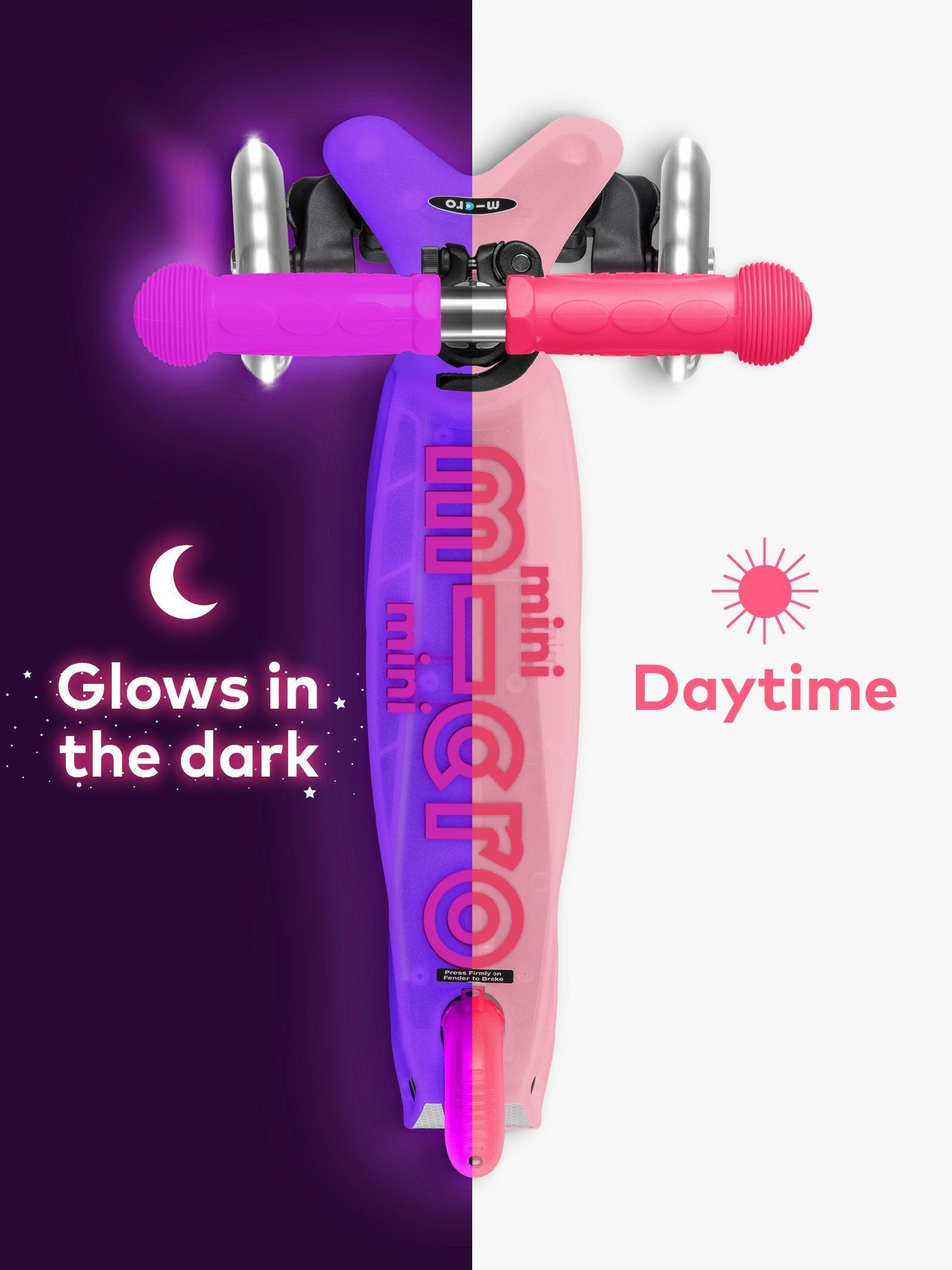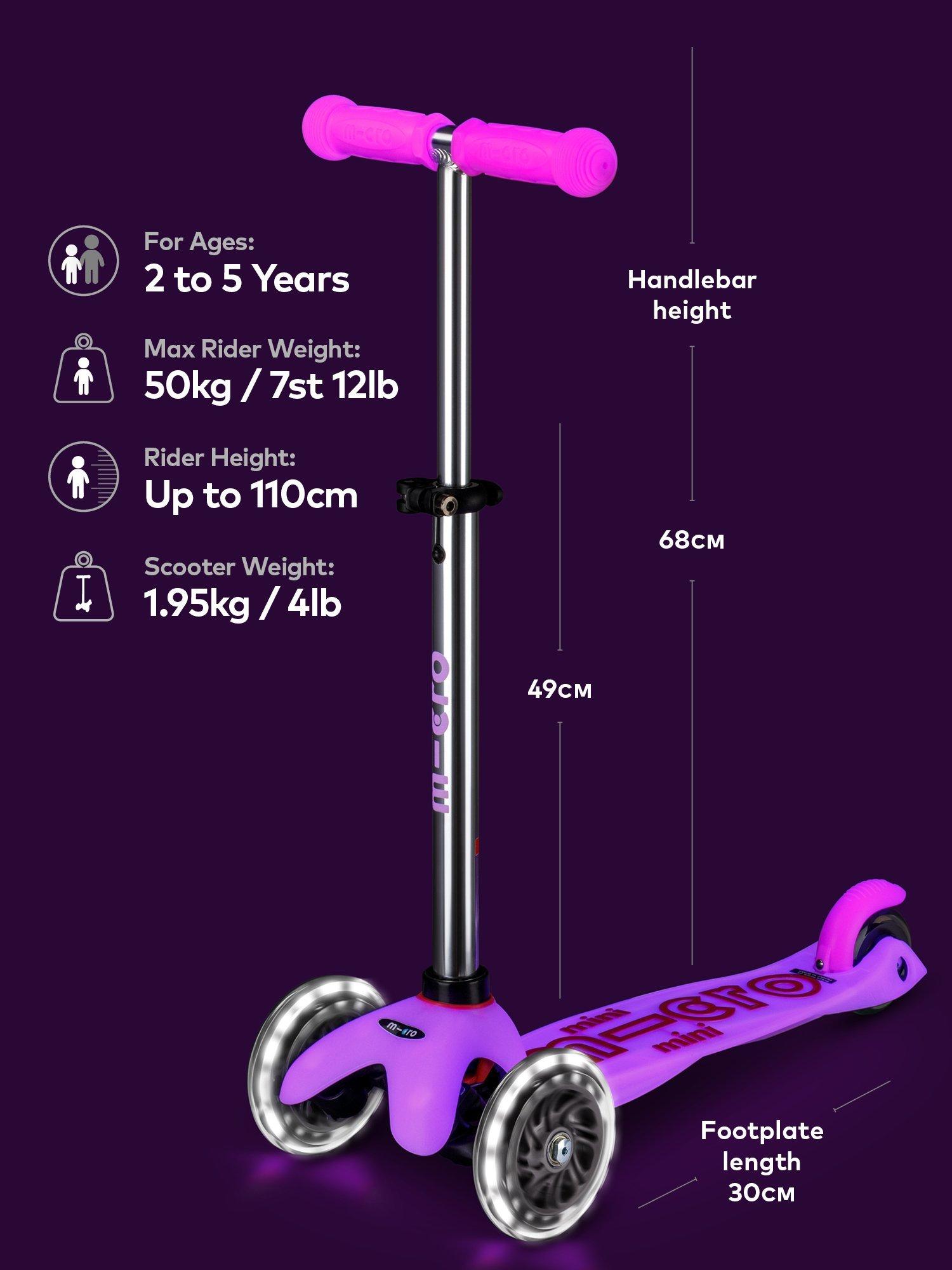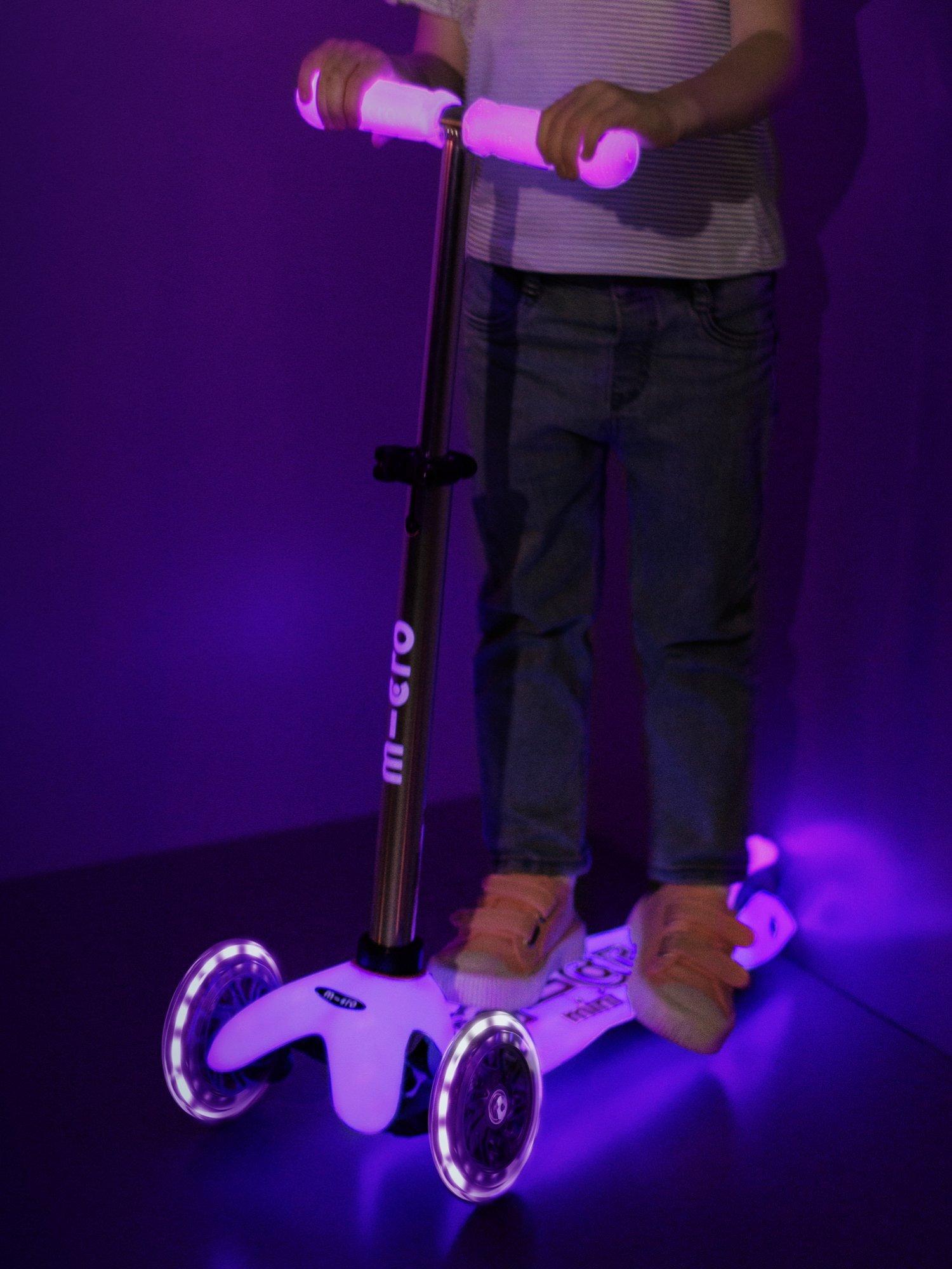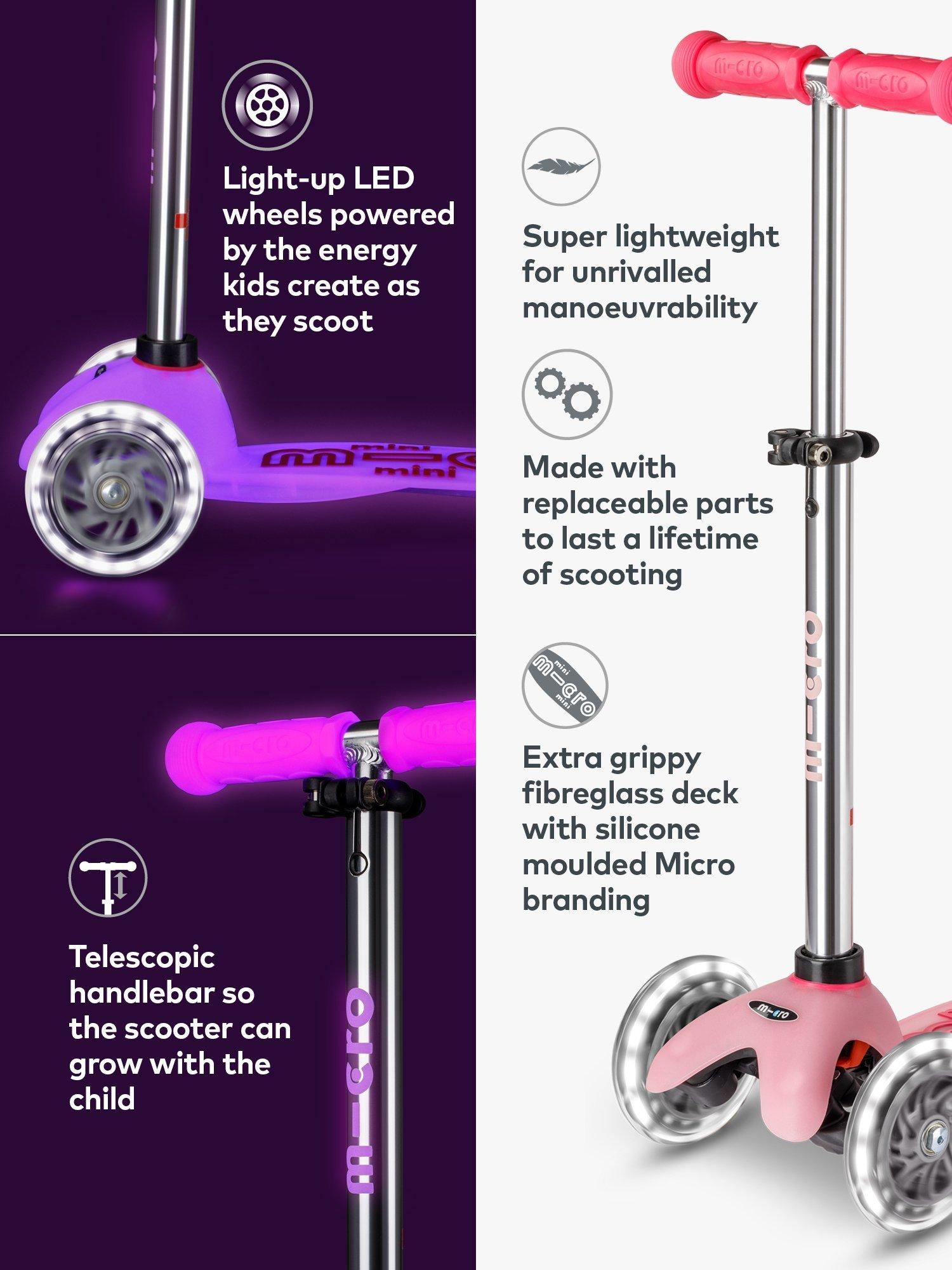 The adjustable handlebar and increased 50kg weight limit mean mini explorers can now start earlier and keep going longer. The Mini Micro Glow has a footplate made from flexible PAGF (reinforced fibreglass) and a double-injected anti-slip silicone logo to help keep children's feet firmly planted , even in wet weather. With our innovative braking system that responds to the slightest touch, thermoplastic, toxin-free rubber handle grips that are soft yet strong and polyurethane, puncture-free wheels for endless adventures. The Mini Micro Glow is the most glow-rious and durable pre-school scooter in town.