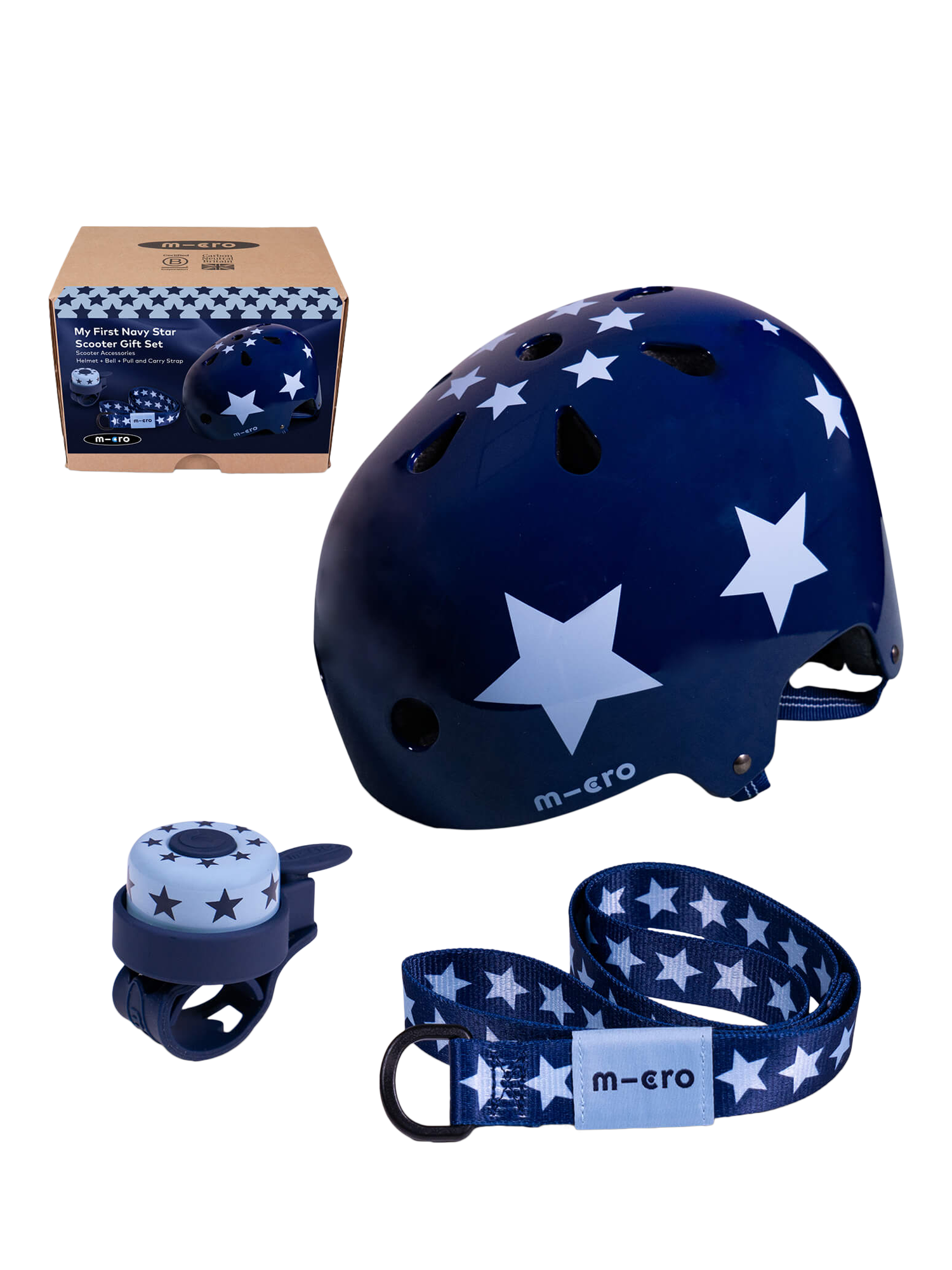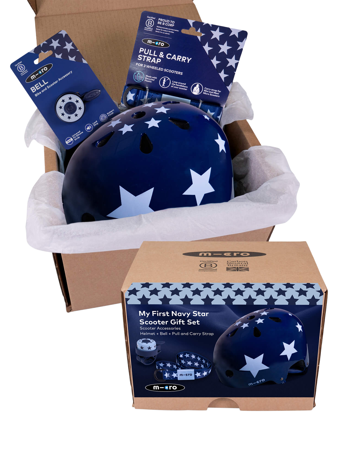 Introduce your little one to the world of scooting with the My First Scooter Gift Set. This set features a delightful star design on a helmet, pull and carry and bell. It is suitable for use on all scooters and for riders aged 2+.