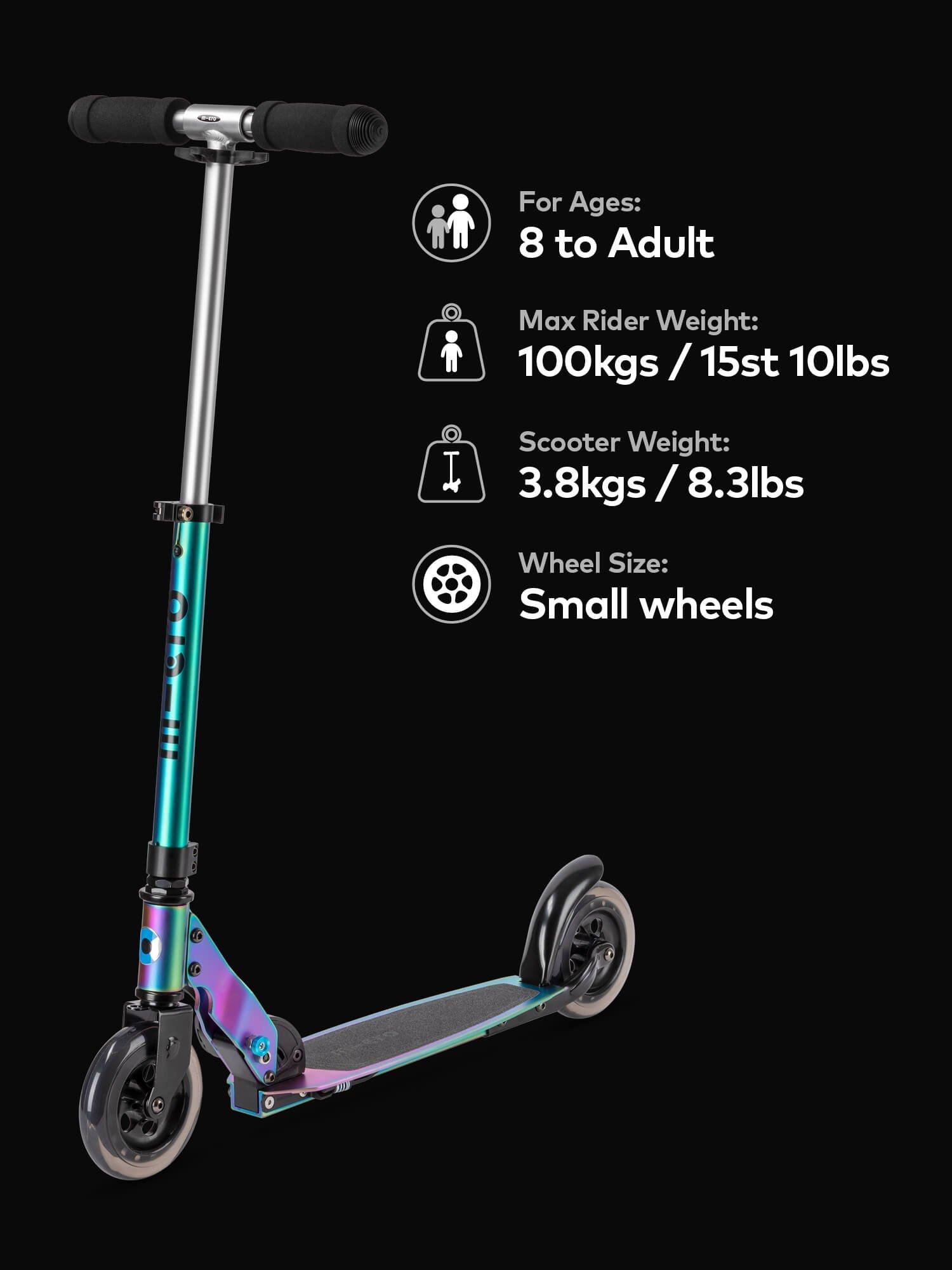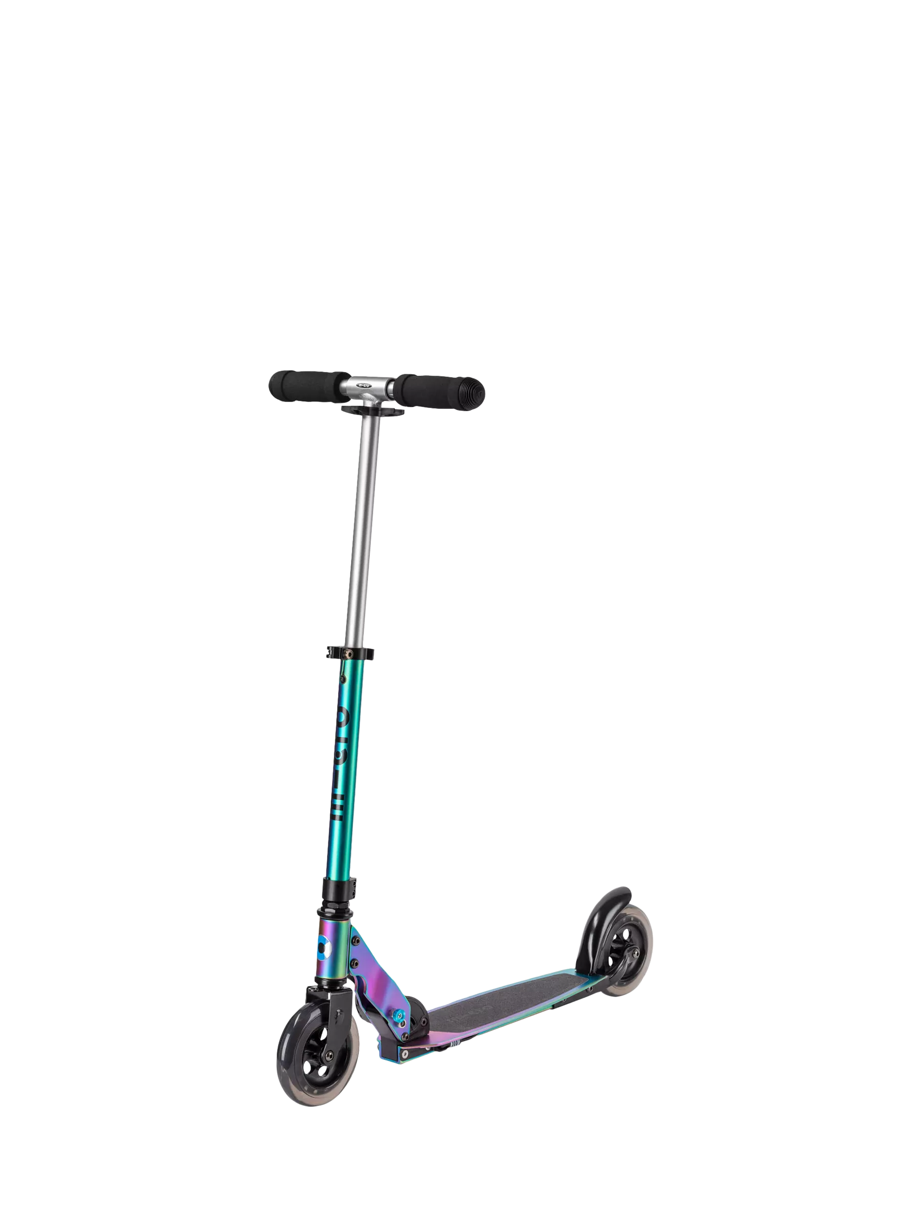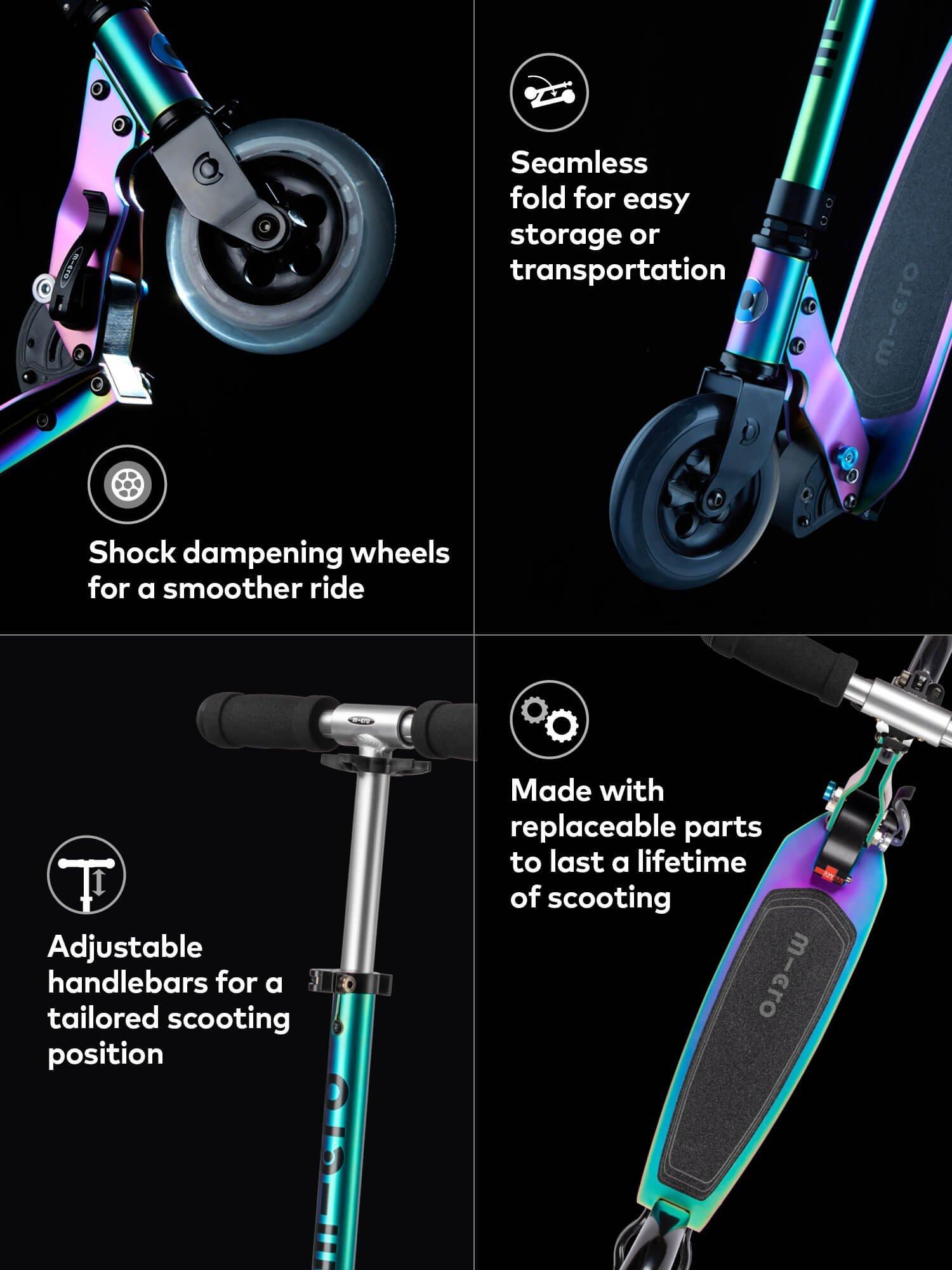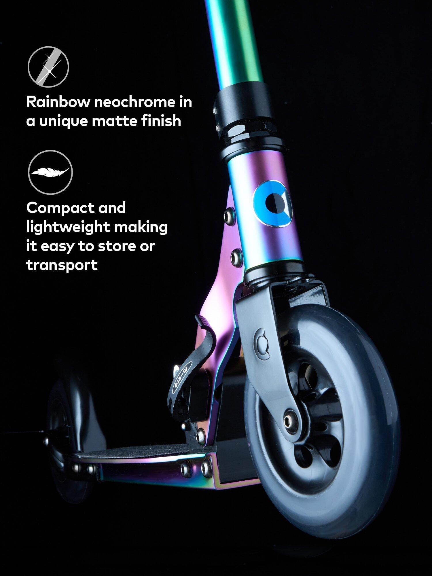 The multi-award-winning Micro Speed has a stunning new look. Expertly finished in on-trend neochrome for a stand-out scooter that doesn't compromise style, function or pace. This lightweight, easy folding, two-wheeled scooter for ages 8+ is renowned for the smooth ride. This is down to the Speed's real difference; it's integrated shock-dampening system acts like a bike suspension to absorb bumps in the road. For the smoothest of rides on all kinds of terrain.