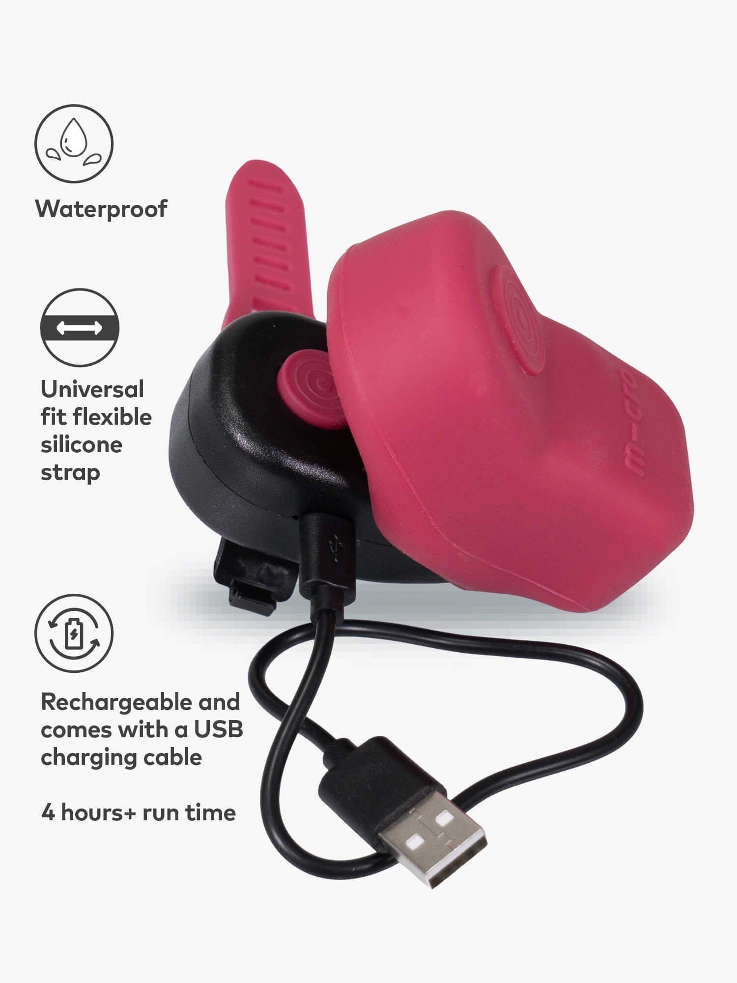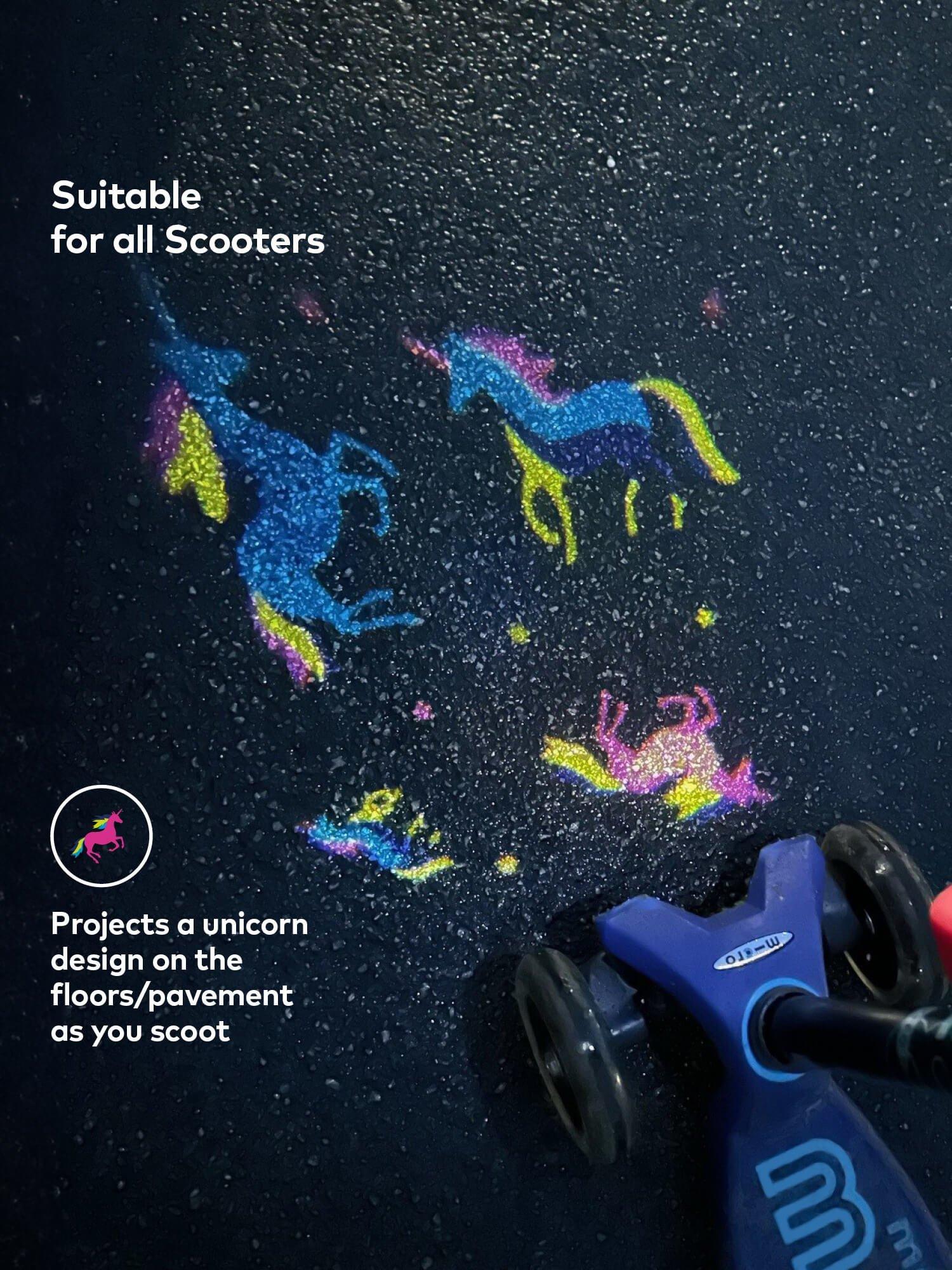 Projects a Unicorn design on walls, floors, pavements and more. Can also be used as a handheld torch for fun indoors and out. Rechargeable and comes with a USB charging cable. 4 hours + run time. Suitable for use on all Micro scooters. This clever light attaches to any Micro scooter quickly and easily. Before you embark, press once, and a dazzling Unicorn print will appear on the pavement in front of you or on the walls and floors around you. Making for fun guiding light on every adventure.