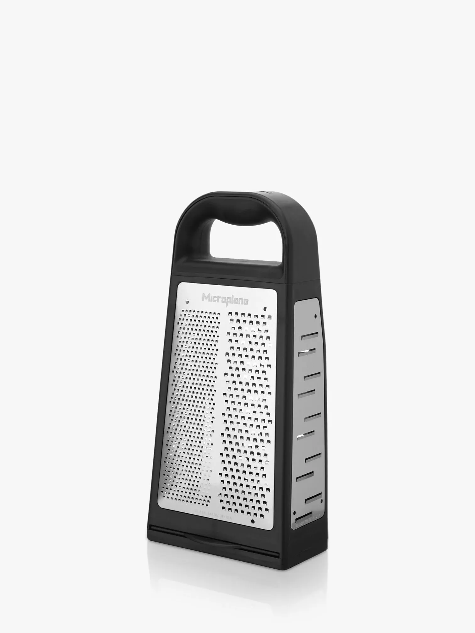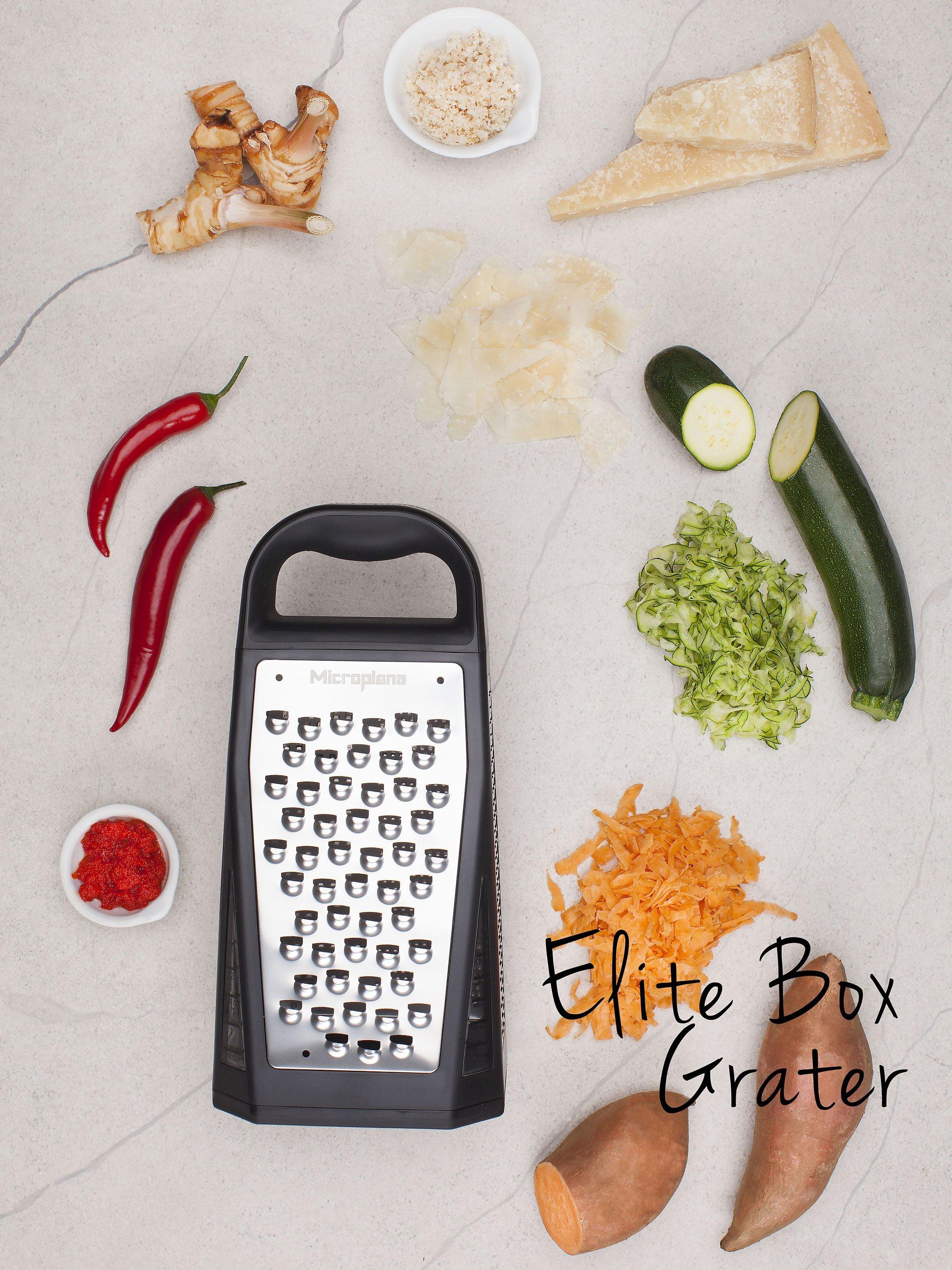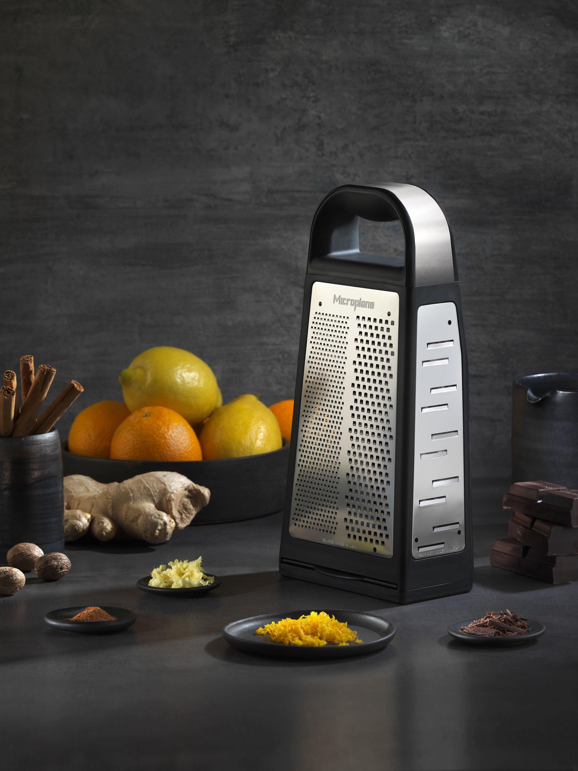 This four-sided box grater tackles cheese, vegetables, fruit and chocolate with coarse to fine grating options. A precise metal etching process is used to make the ultra-sharp cutting edges. The handle is comfortable to hold, making the grater sturdy when in use.