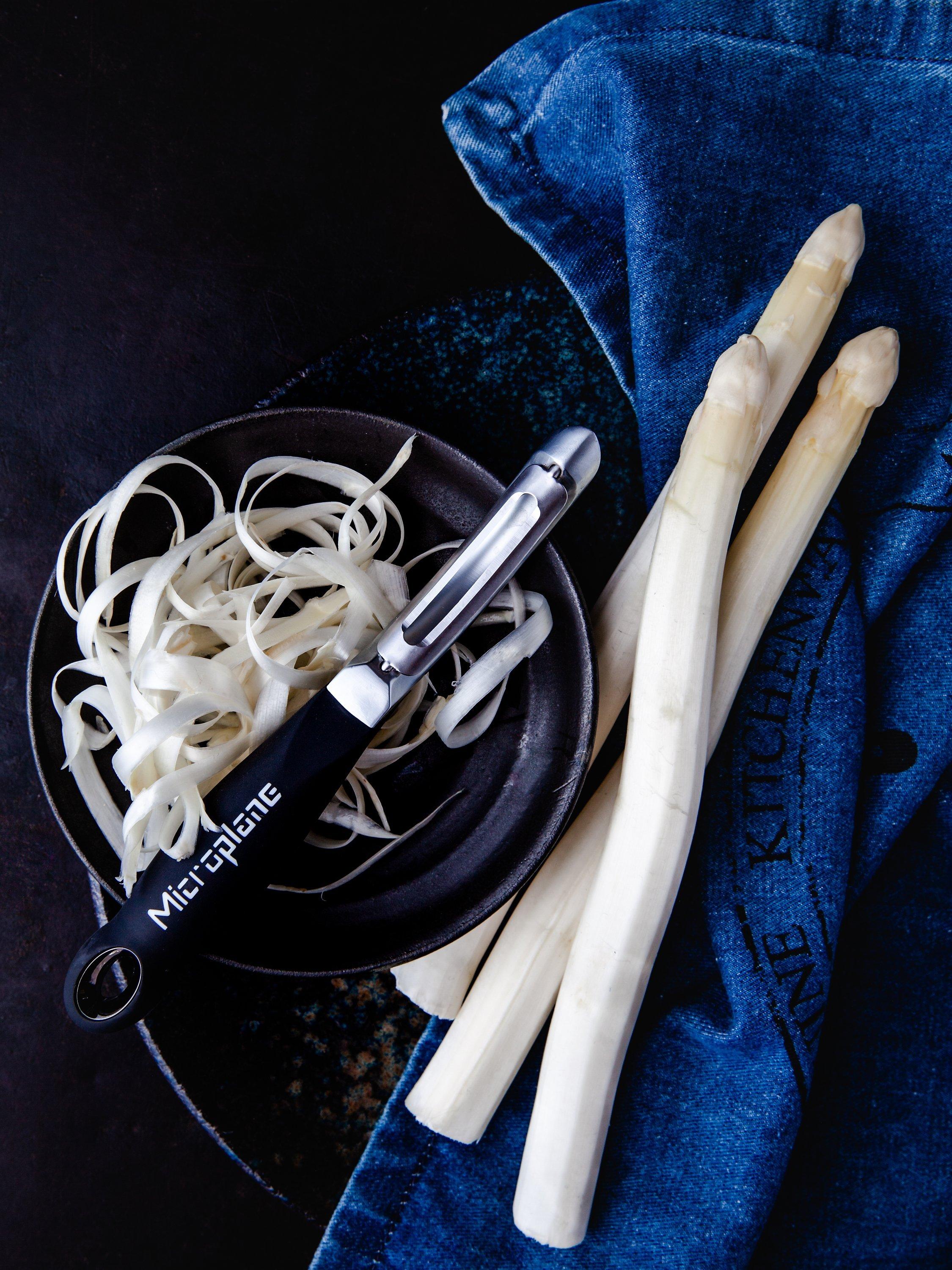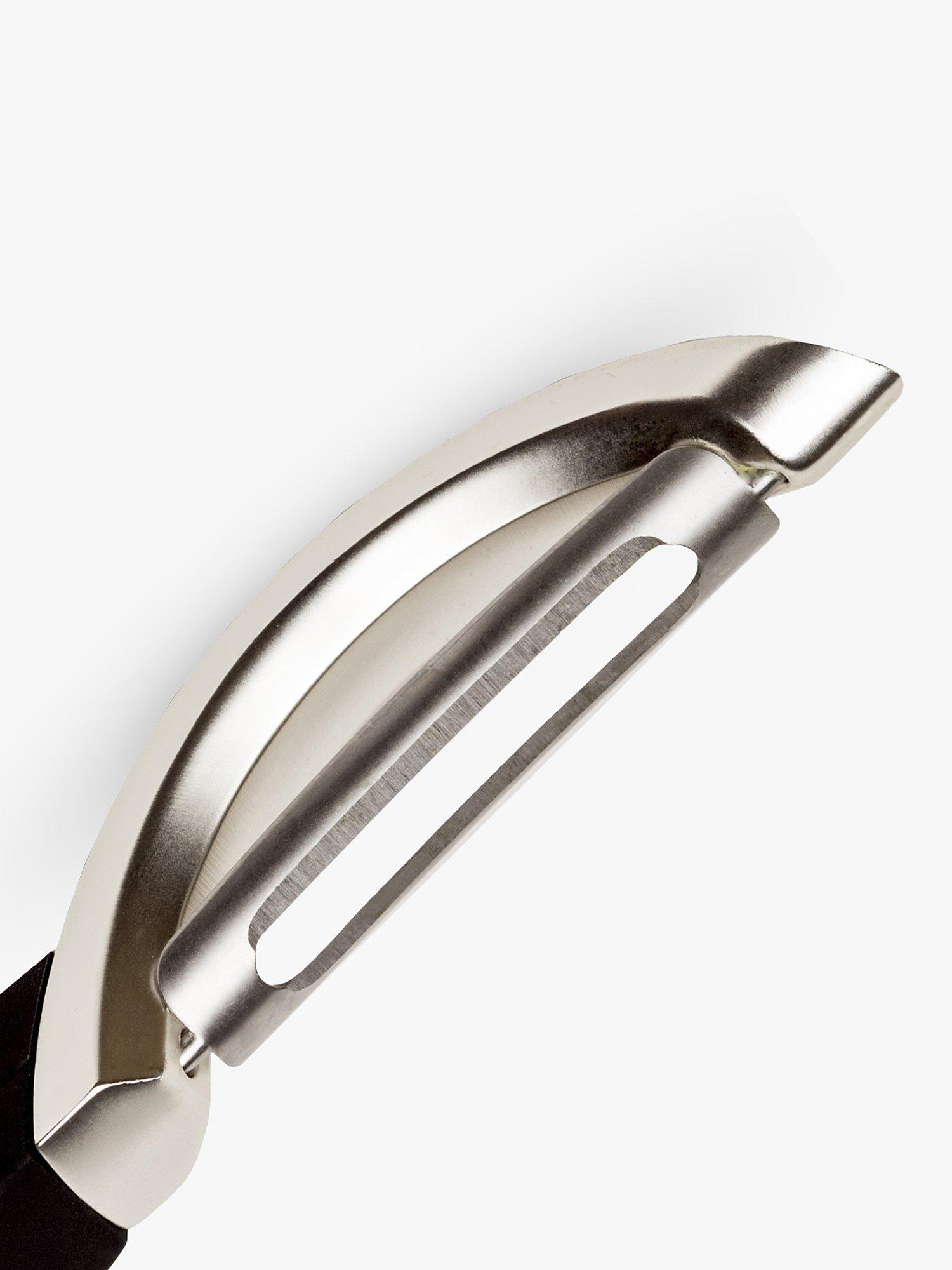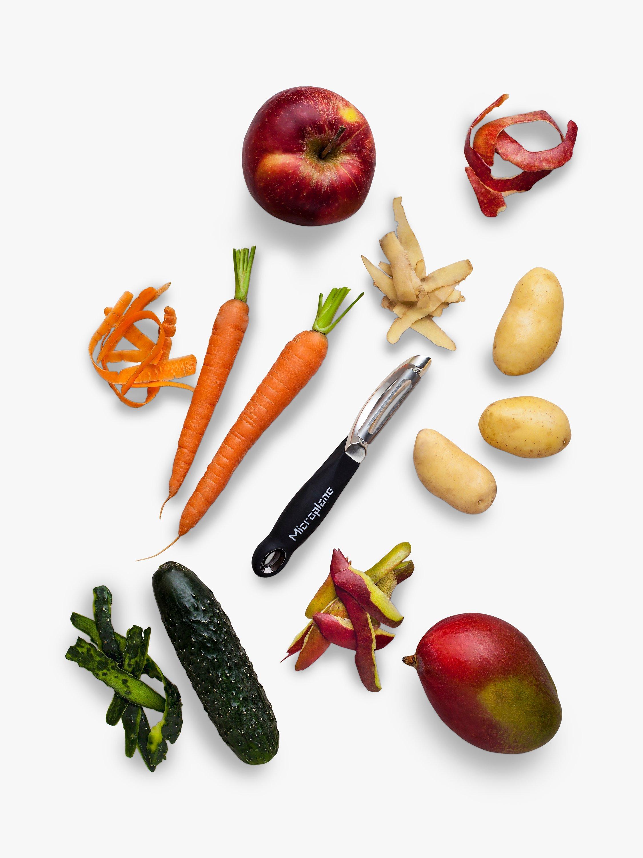 The peeler creates thin strips of fruits and vegetables for salads and decorations. It expertly contours soft and hard fruits, as well as vegetables such as carrots, turnips, courgettes, potatoes, parsnips, mangoes, apples, butternut squash and more. Unlike traditional peelers, the Professional Peeler is slightly heavier. Comes with a built-in potato eye remover.