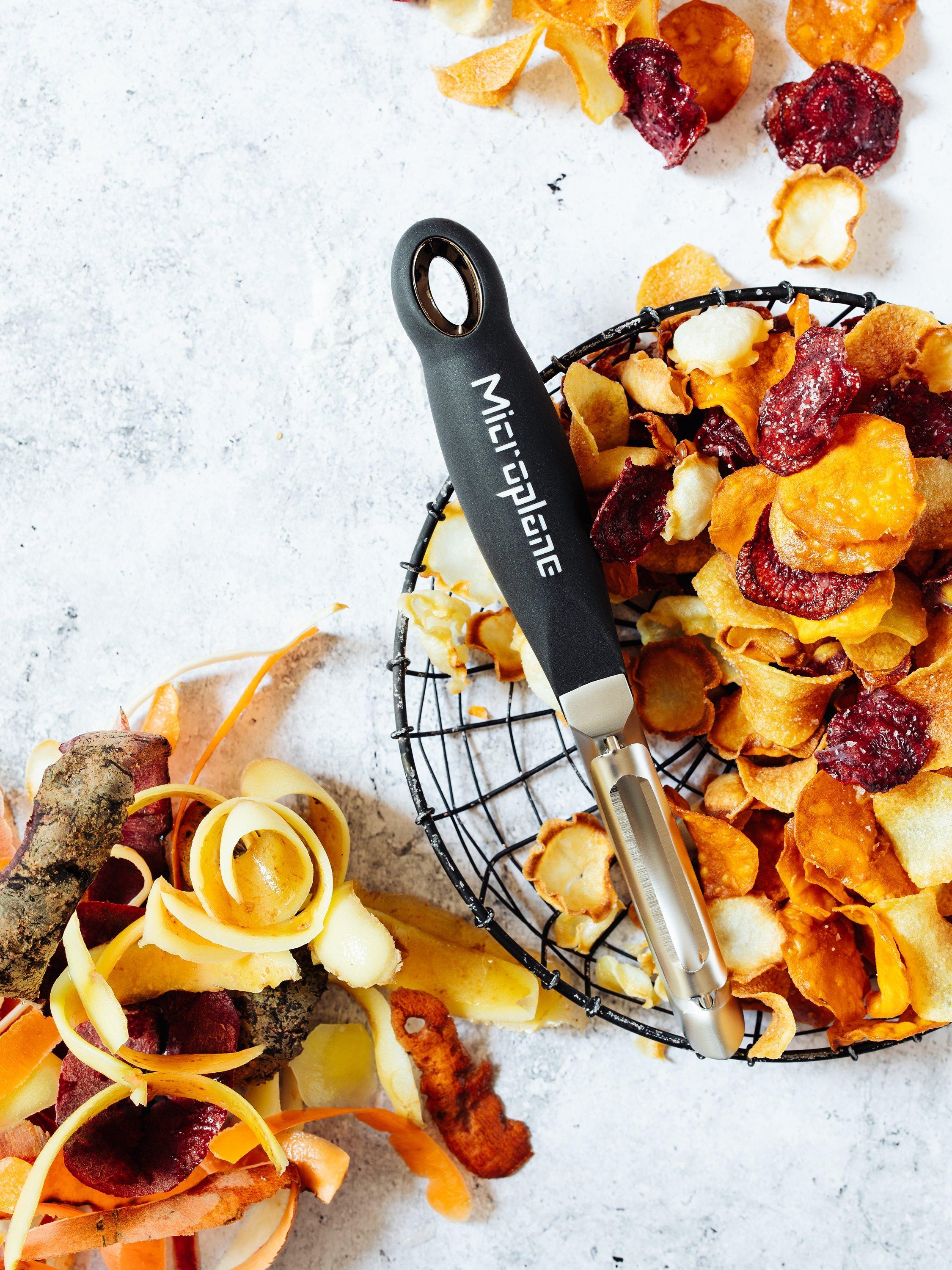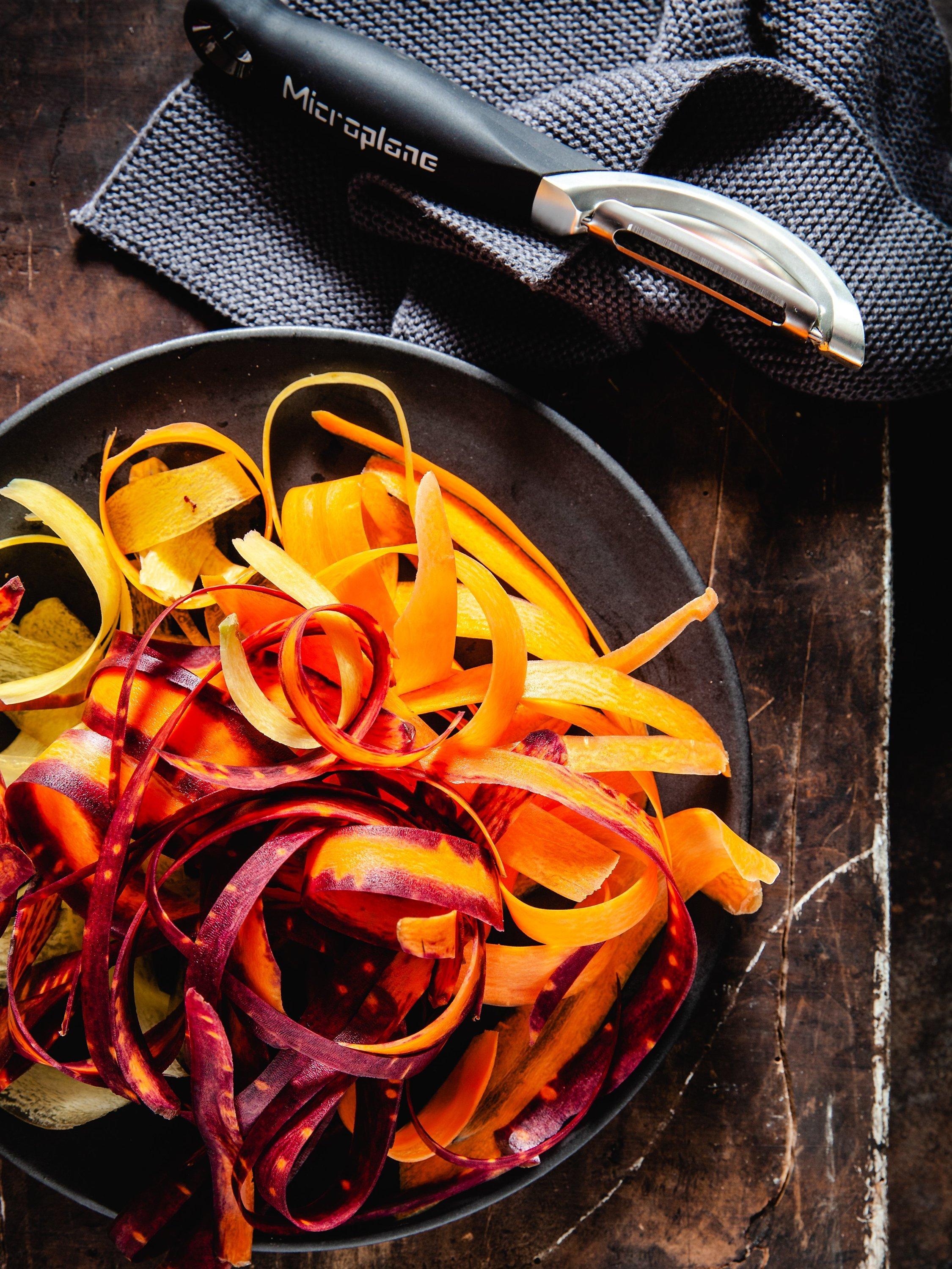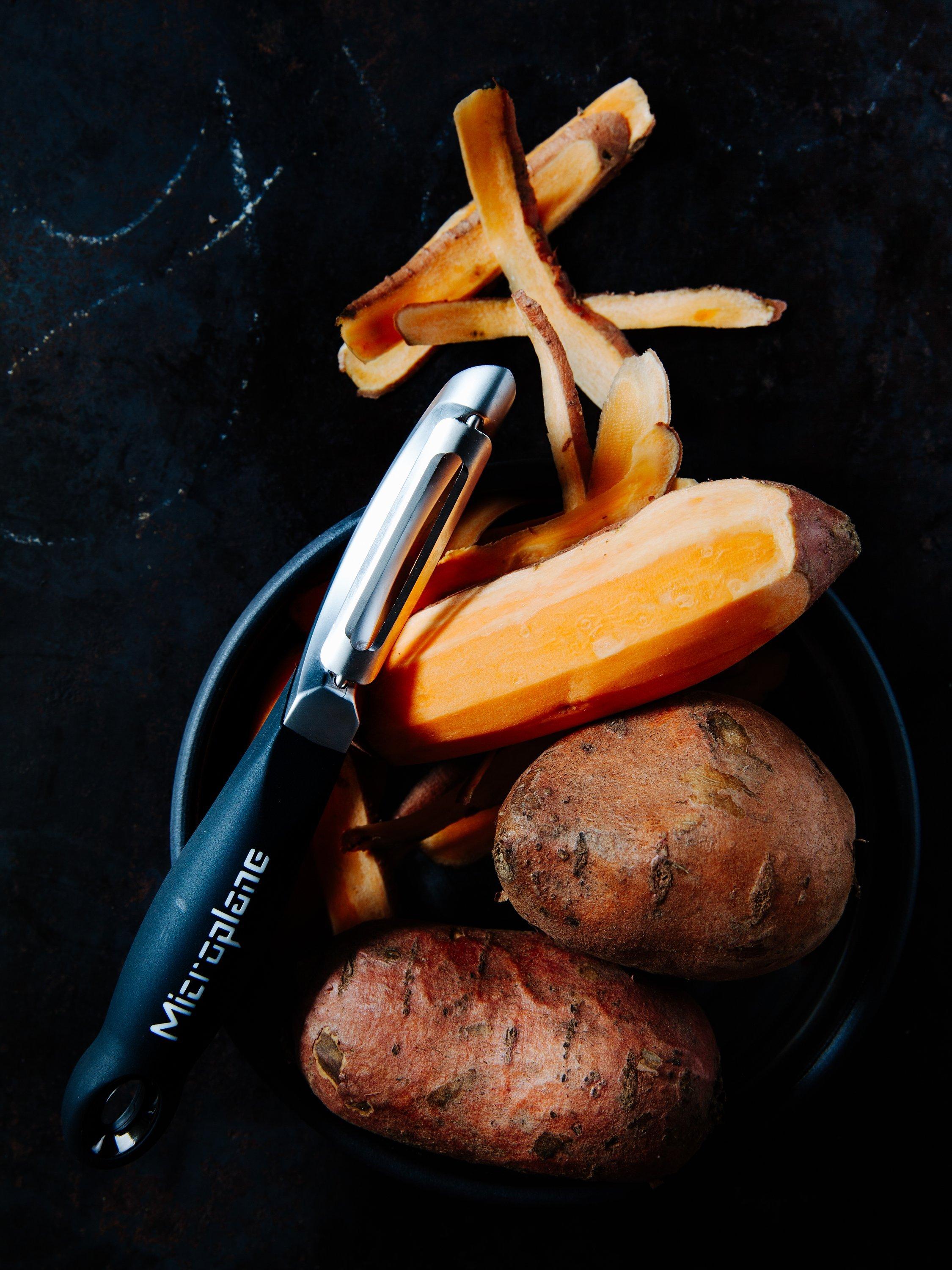 The peeler creates thin strips of fruits and vegetables for salads and decorations. It expertly contours soft and hard fruits, as well as vegetables such as carrots, turnips, courgettes, potatoes, parsnips, mangoes, apples, butternut squash and more. Unlike traditional peelers, the Professional Peeler is slightly heavier. Comes with a built-in potato eye remover.