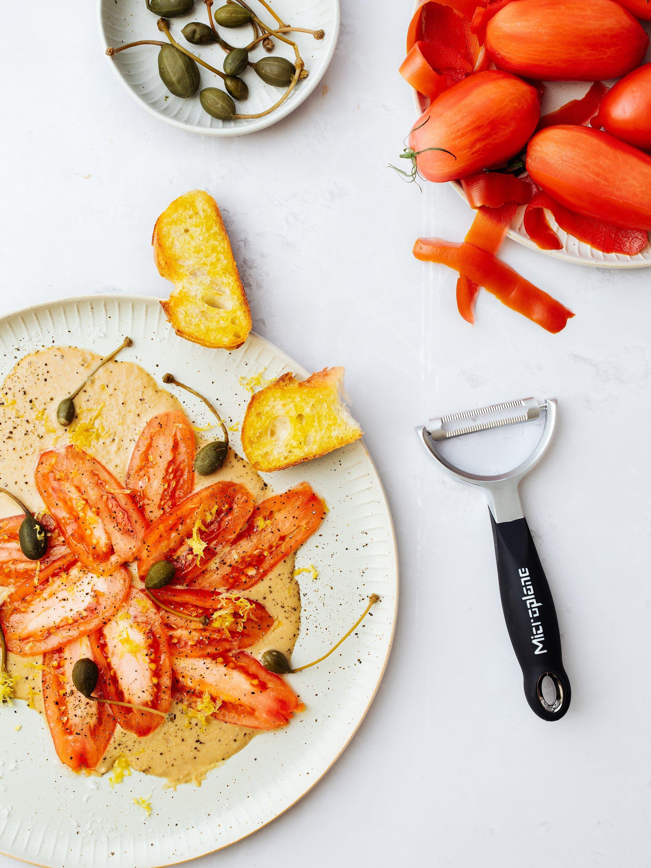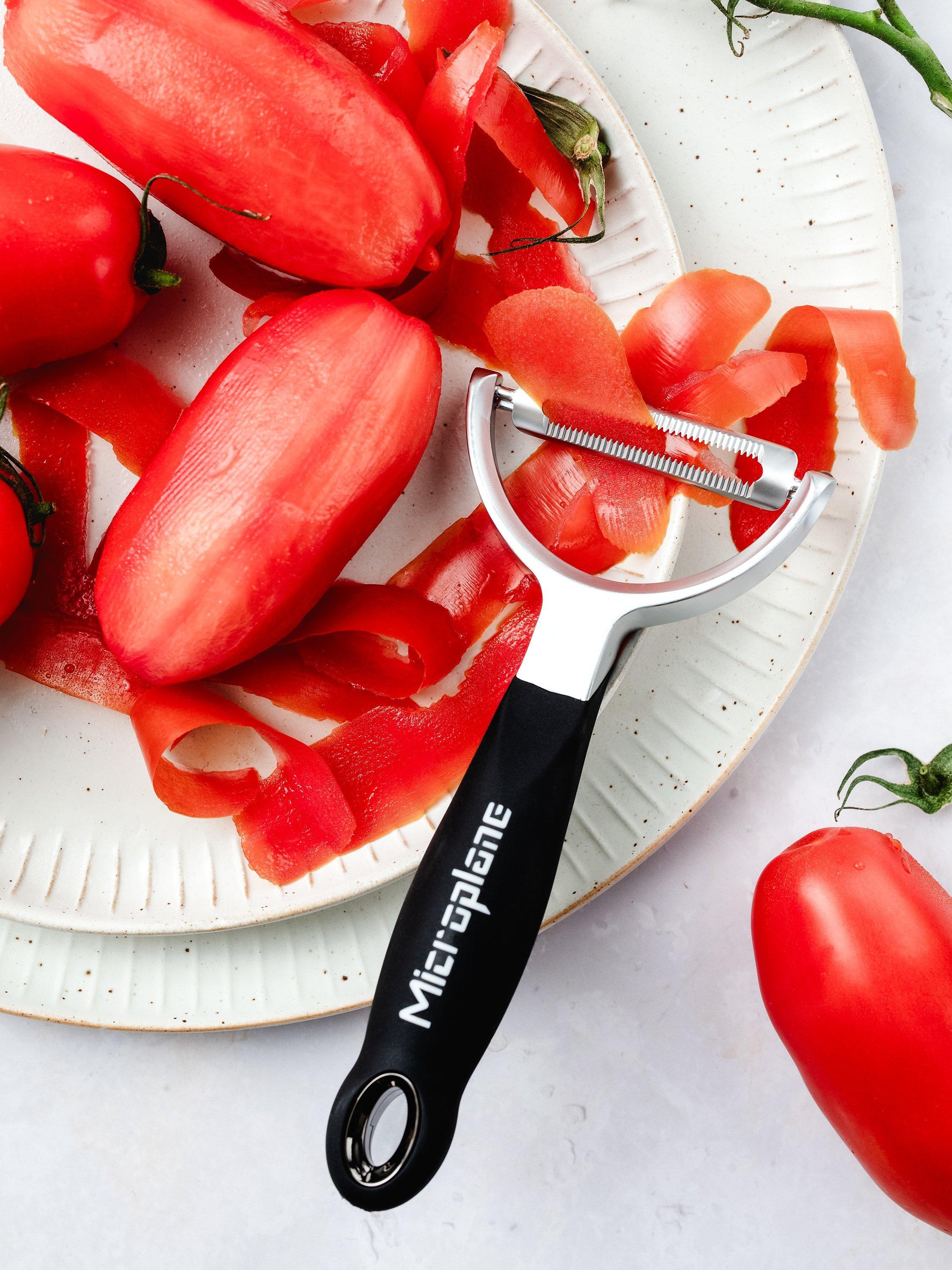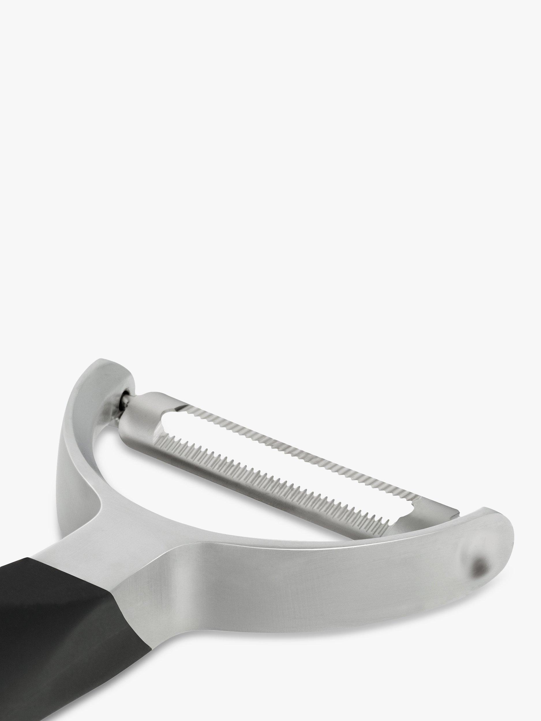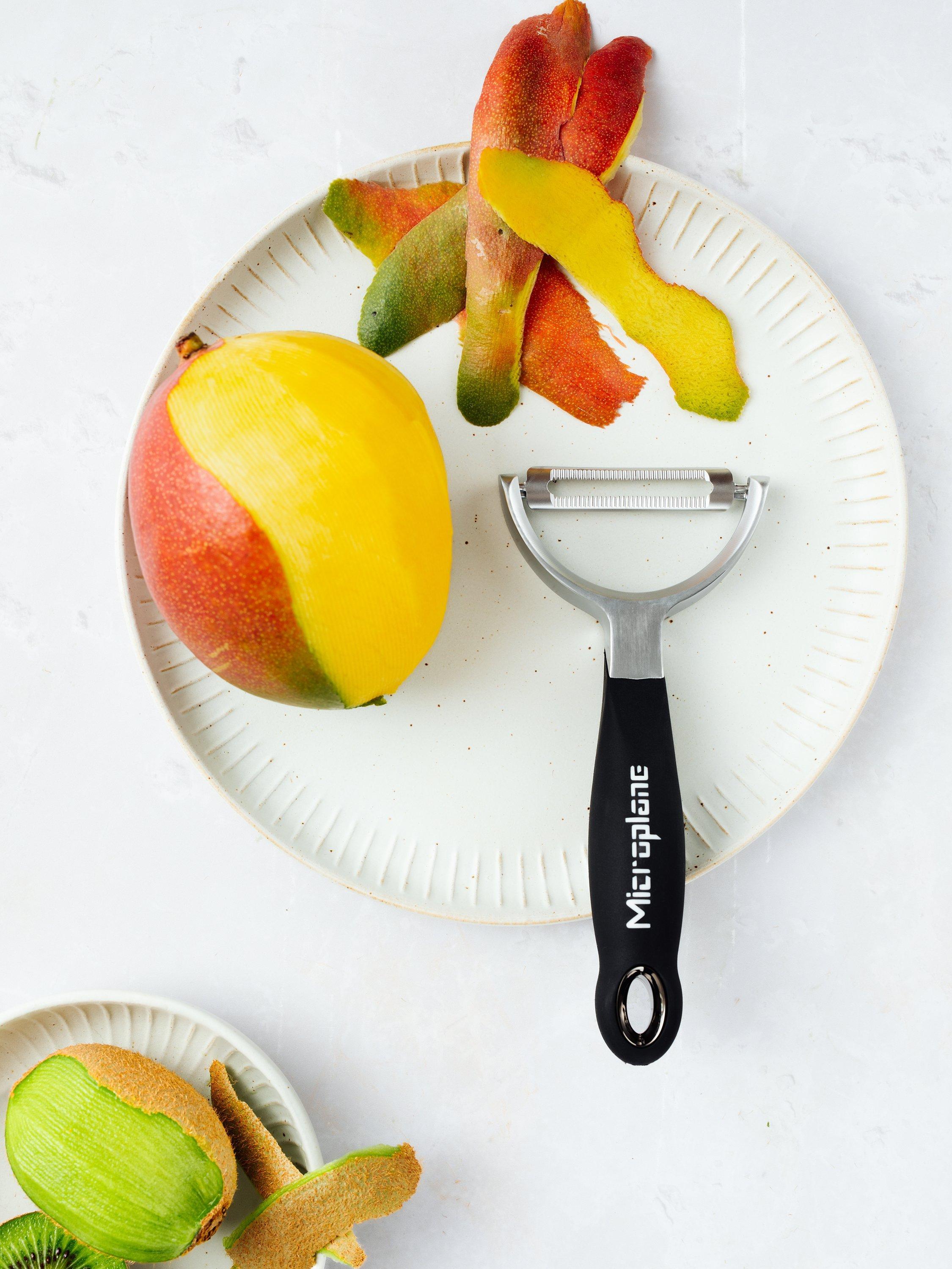 Ultra-sharp stainless steel serrated double blade for easy and smooth peeling. Ideal for a variety of fruits and vegetables especially with softer skin like tomatoes, kiwis, mangos and more. Comfortable, Y-shaped design for maximum control when peeling with an ergonomic, non-slip, soft-touch handle.