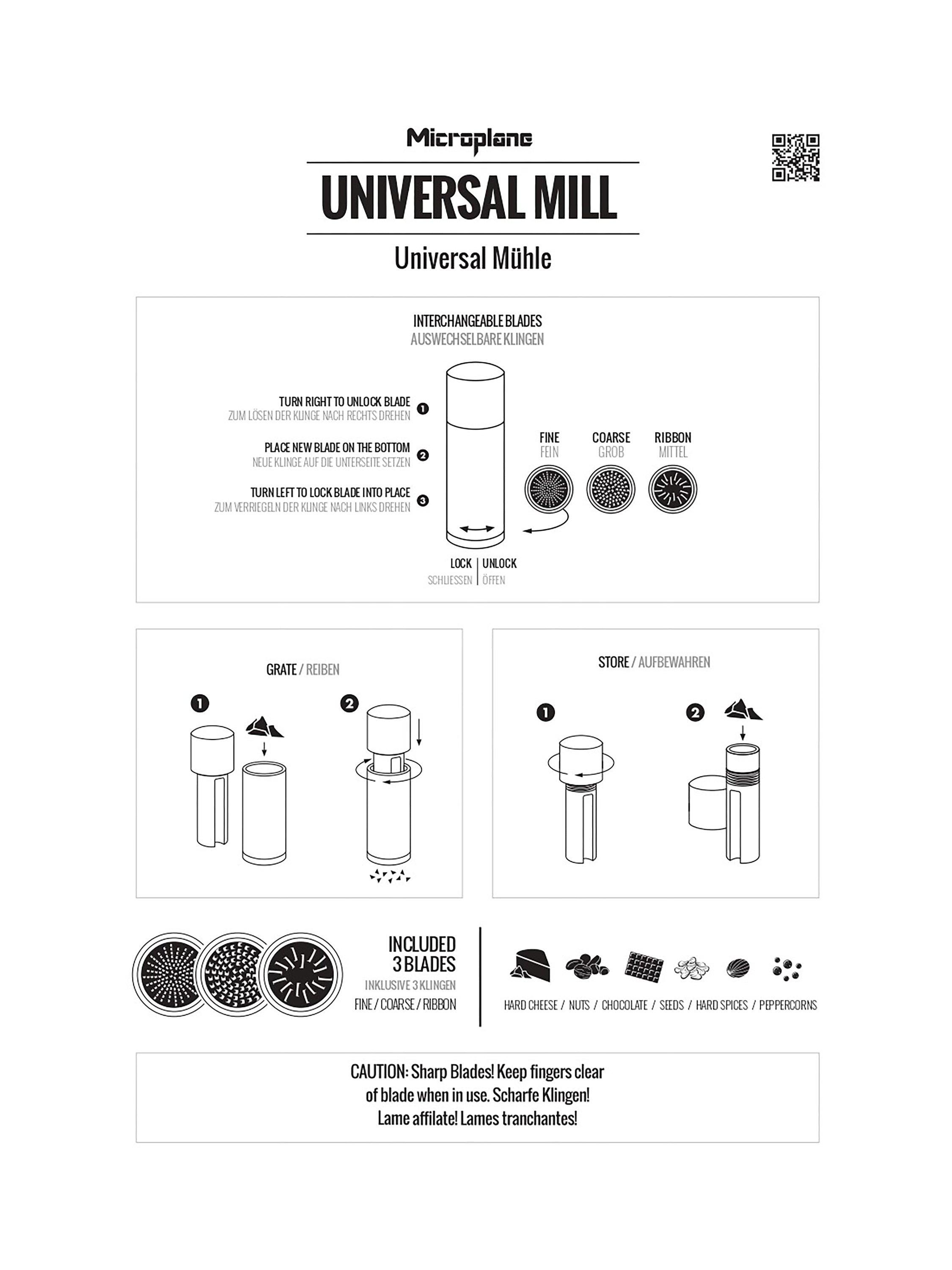 A compact and stylish design, this Microplane Universal Mill has three different interchangeable blades: fine, coarse and ribbon to grate food directly during cooking or at the table.