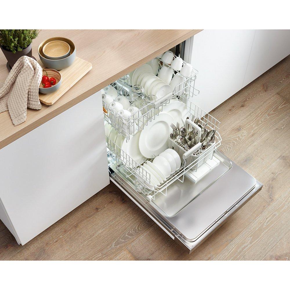 Crockery can be loaded easily and securely inside this model for optimum cleaning results. The cutlery basket fits in any position over the front spikes in the lower basket while the basket handles make loading and unloading easier. This dishwasher can easily take on all types of crockery, even large pots/pans or bulky items fit easily in the versatile lower basket. The upper basket is also easily and variably height-adjustable.