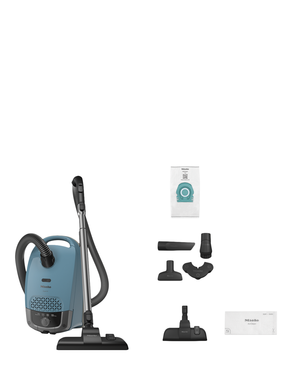 - Includes Miele AirClean filter, Miele Vario-Clip storing dusting brush, upholstery nozzle and crevice nozzle
