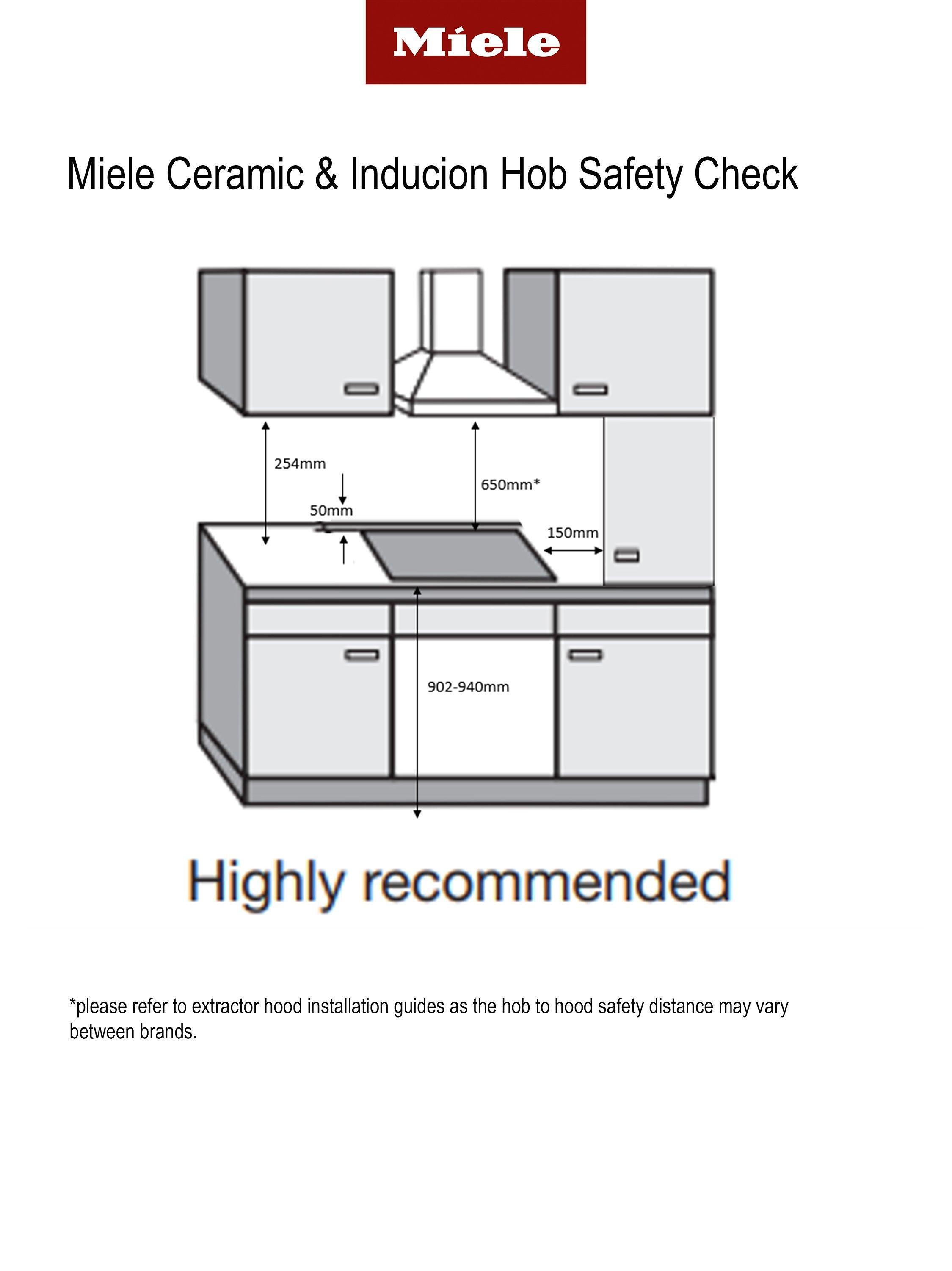 There should be a minimum height clearance of 65cm between an electric hob and the cooker hood above it. Please also only use pans suitable for induction hobs. These include enamelled steel, iron, stainless steel (depending on the alloy) and some aluminium pans with a ferromagnetic base. Glass and copper bases are unsuitable.