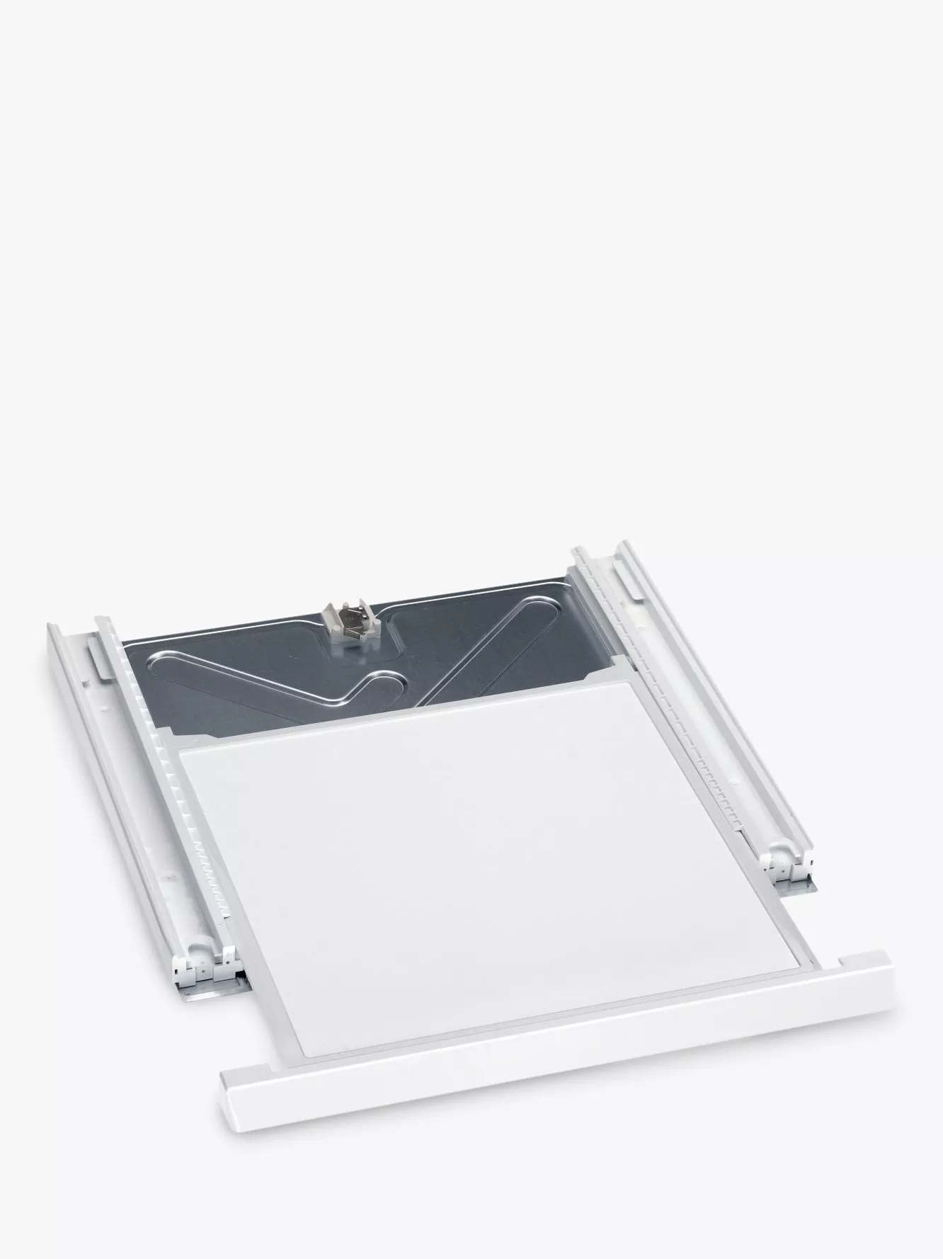 Miele WTV406 stacking kit in Lotus White, with integrated shelf . Suitable for the following Miele models: W2000 and 3000 series with straight fascia; T200 and 4000 series.