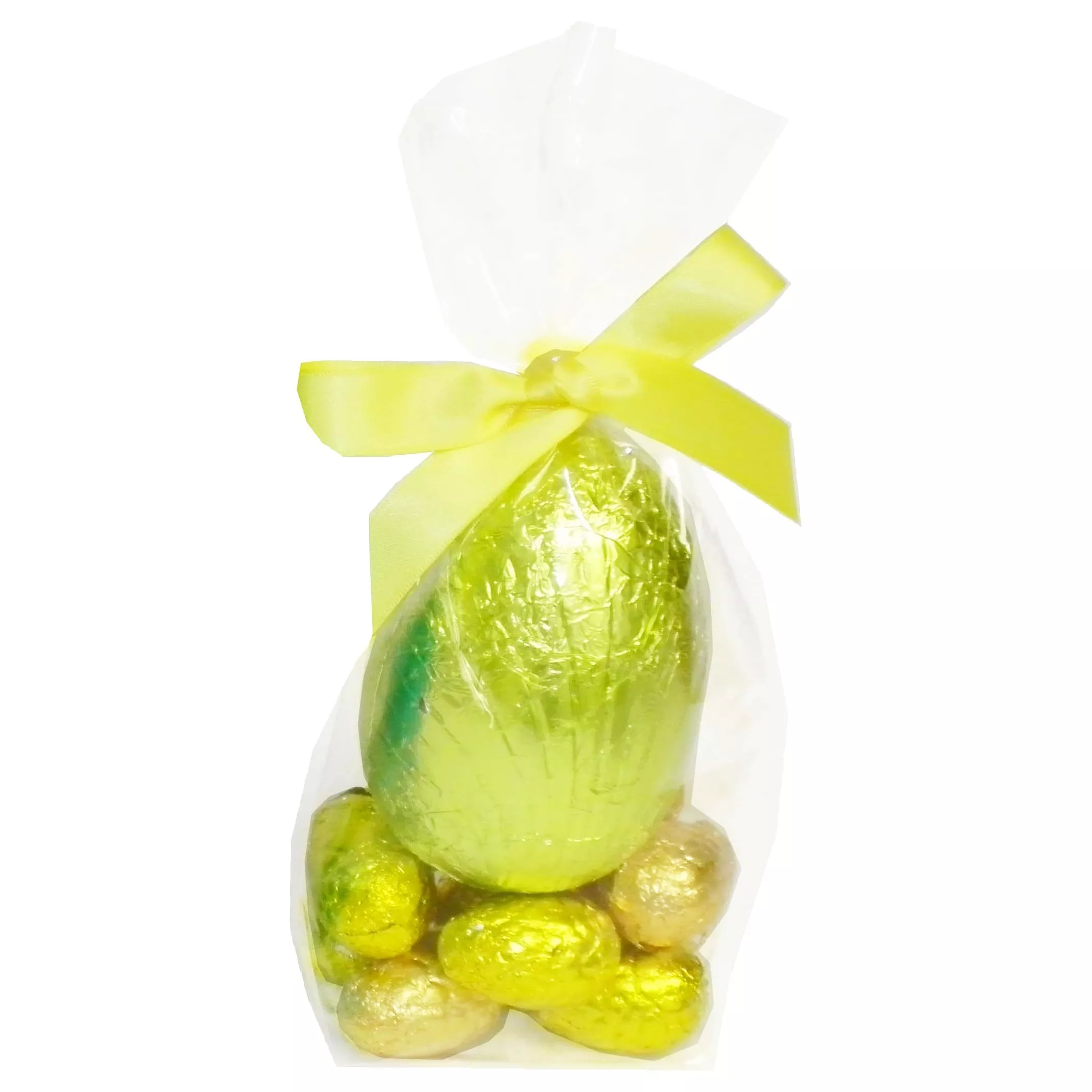 One large foil wrapped hollow milk chocolate Easter Egg sitting on a selection of foil wrapped, filled chocolate eggs in cello bag with matching bow.