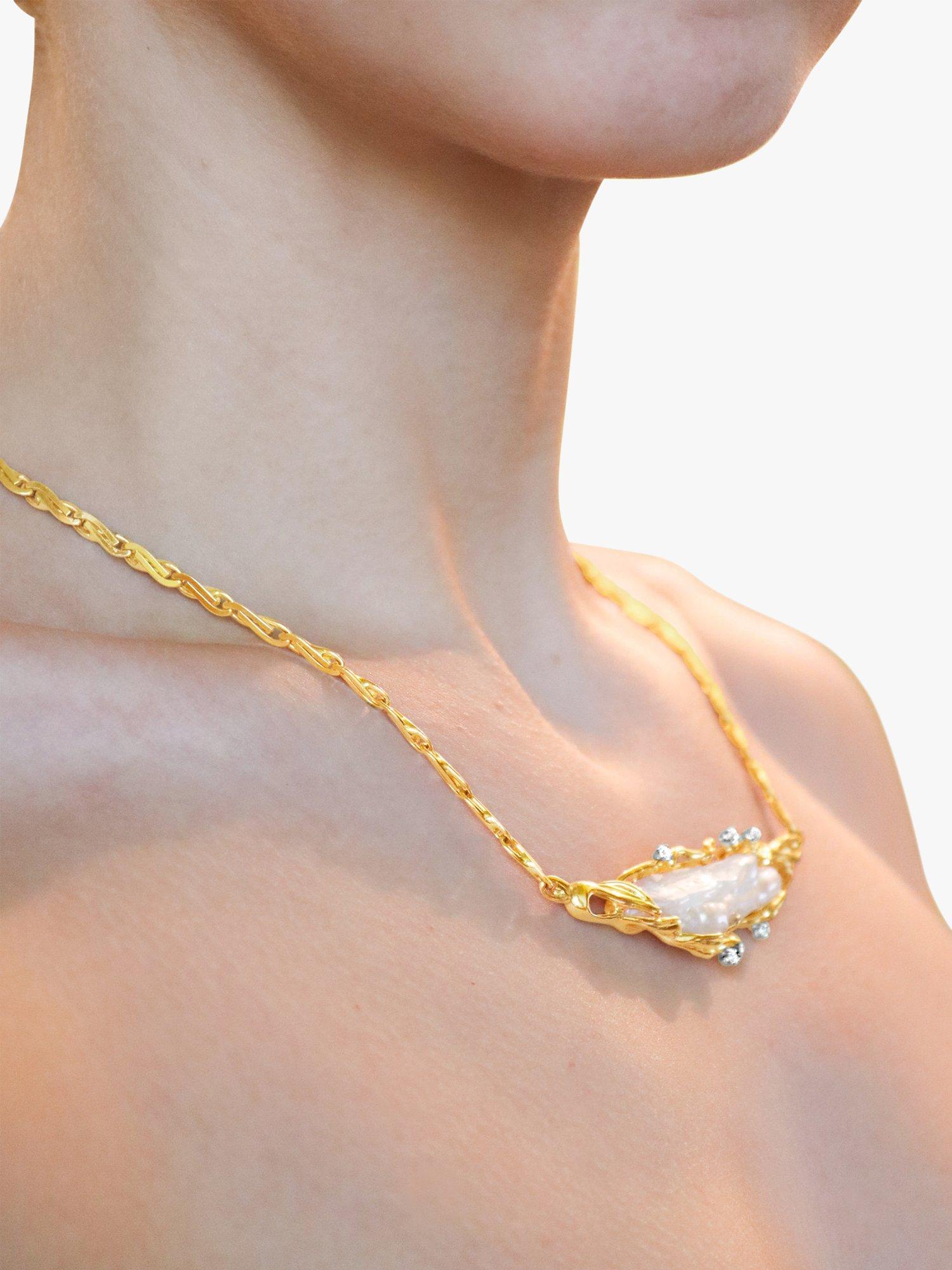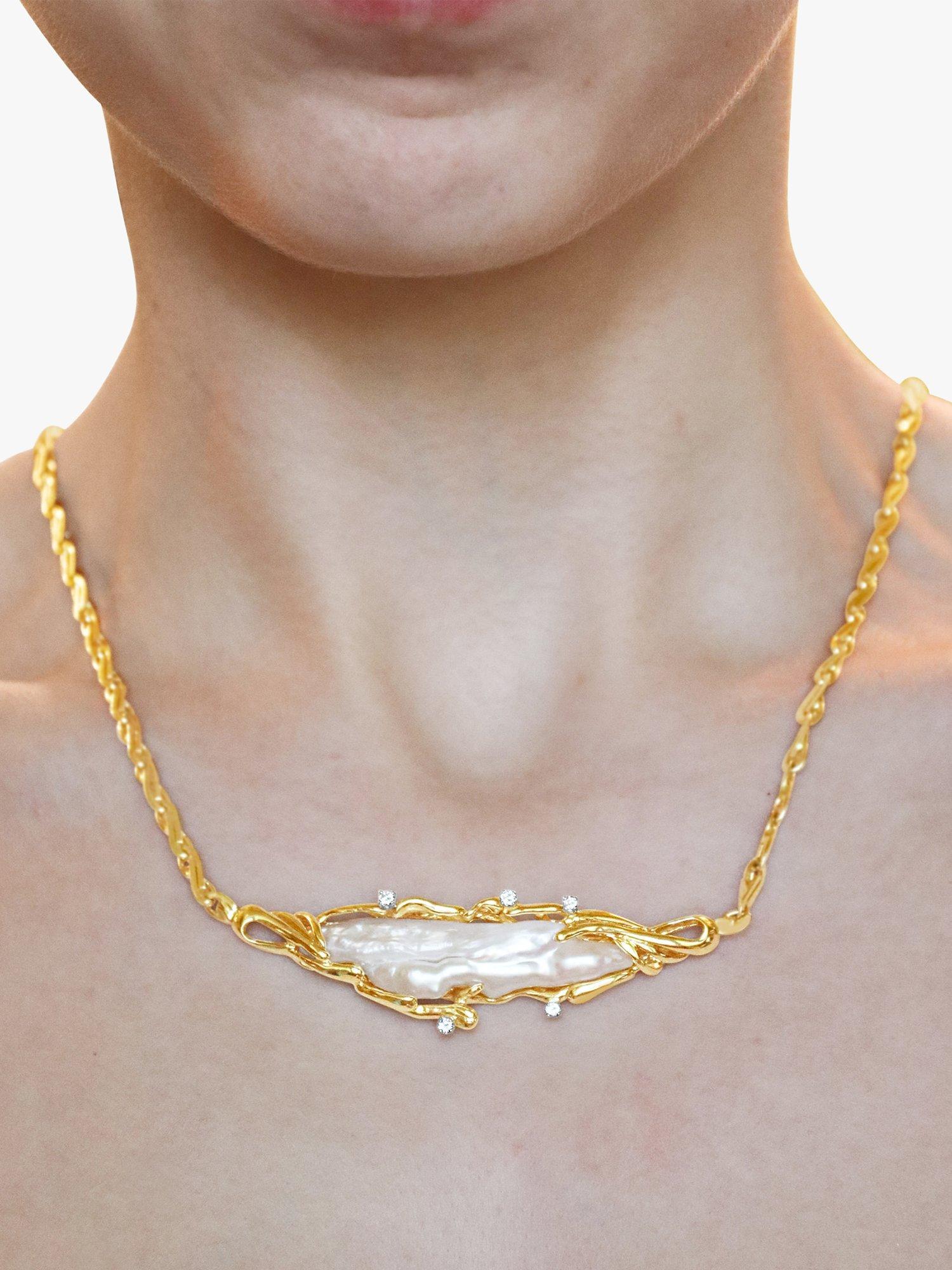 Admire the uniqueness of this centre-piece collarette, featuring a freeform baroque cultured freshwater pearl nestled within a yellow gold abstract cage-style setting. The cage is adorned with 5 round brilliant cut diamonds, each in a white 4-claw setting.