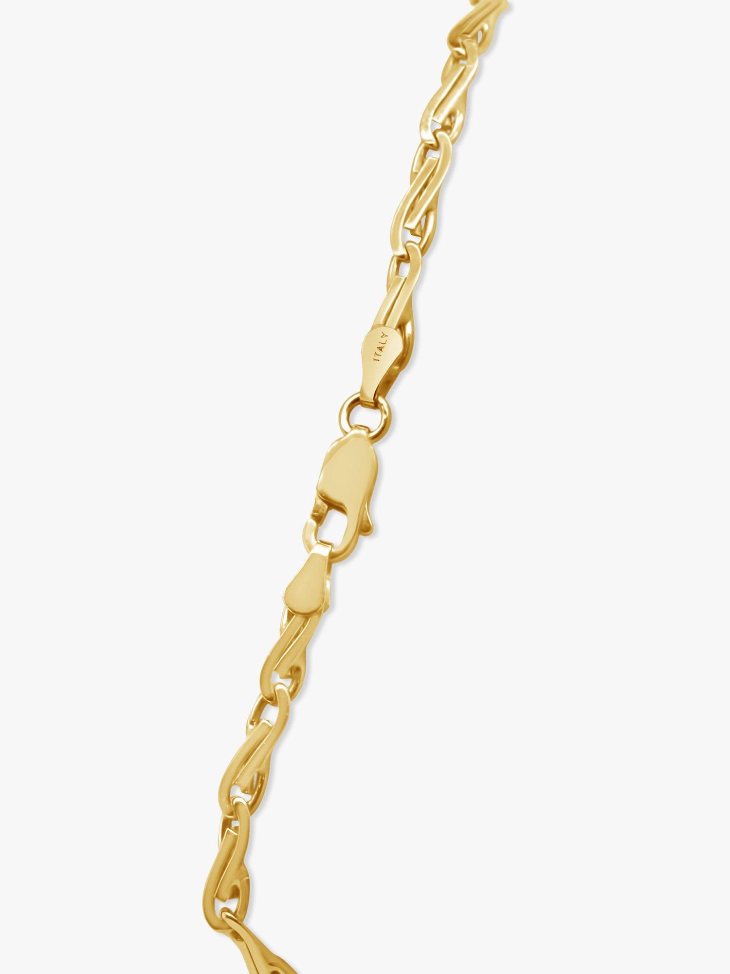The pendant is elegantly suspended from an ornate figure-8 style link chain, approximately 21" long, secured with a lever catch. All of this charm is crafted in yellow gold, bearing an Edinburgh hallmark of 14ct gold.
