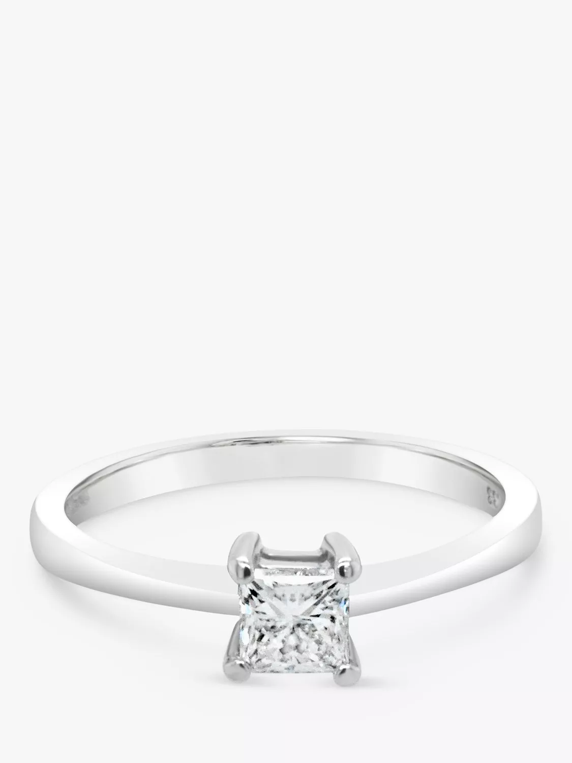 Made from solid platinum, a metal known for its quality and endurance, this ring is built to stand the test of time. With a simple but stunning design, it features a single princess-cut diamond in a 4-claw setting atop a smooth and polished shank. Hallmarked 950 platinum in London, it is a great choice for someone you love.