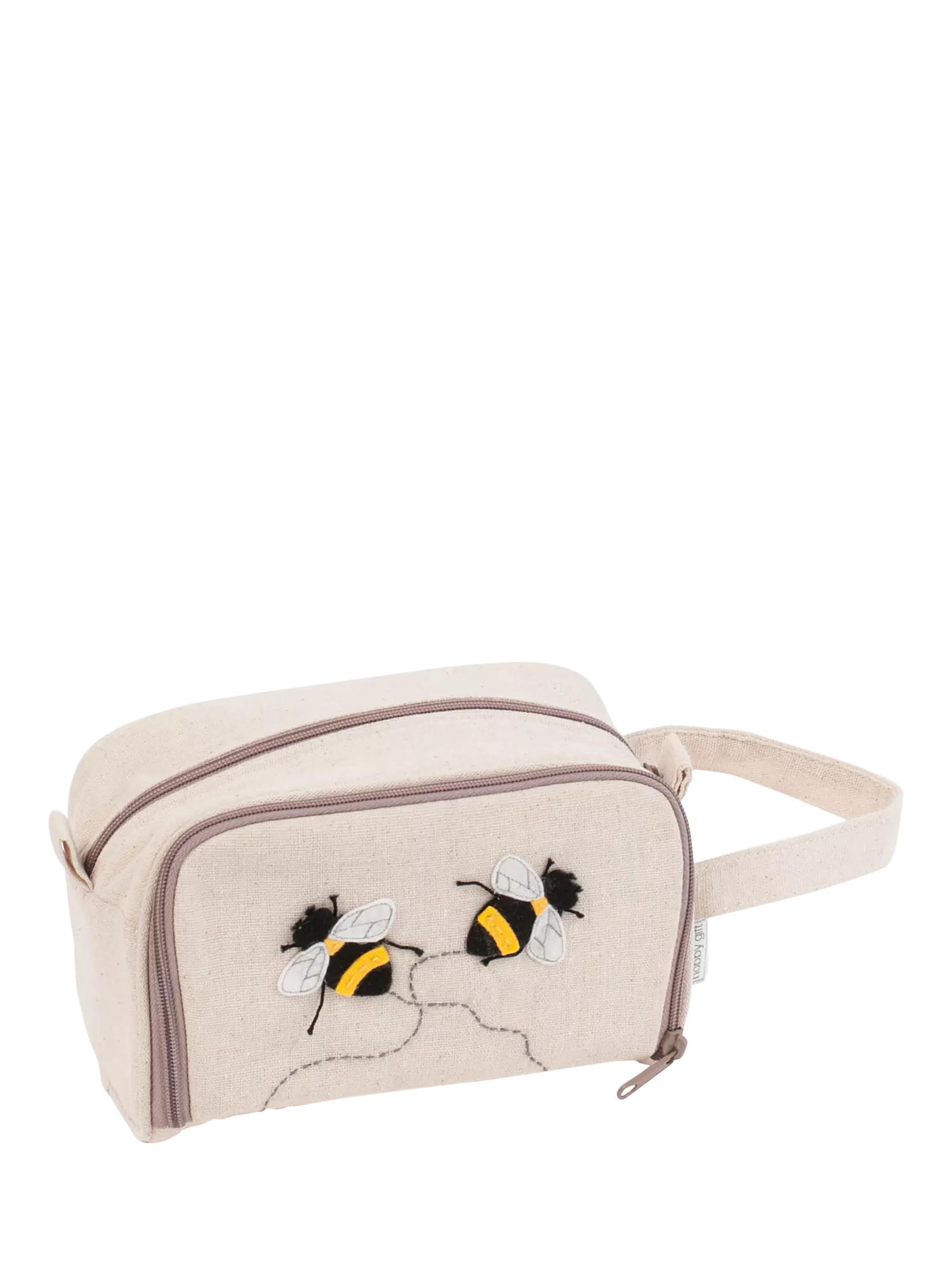 This craft bag has multiple pockets for crochet pins and is decorated with a charming embroidered bees design.