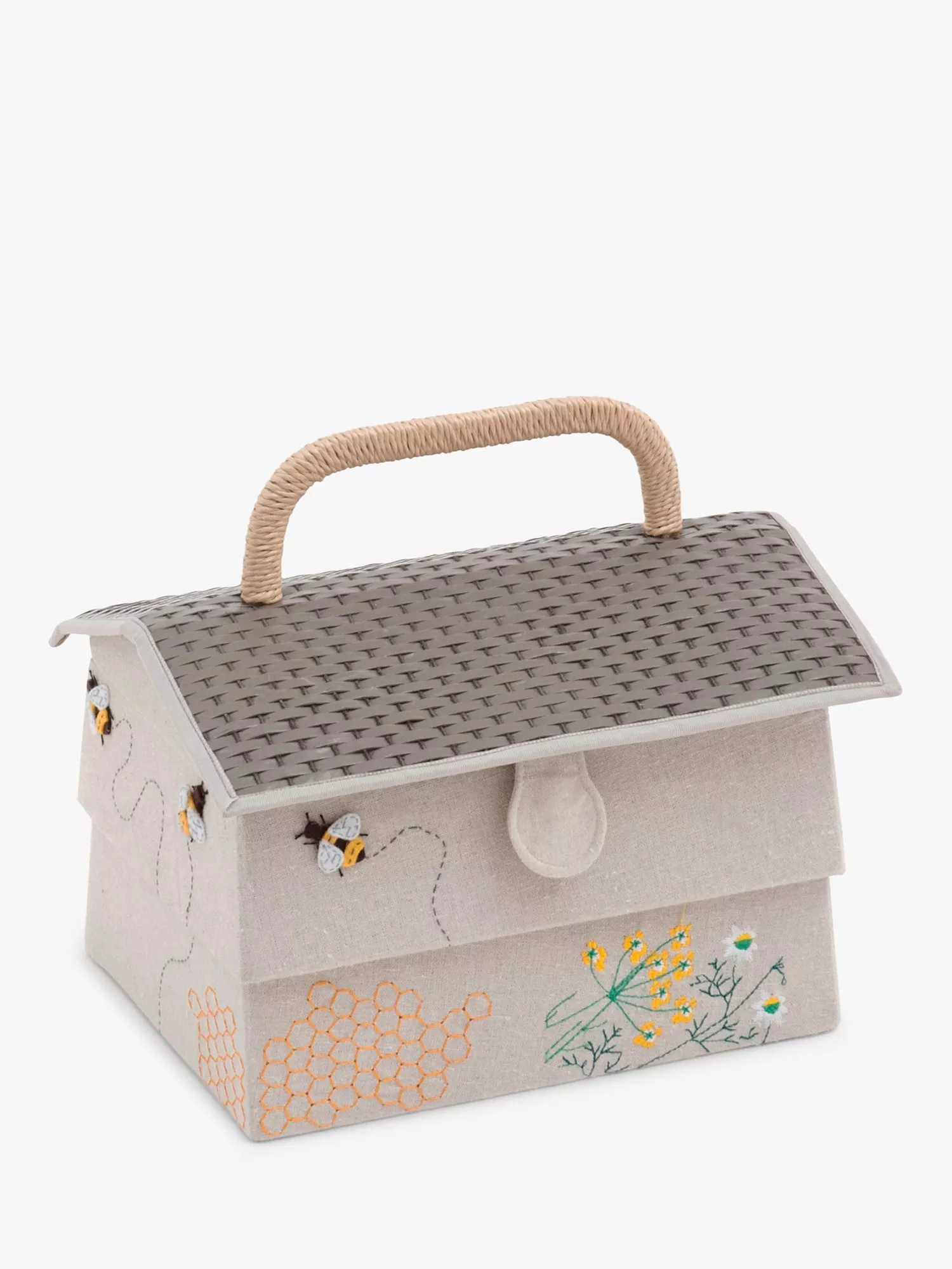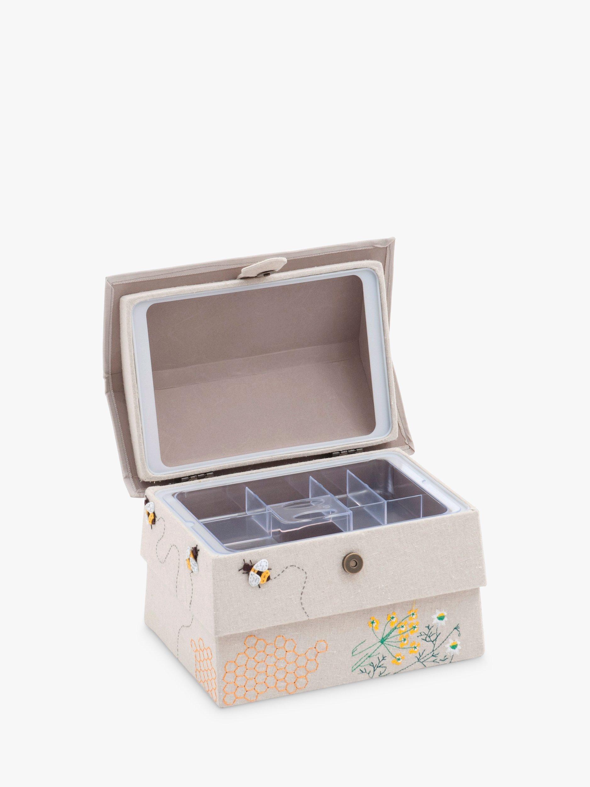 Covered in a bee inspired linen blend Lawn fabric, this rectangular Bee House sewing basket is designed with a grab handle that allows for ease of transport enabling you to sew on the go. It also has a removable plastic tray with plenty of compartment space for needles, thimbles and threads allowing you to organise your sewing kit in preparation for your next project.