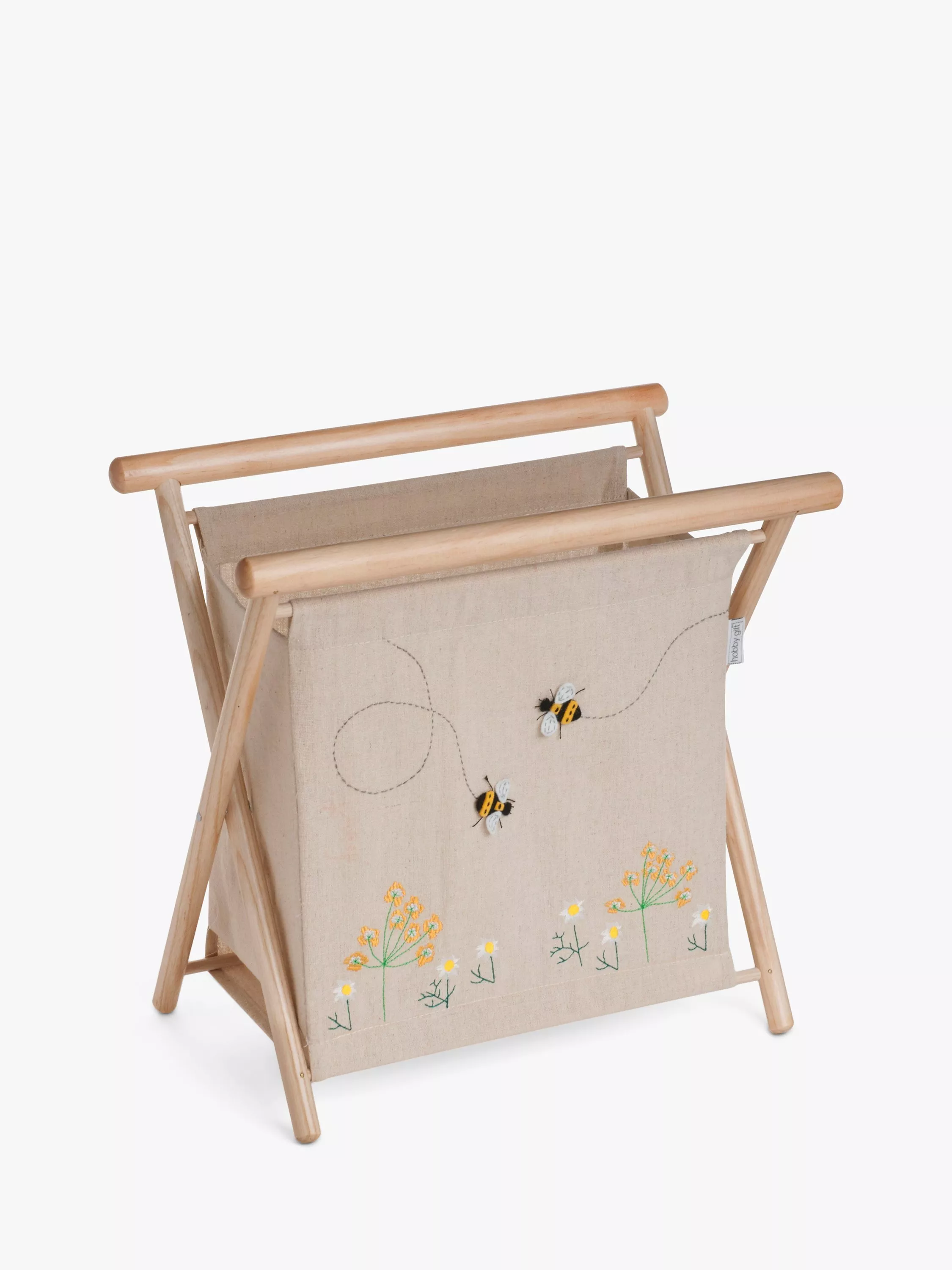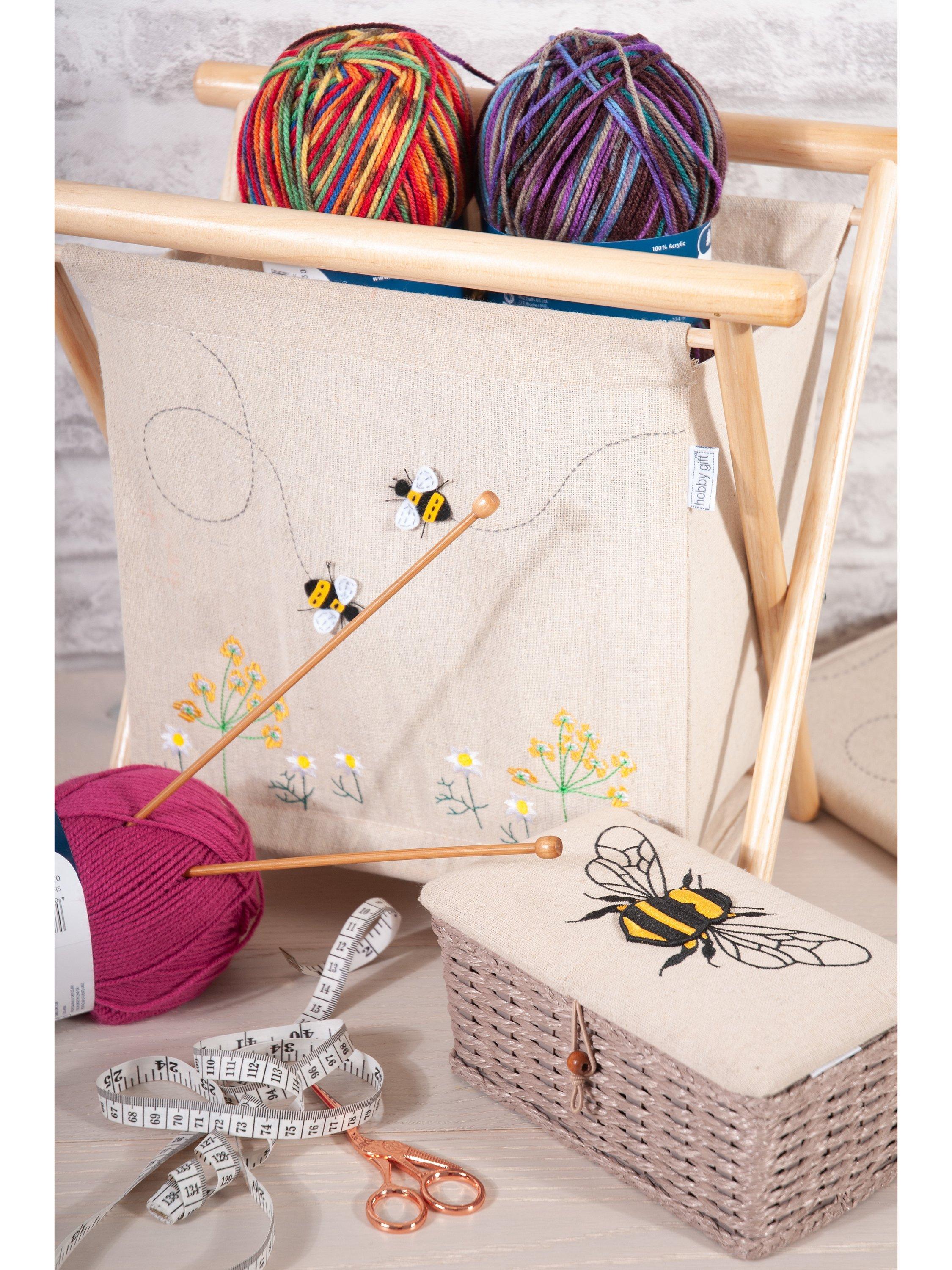 Crafted from a bee inspired linen blend Lawn fabric, this sturdy and collapsible frame features a large compartment for storing yarns and accessories.