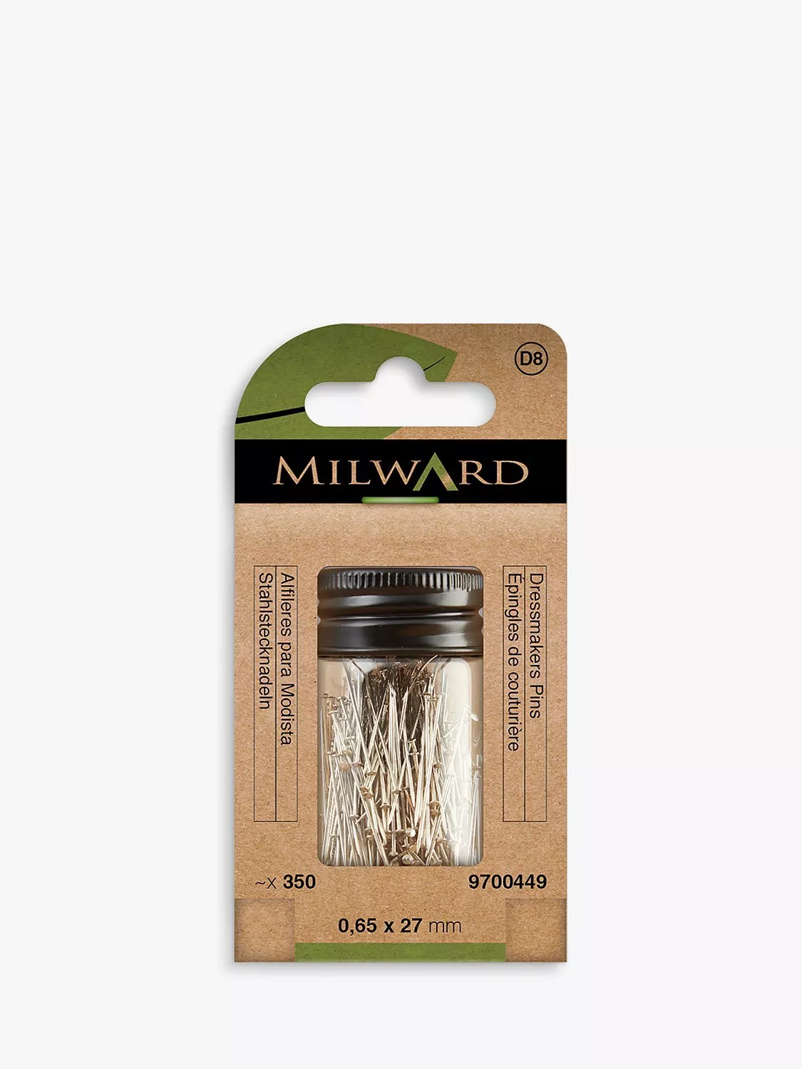 High carbon steel pins in the most popular size for dressmaking (0.65mm x 27mm). each Jar contains approximately 350 pins.
