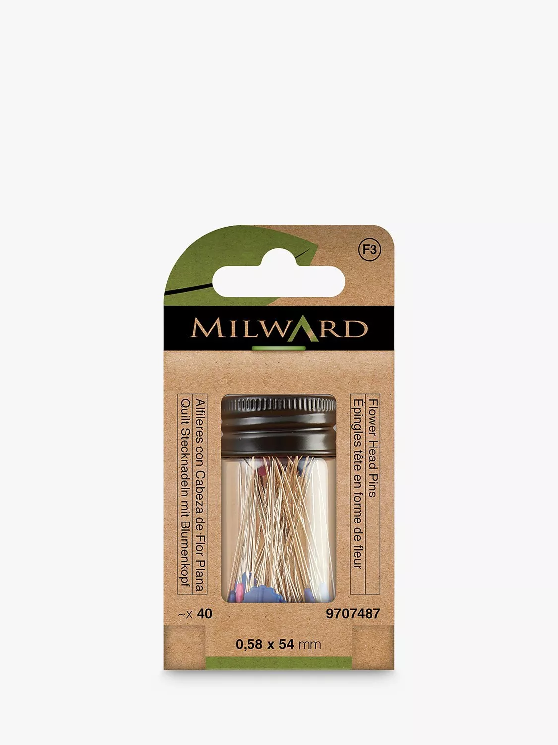 Nickel-plated steel pins with a flat flower-shaped head that can be ironed over safely. These very long, fine pins are popular for sewing, serging, pin weaving and quilting.