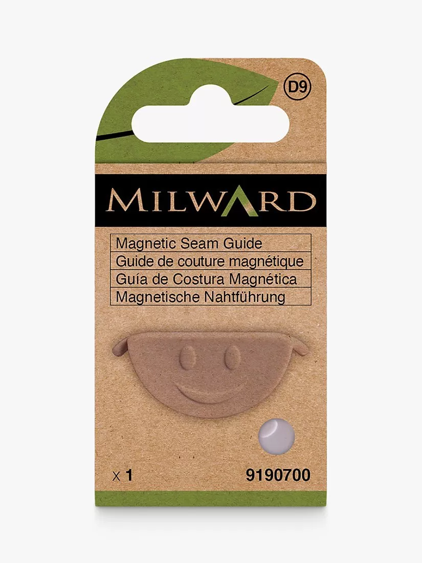 This seam guide attaches magnetically to a sewing machine's stitch/throat plate and is ideal for obtaining an accurate seam width and as a guide to straight stitching.
