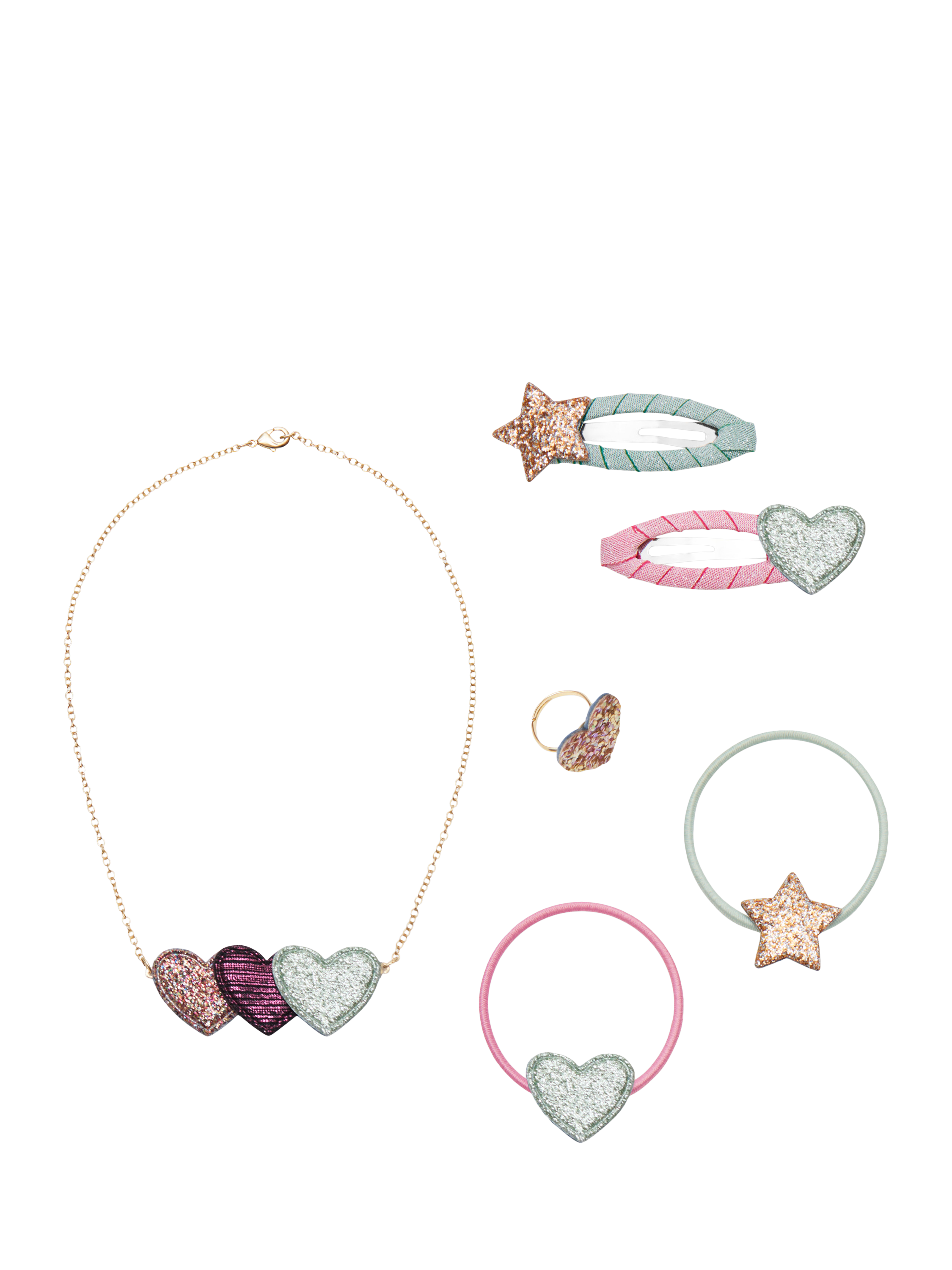 This beautifully presented gift cracker makes the perfect ready-to-go gift for accessory lovers this Christmas. Carefully packed with a necklace featuring a trio of glitter hearts, matching ring plus heart and star hair accessories, this is a gift they'll be able to enjoy all year round.