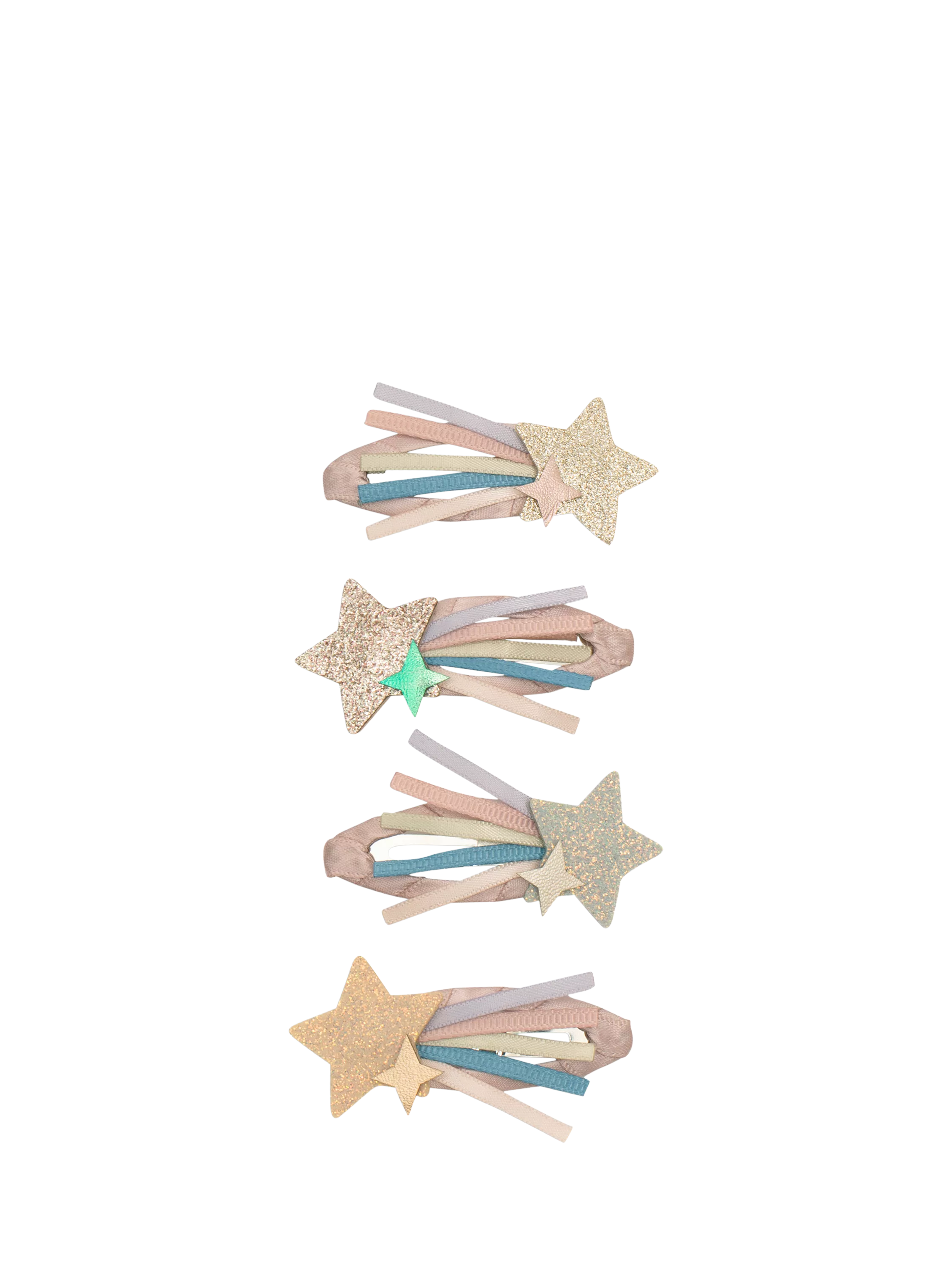Little ones will be over the moon with these super-sweet and sparkly clic-clacs hair clips, perfect for party season or simply adding some fun to ordinary days. Includes a pack of 4. Stars crafted from glitter and metallic fabrics sat atop trails of rainbow ribbons.