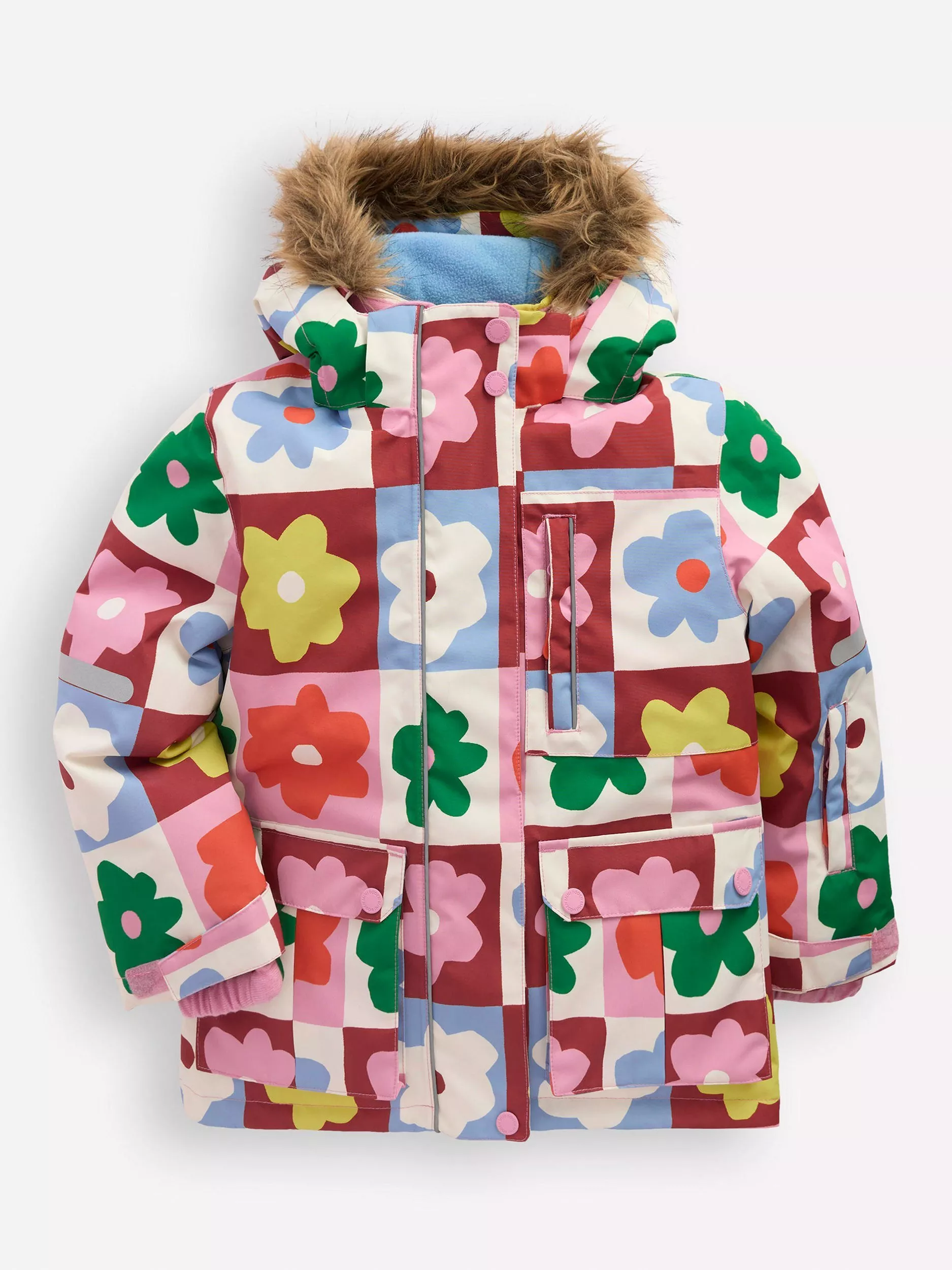 We know British weather can be unpredictable, so this waterproof coat is packed full of all-weather features. It has fully taped seams so no water can get in, cosy cuffs with a thumbhole, roomy pockets with poppers, reflective piping and a removable fur trim and hood.